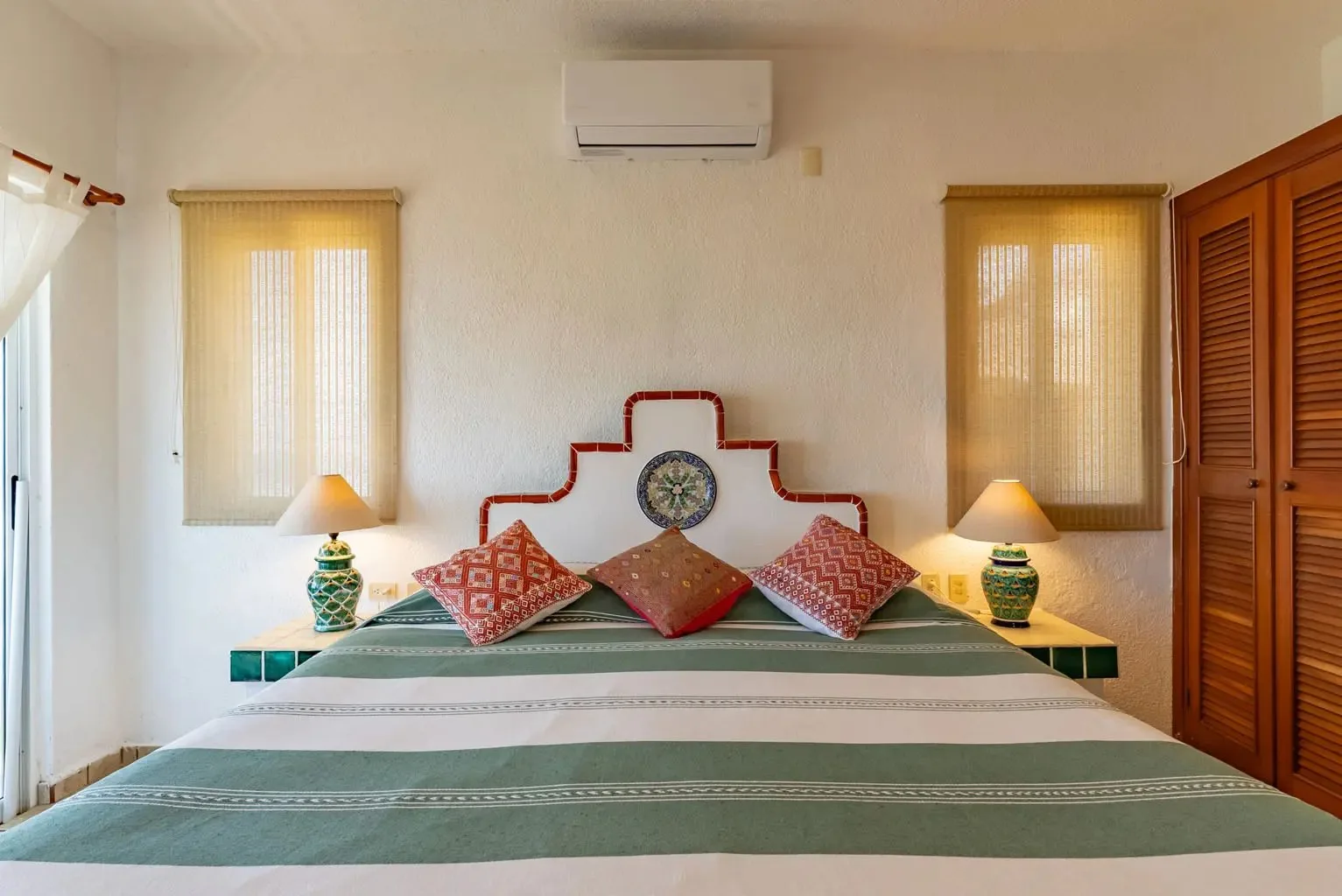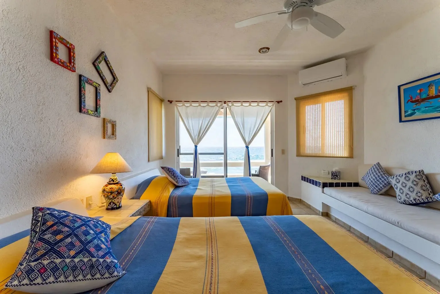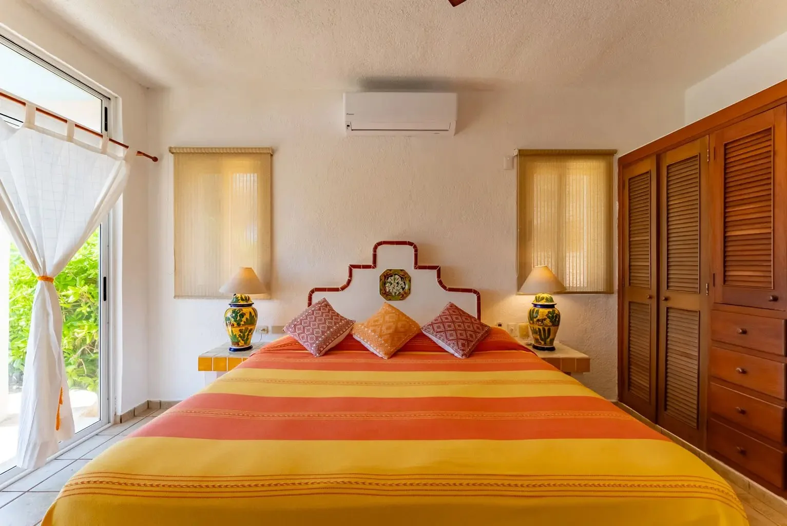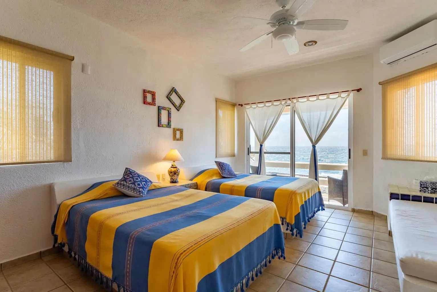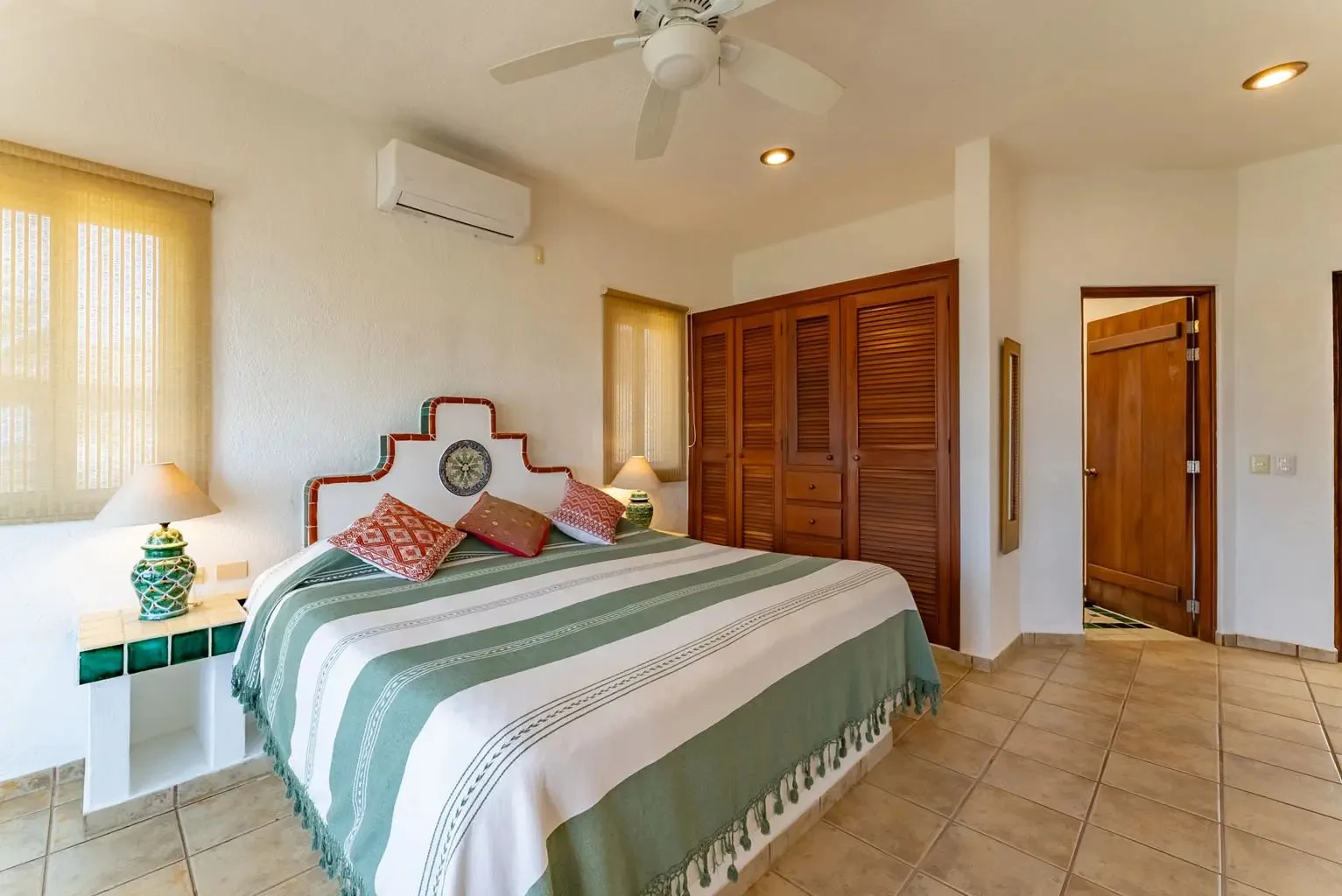 The villa is a unique creation designed and built by a noted Mexican-Yucatecan architect and visual artist. Casa Dos Palmas is an exceptional combination of Mayan architecture, featuring a three-story, handcrafted Mayan dome (a brick cupula) and original Talavera tiles in an authentic hacienda style. The furniture is handcrafted, and there are mahogany closets. Original art and murals are another highlight, as the house retains its two original commissioned murals. The property offers unparalleled 180-degree ocean and sunrise views with jungle surroundings by the pool. A locked owner's cabinet serves as a snack and liquor cabinet. Bedrooms include safes for securing personal items.