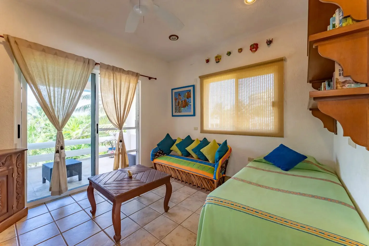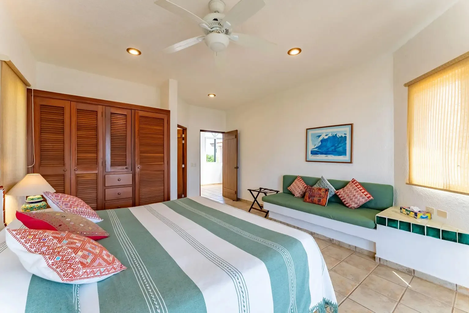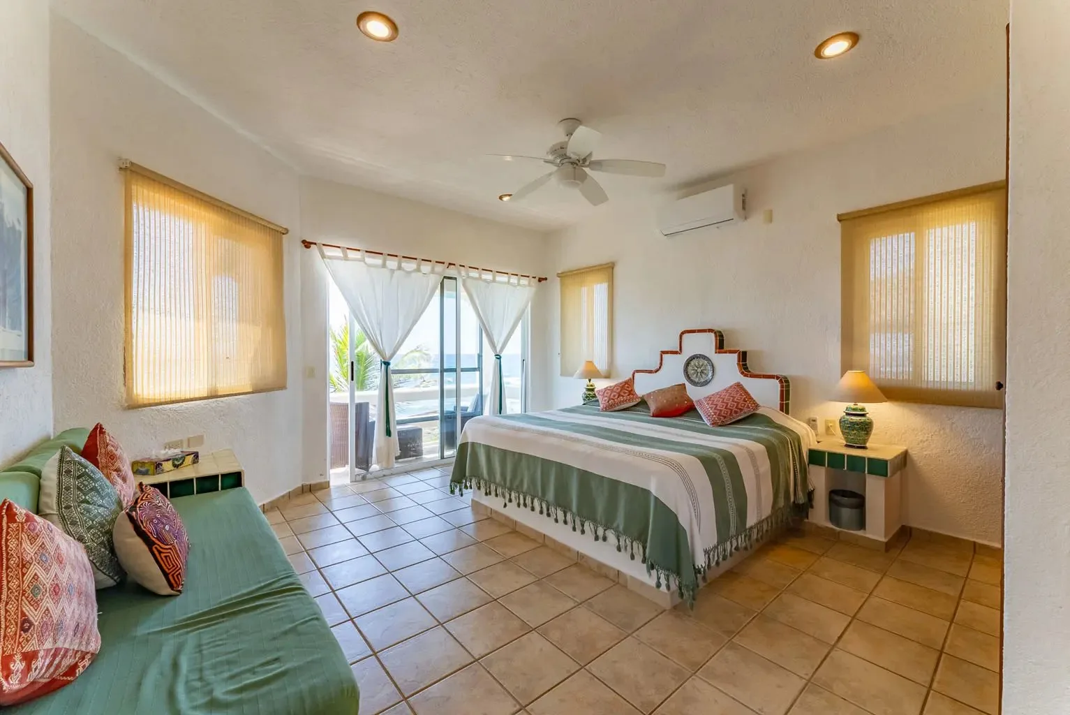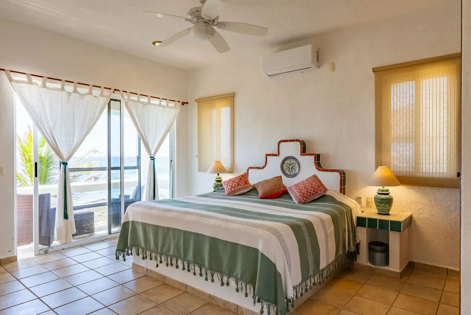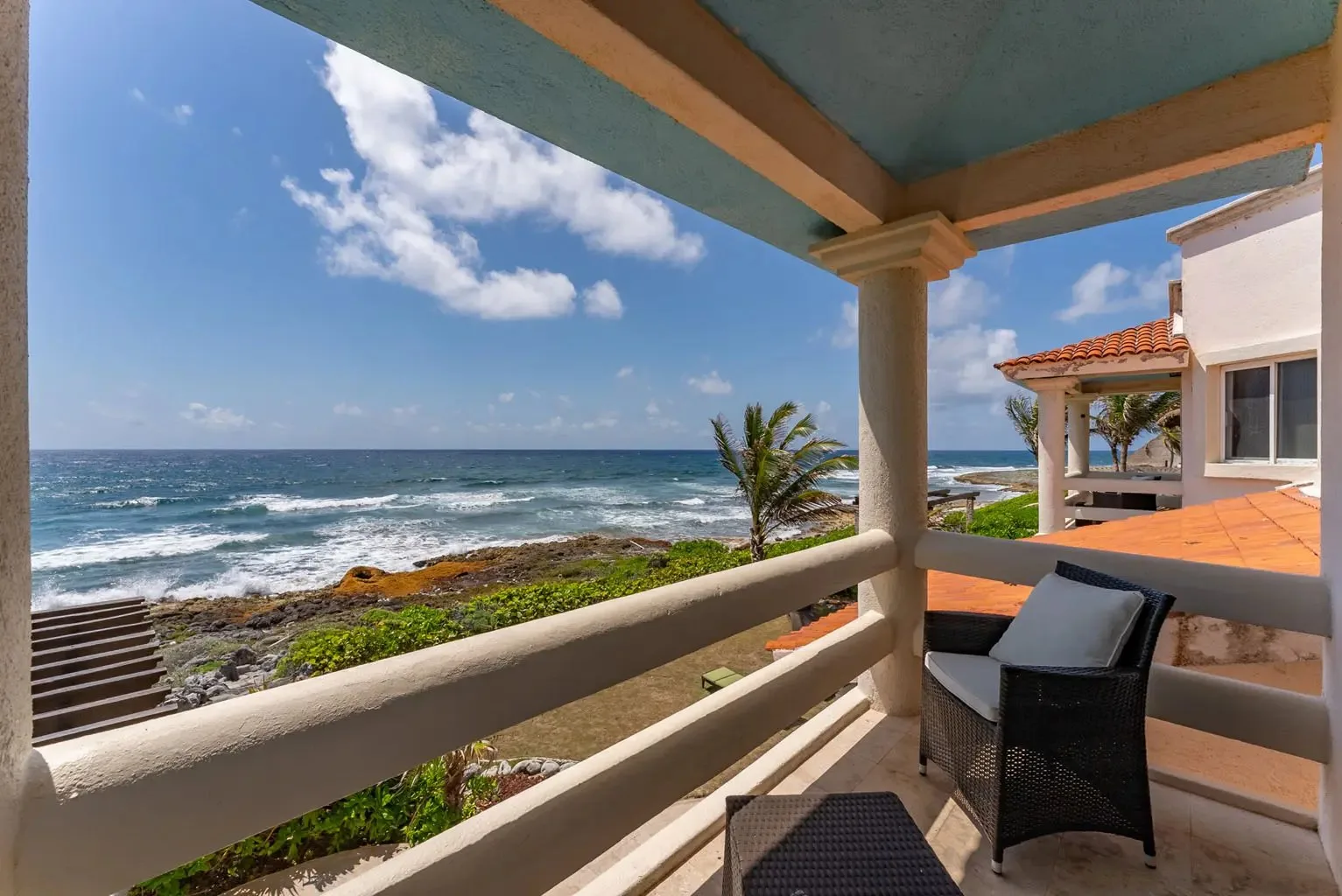 This property offers guests stunning views of the Caribbean Sea from its large oceanfront living areas. Tastefully decorated with vibrant Mexican textile details, the villa is filled with natural sunlight. The poolside terrace and garden provide a perfect spot for a refreshing swim, shaded under a covered terrace that leads to the home's kitchen. Four main bedrooms offer beautiful ocean views, while a fifth bedroom facing the jungle also serves as a closed entertainment room.
