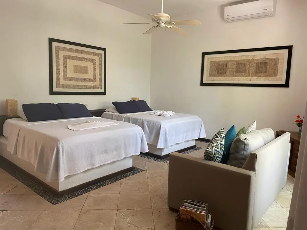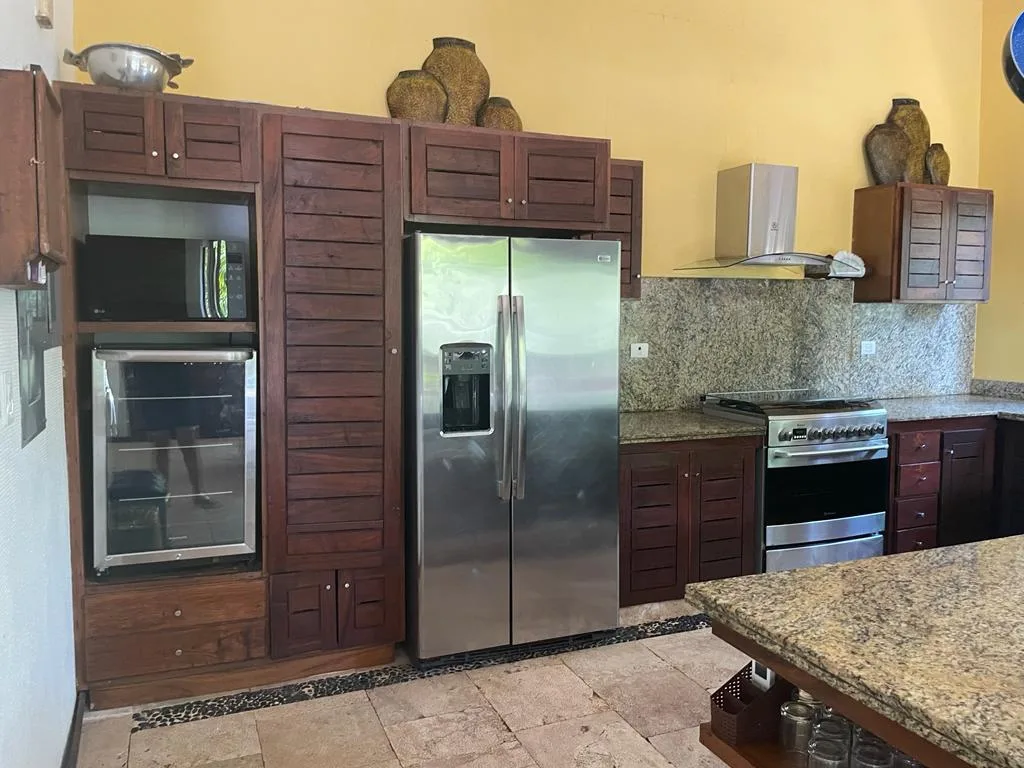 The interior provides over 400 square meters of space, featuring spacious social areas, a gourmet kitchen, a double-height living room, four en-suite bedrooms, a service bathroom, and a sauna. Outdoor amenities include a pool with a terrace and an open palapa for events or relaxation.