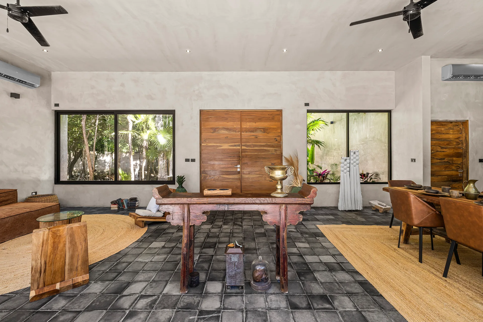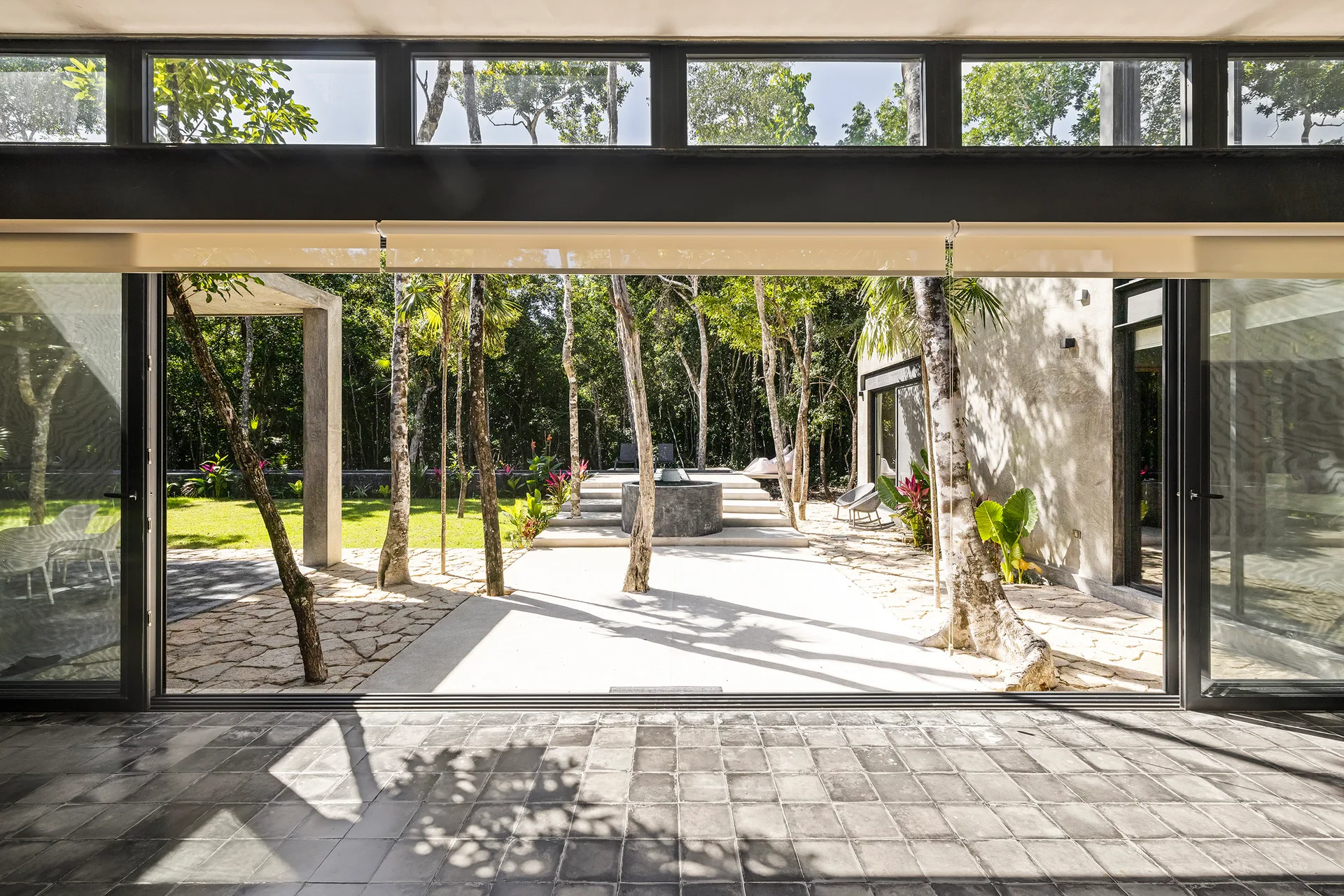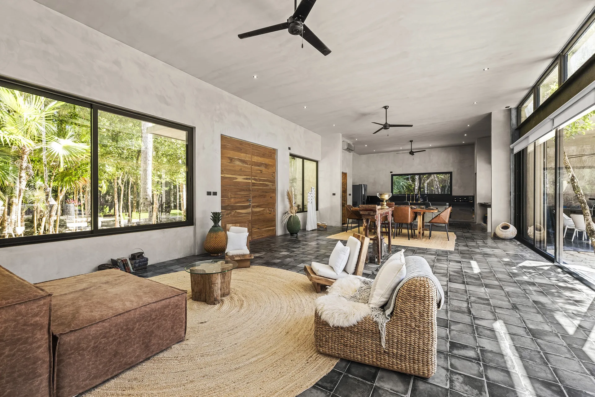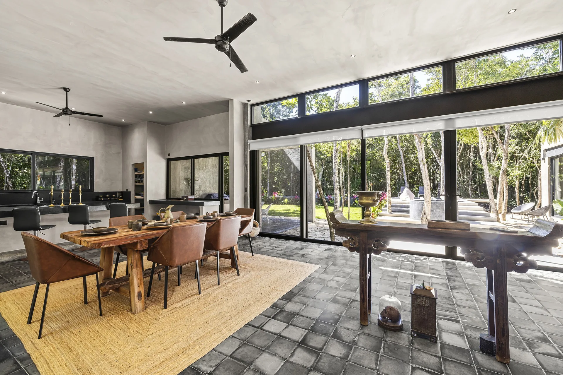 Upon entering through the massive wooden front doors, an open-concept living and dining area with cathedral ceilings serves as a central hub. The main living room seamlessly integrates with the outdoor living space via floor-to-ceiling sliding windows. The exterior patio features a covered outdoor living area with a pass-through bar to the kitchen and an outdoor sink beneath a large ceiling fan, overlooking a conversation area. This space can be screened in or enclosed with flowing outdoor curtains.