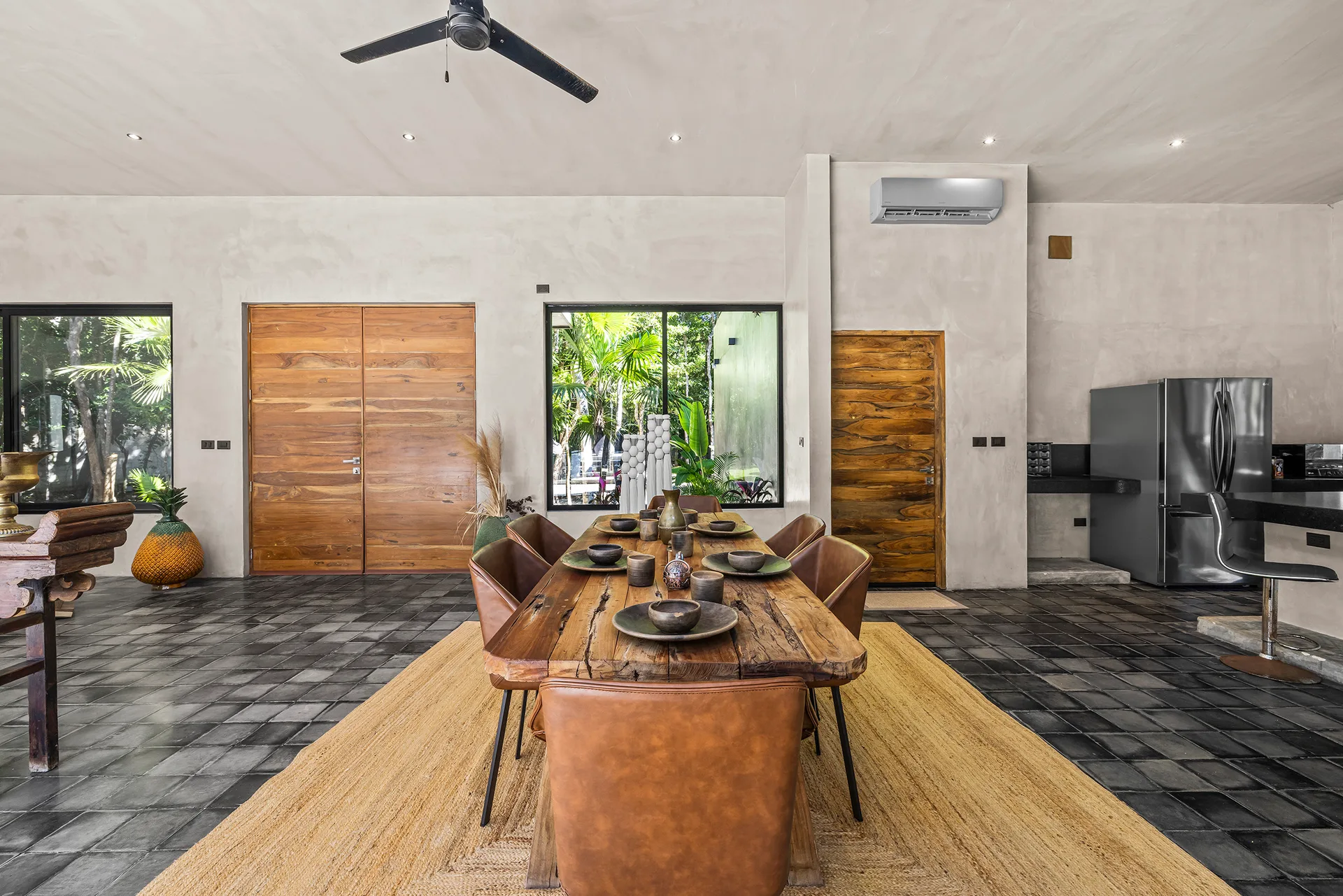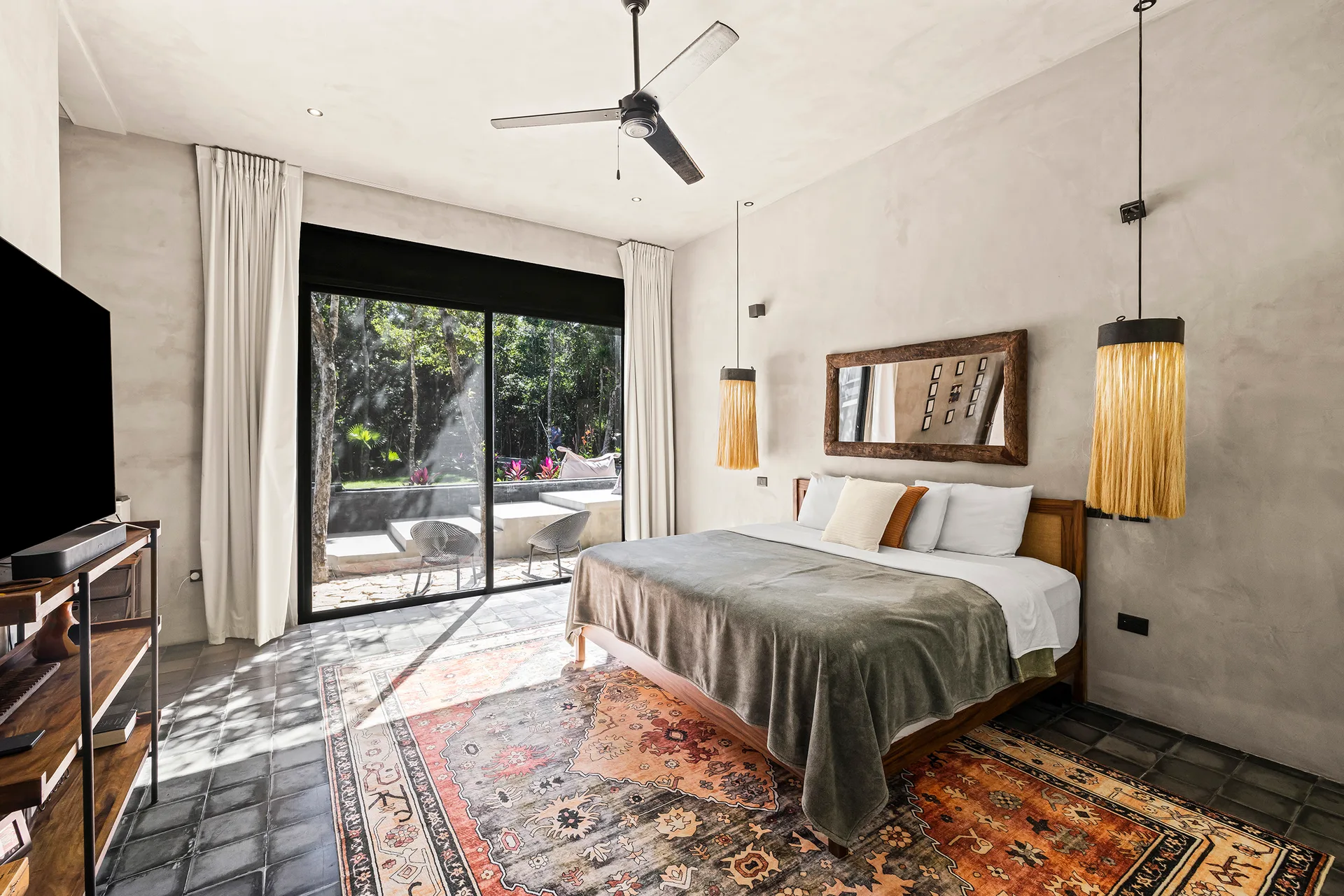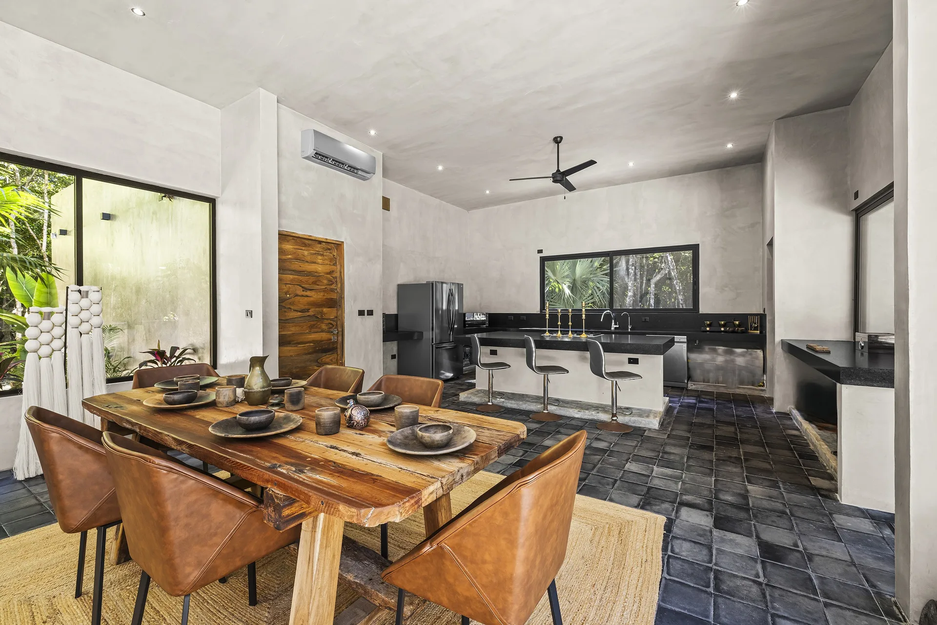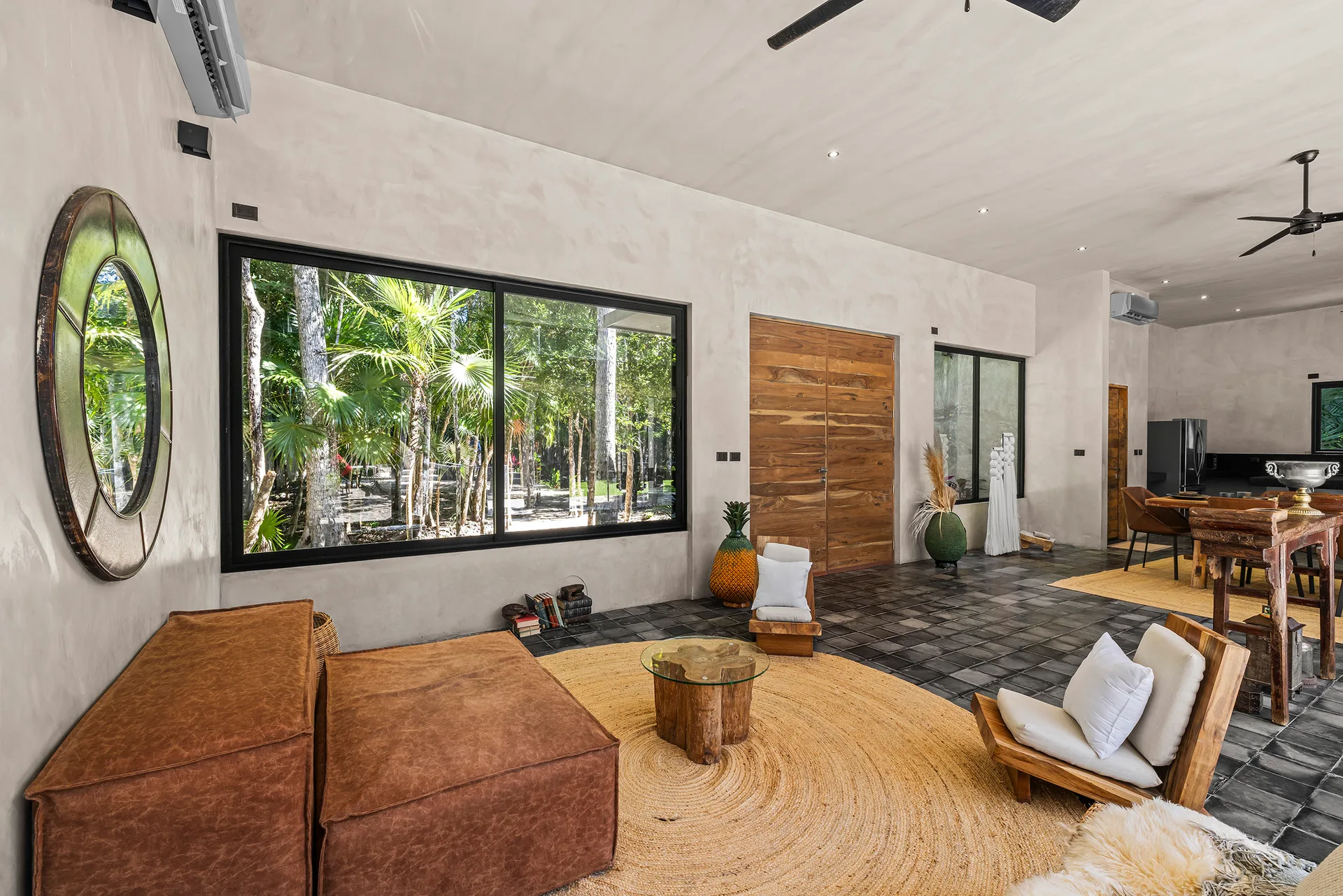 Upon entering through the massive wooden front doors, an open-concept living and dining area with cathedral ceilings serves as a central hub. The main living room seamlessly integrates with the outdoor living space via floor-to-ceiling sliding windows. The exterior patio features a covered outdoor living area with a pass-through bar to the kitchen and an outdoor sink beneath a large ceiling fan, overlooking a conversation area. This space can be screened in or enclosed with flowing outdoor curtains.