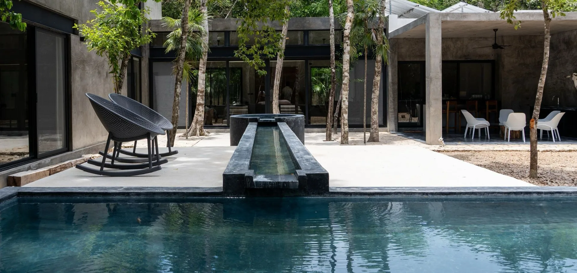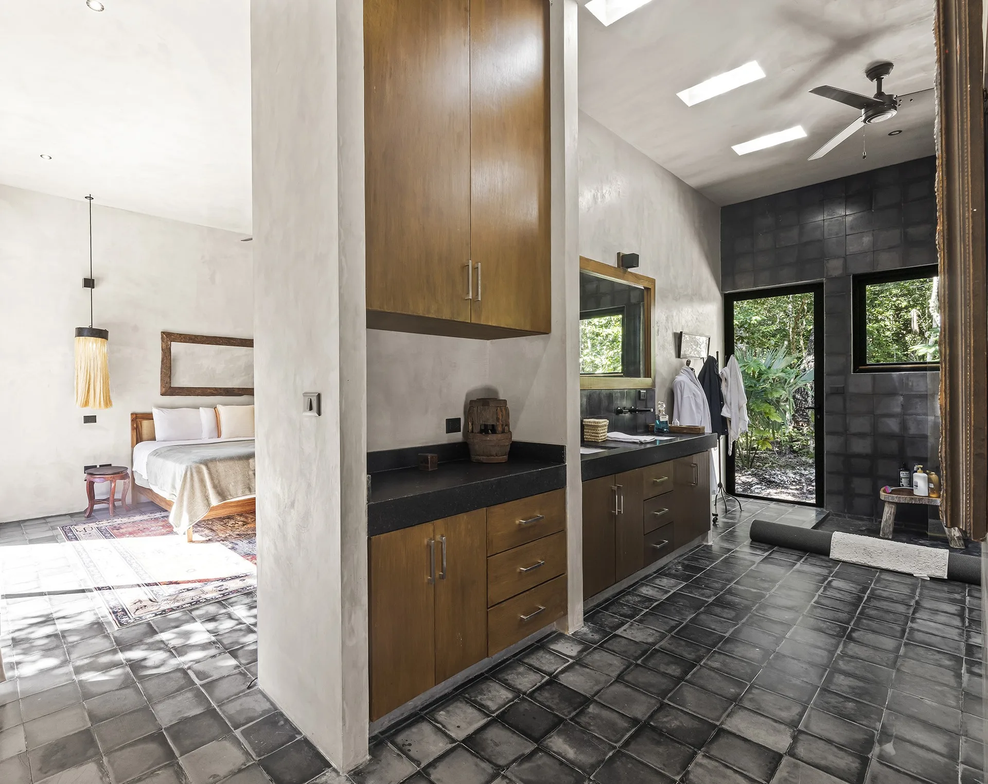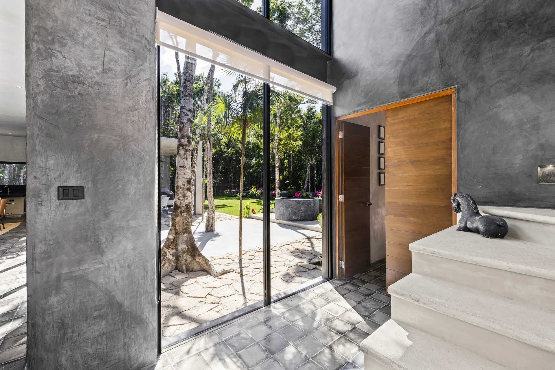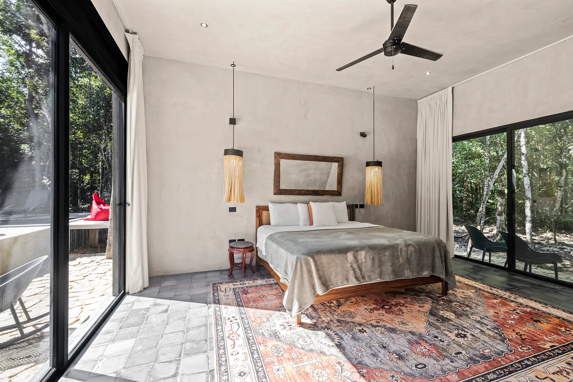 Upon entering through the massive wooden front doors, an open-concept living and dining area with cathedral ceilings serves as a central hub. The main living room seamlessly integrates with the outdoor living space via floor-to-ceiling sliding windows. The exterior patio features a covered outdoor living area with a pass-through bar to the kitchen and an outdoor sink beneath a large ceiling fan, overlooking a conversation area. This space can be screened in or enclosed with flowing outdoor curtains.