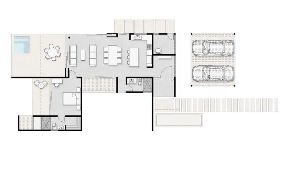 The homes are available in two-, three-, and four-bedroom configurations. They feature a spacious open concept layout with floor-to-ceiling windows. Each residence includes a full kitchen, a living room and dining area, and a back patio with a private pool and garden. Finishes include tile floors, ceiling fans, and air conditioning. The homes are sold unfurnished.