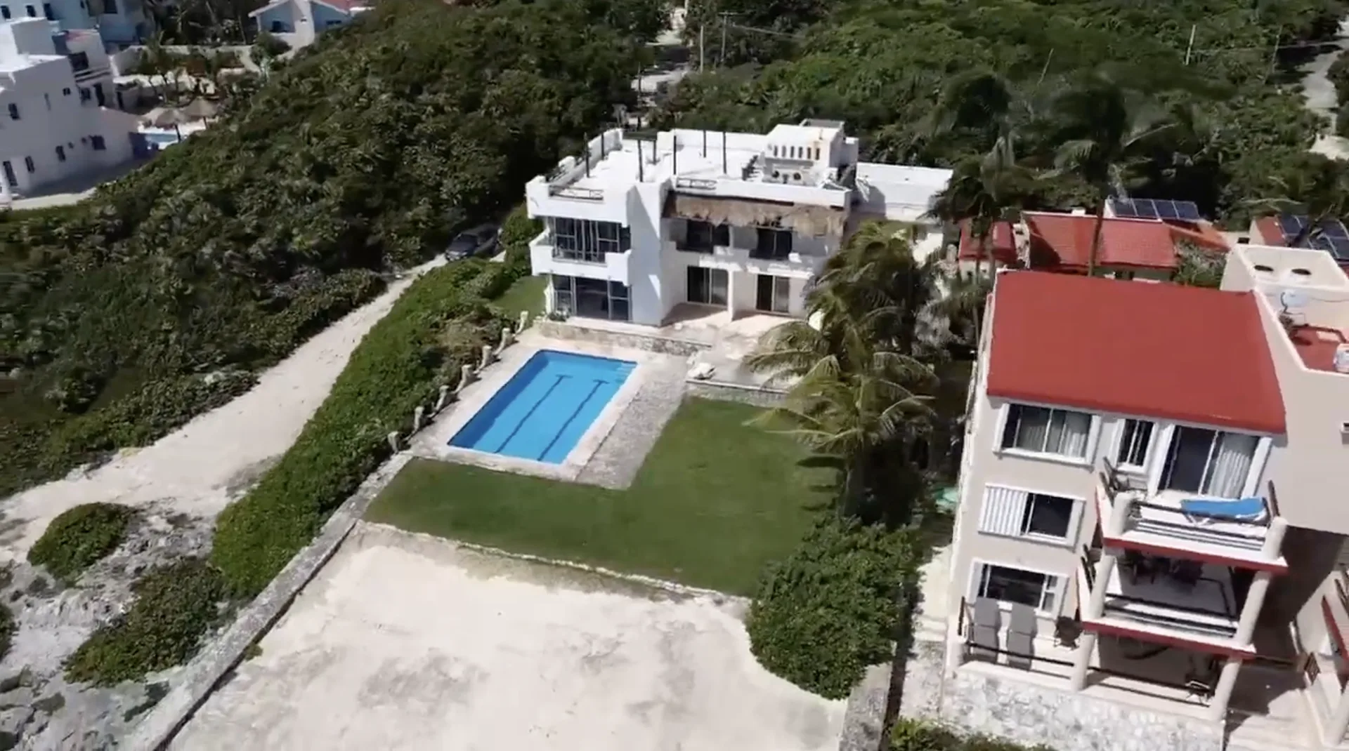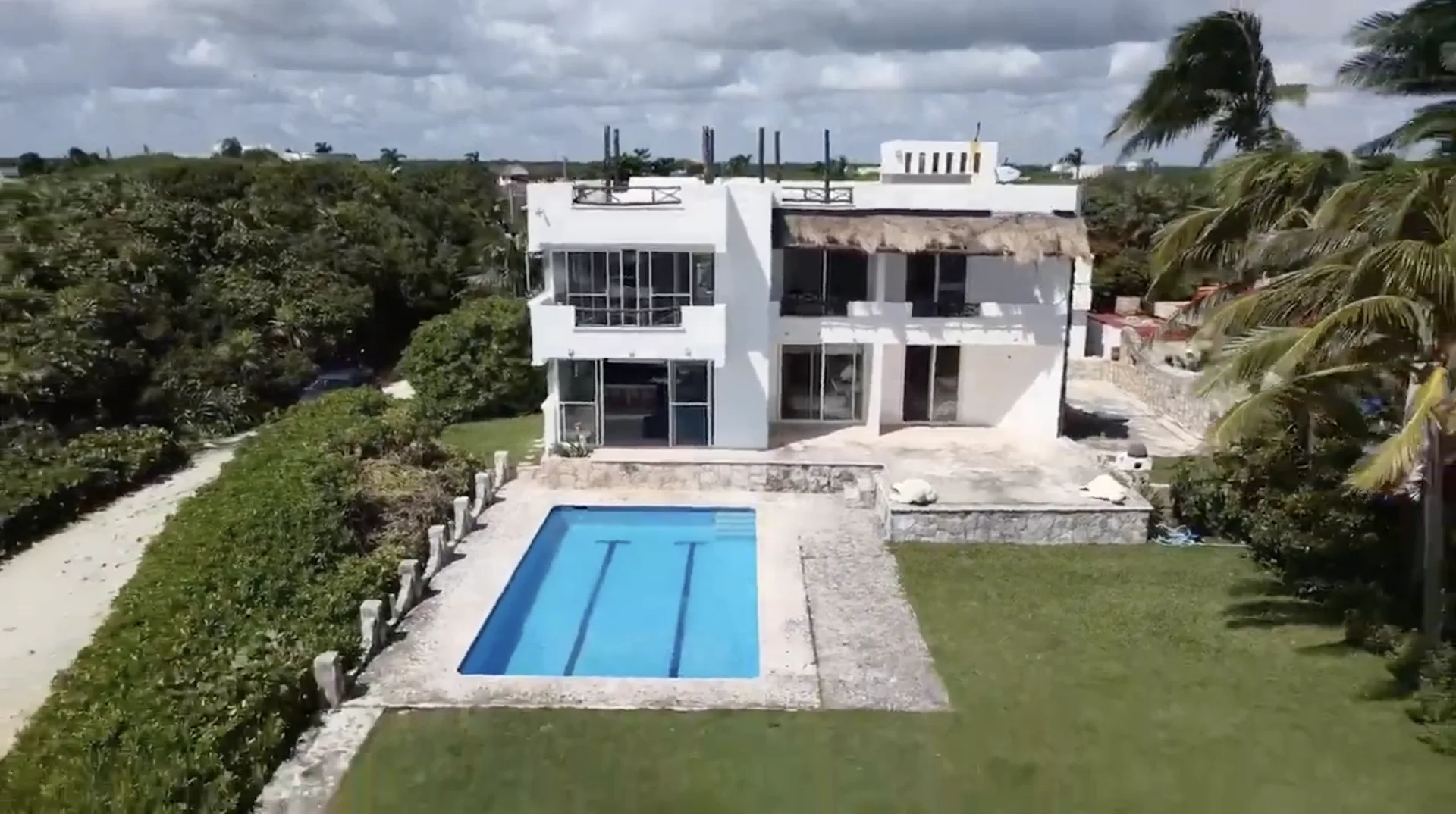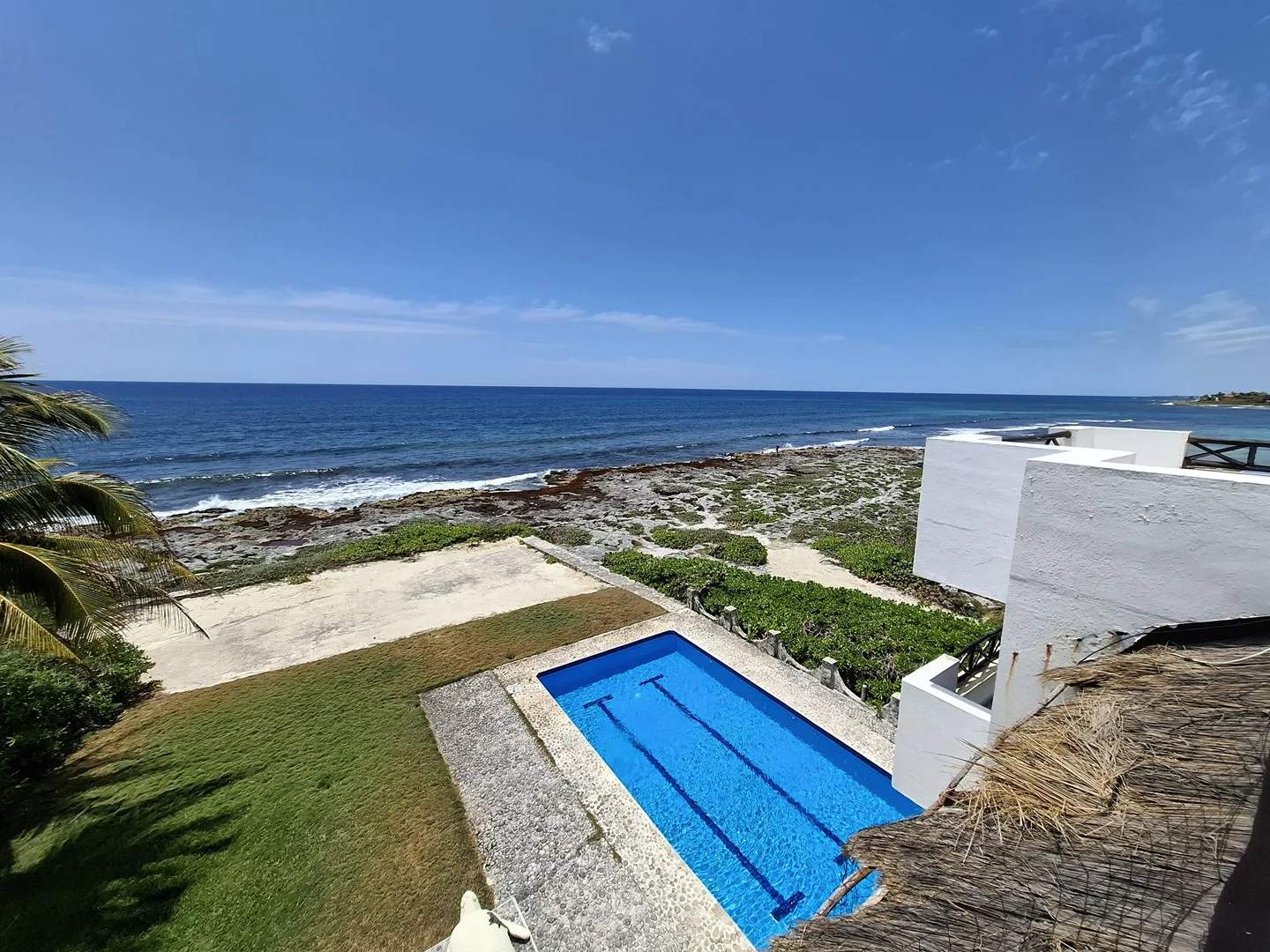 The property includes two additional rooms suitable for service quarters or storage. It features a beachfront pool and a rooftop terrace with 360-degree views. The villa is sold fully furnished and equipped.