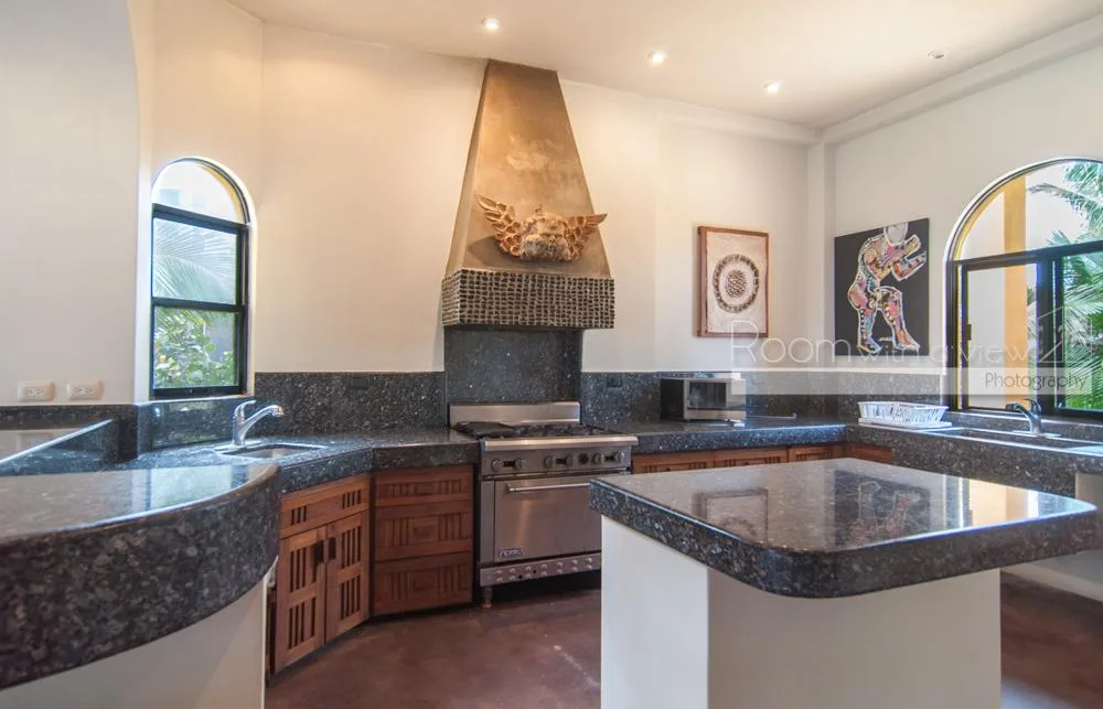 The villa is designed for indoor-outdoor living with expansive balconies and a spacious rooftop terrace offering sweeping Caribbean views. The property is fully furnished and includes an oceanfront swimming pool, an outdoor grill area, alfresco dining spaces, and palapas. The building offers concierge services and has a dedicated hospitality team.