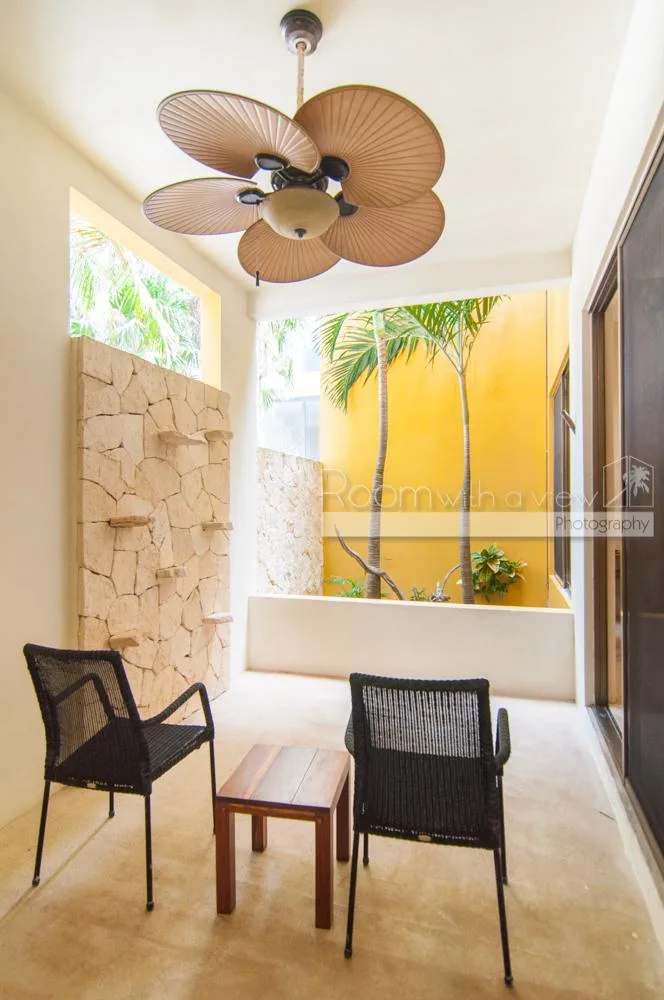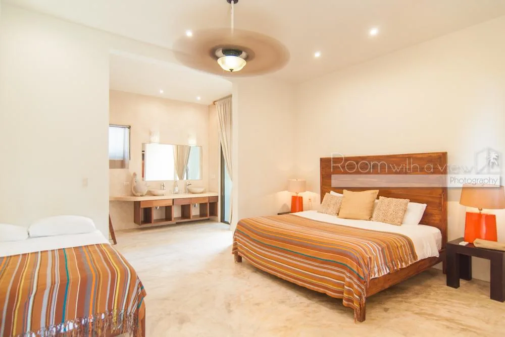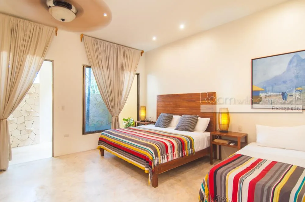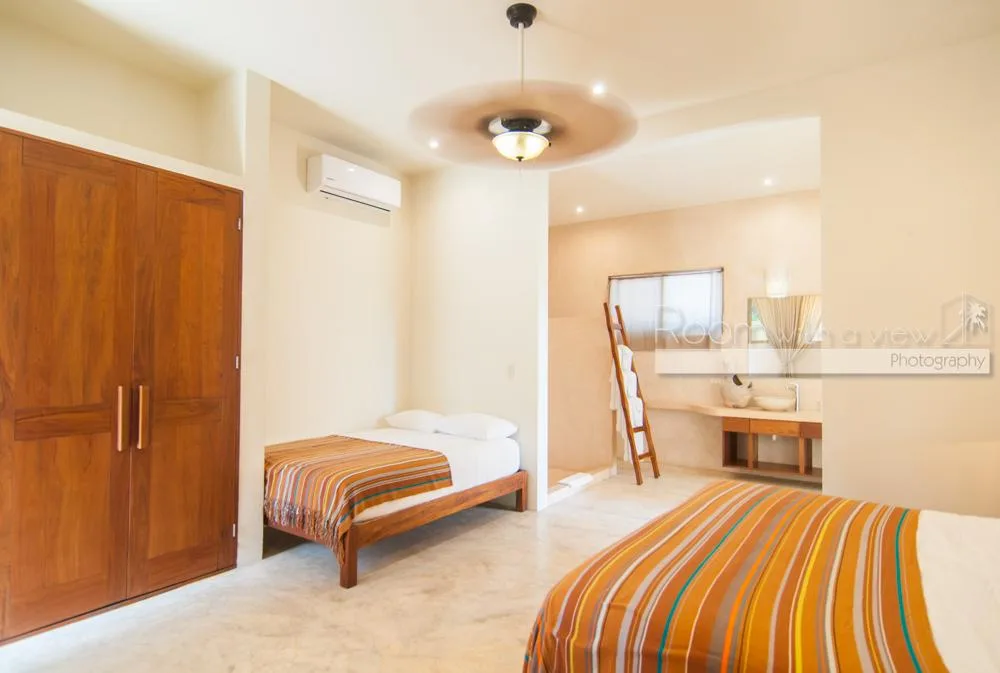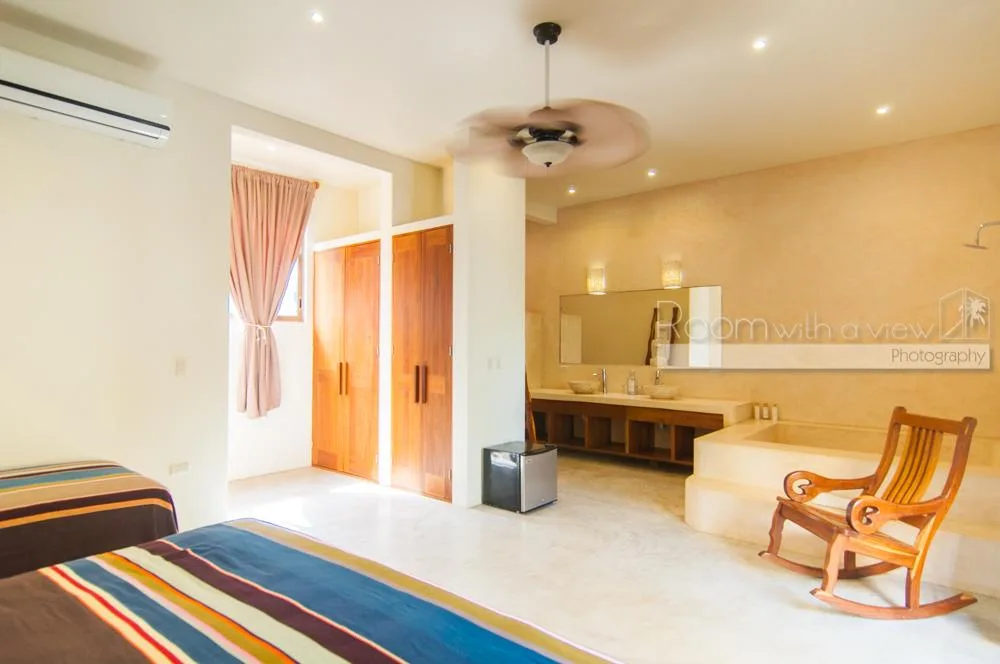 Each suite spans 250 to 300 square feet and includes a plush king-size bed, luxurious linens, and an en-suite bathroom. The 1, 000-square-foot master suite has a private balcony with panoramic ocean views. Five serene garden suites are nestled within lush jungle surroundings and feature hanging hammocks, private balconies, and handcrafted chukum bathrooms. An additional suite offers bunk beds, ocean views, and an outdoor sleeping area overlooking the jungle.