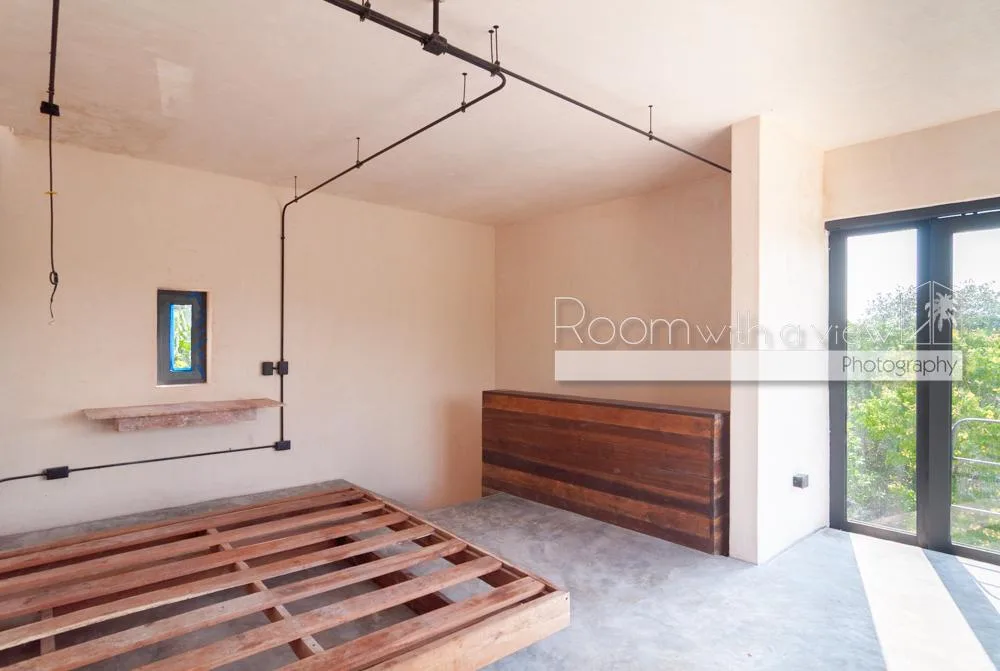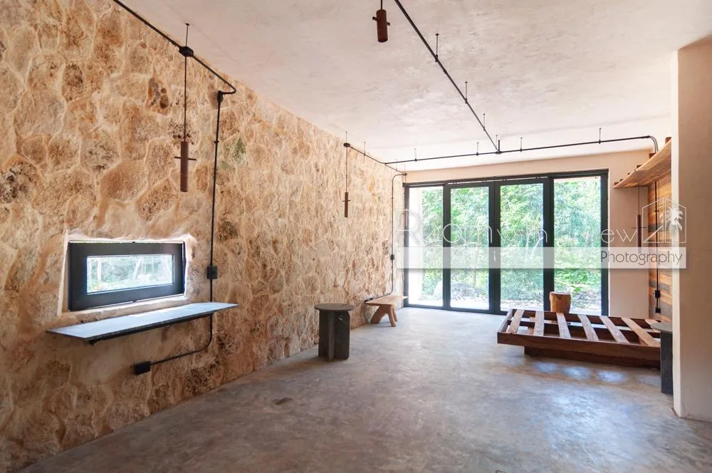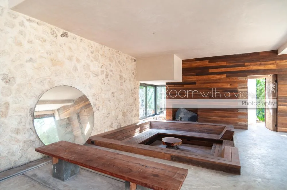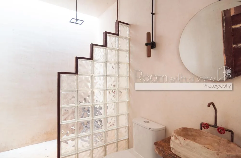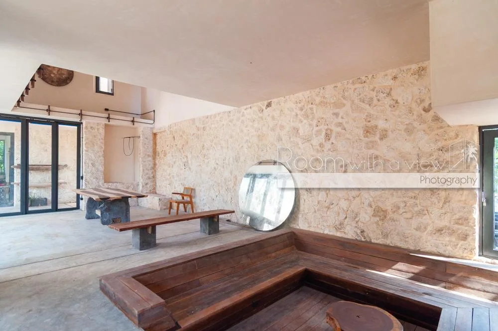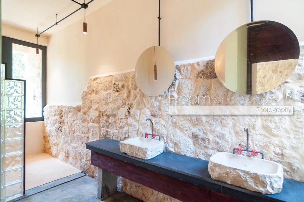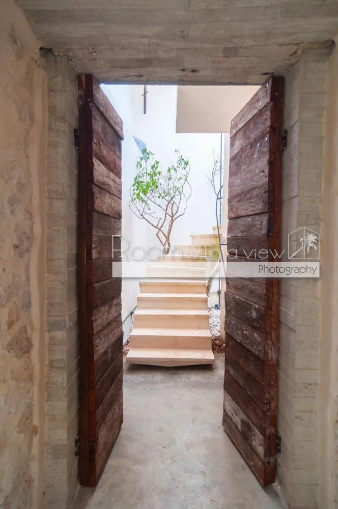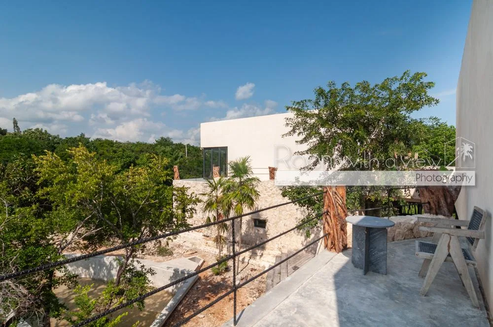 The home includes a balcony, a covered patio, and a private swimming pool. It is furnished and comes with three parking spaces. Thoughtful details include handcrafted hardwood furnishings, natural stone sinks, and copper lighting throughout.