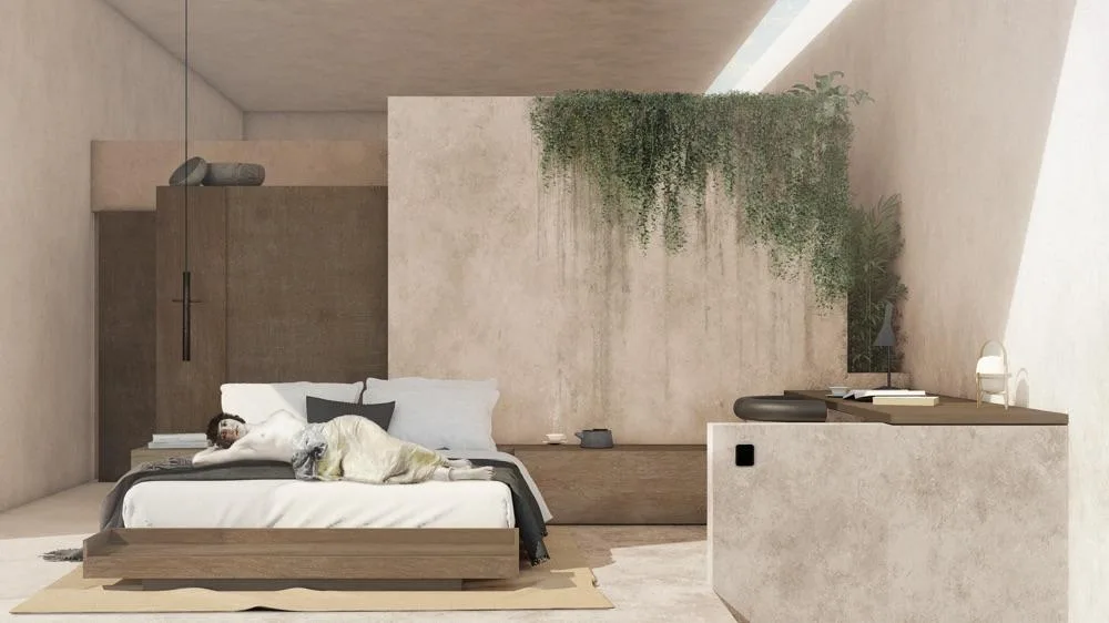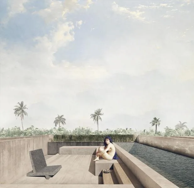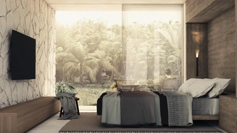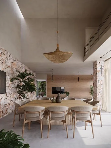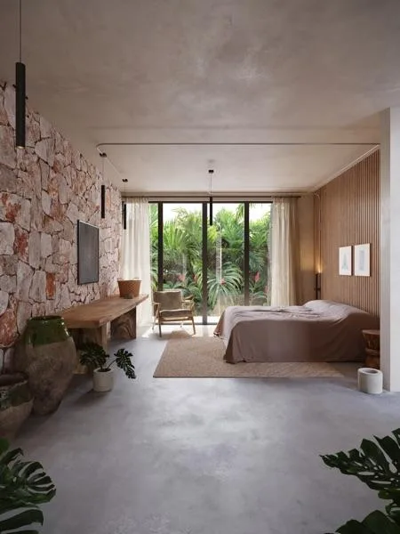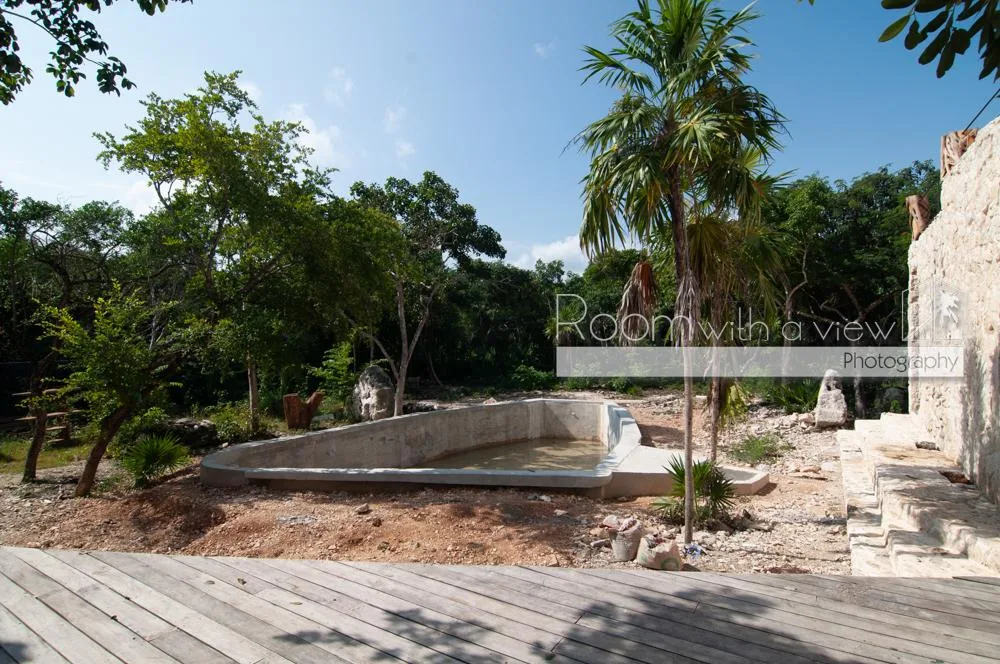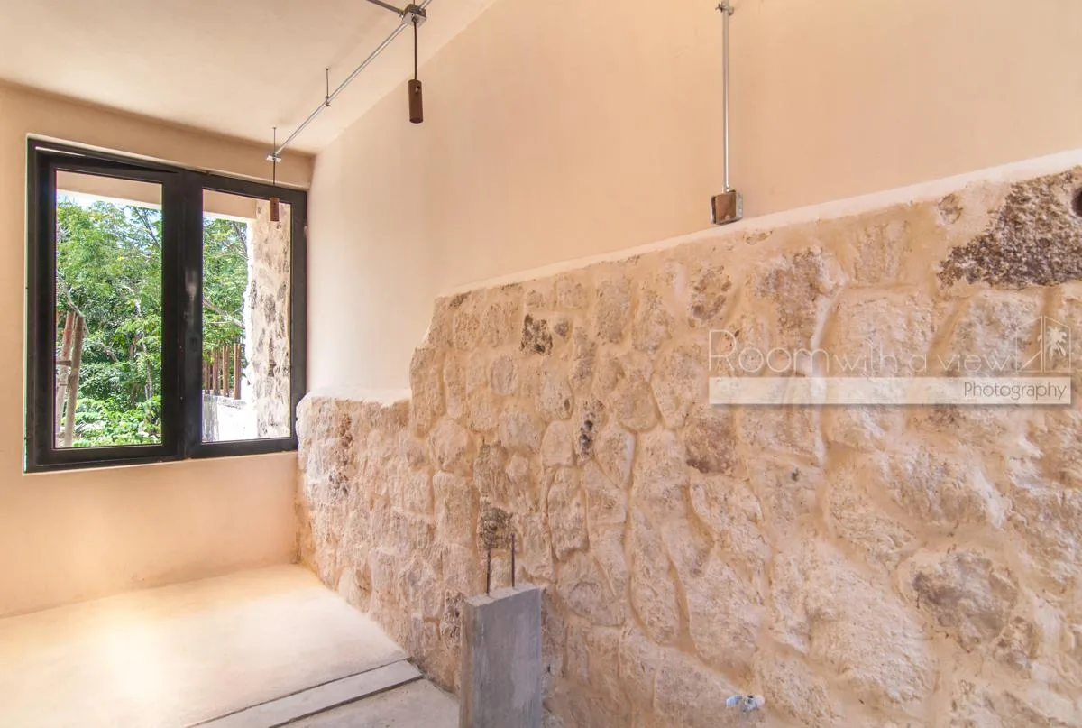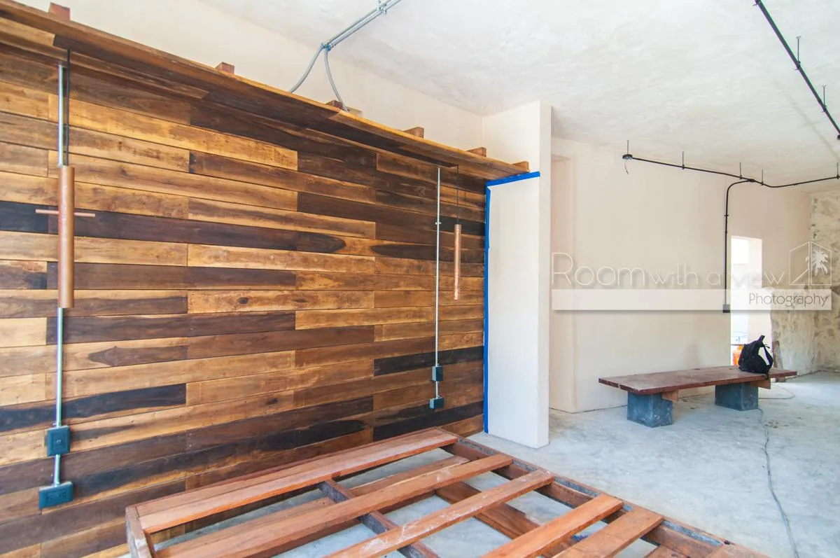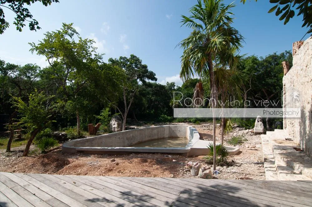 The home includes a balcony, a covered patio, and a private swimming pool. It is furnished and comes with three parking spaces. Thoughtful details include handcrafted hardwood furnishings, natural stone sinks, and copper lighting throughout.