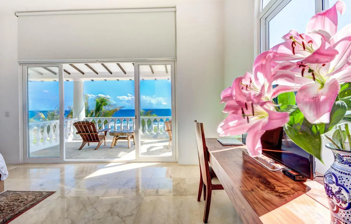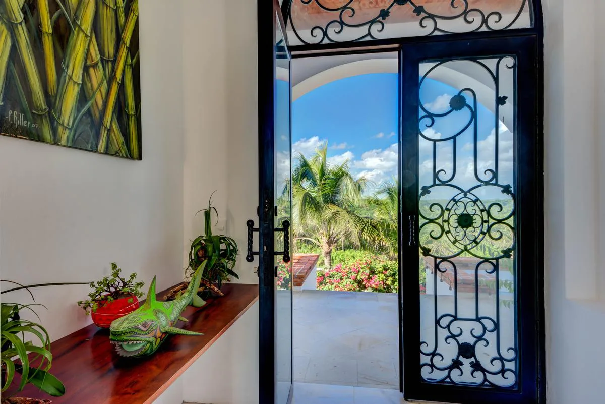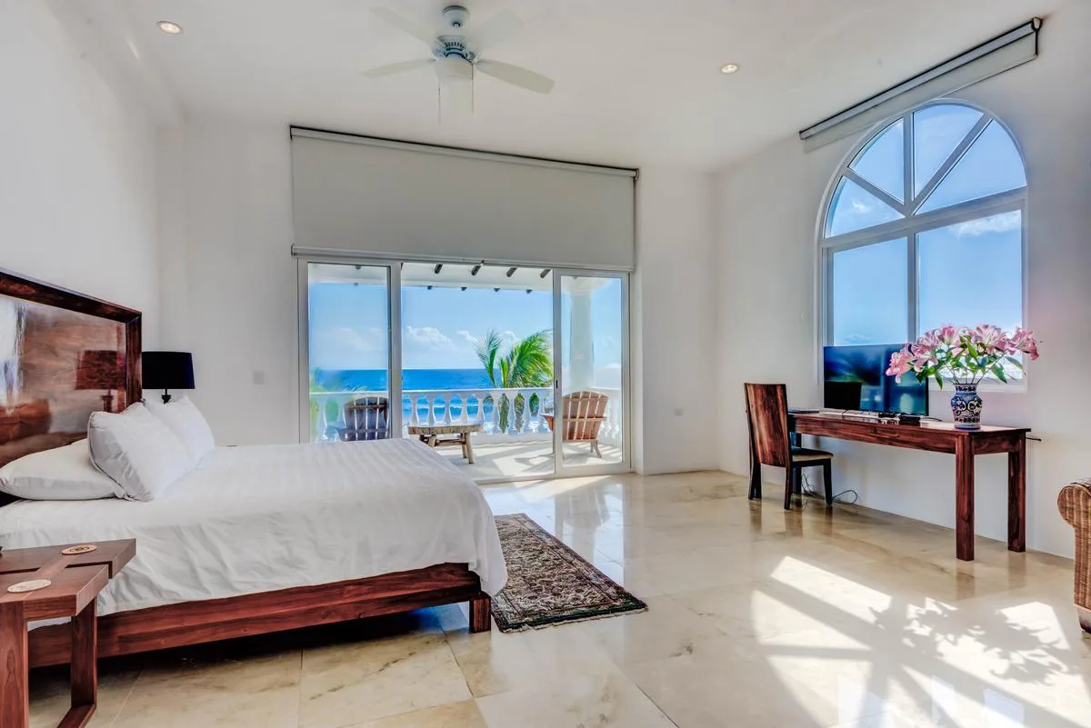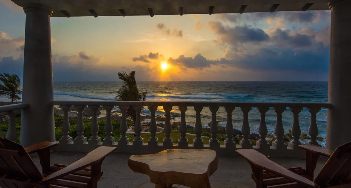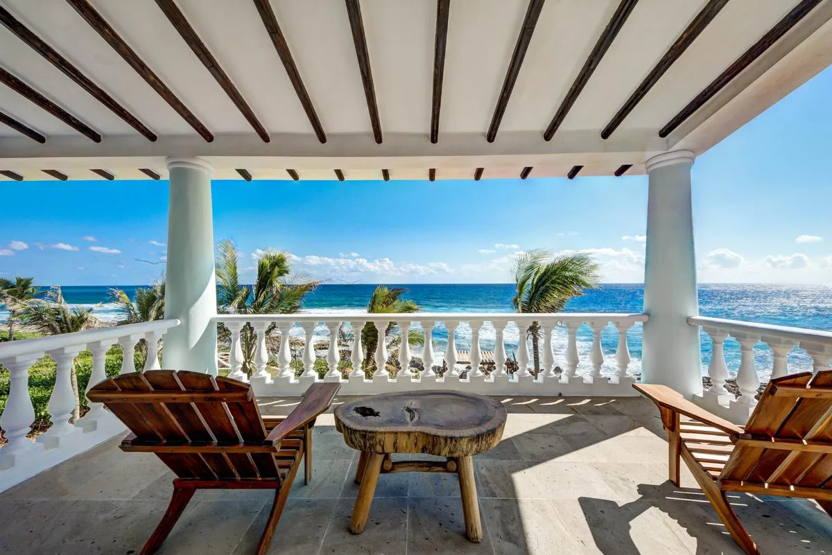 The villa offers a large patio suitable for relaxation and sunbathing, along with five balconies that provide ocean views. The location provides privacy and security, with dense Mayan jungle on one side and the ocean on the other.