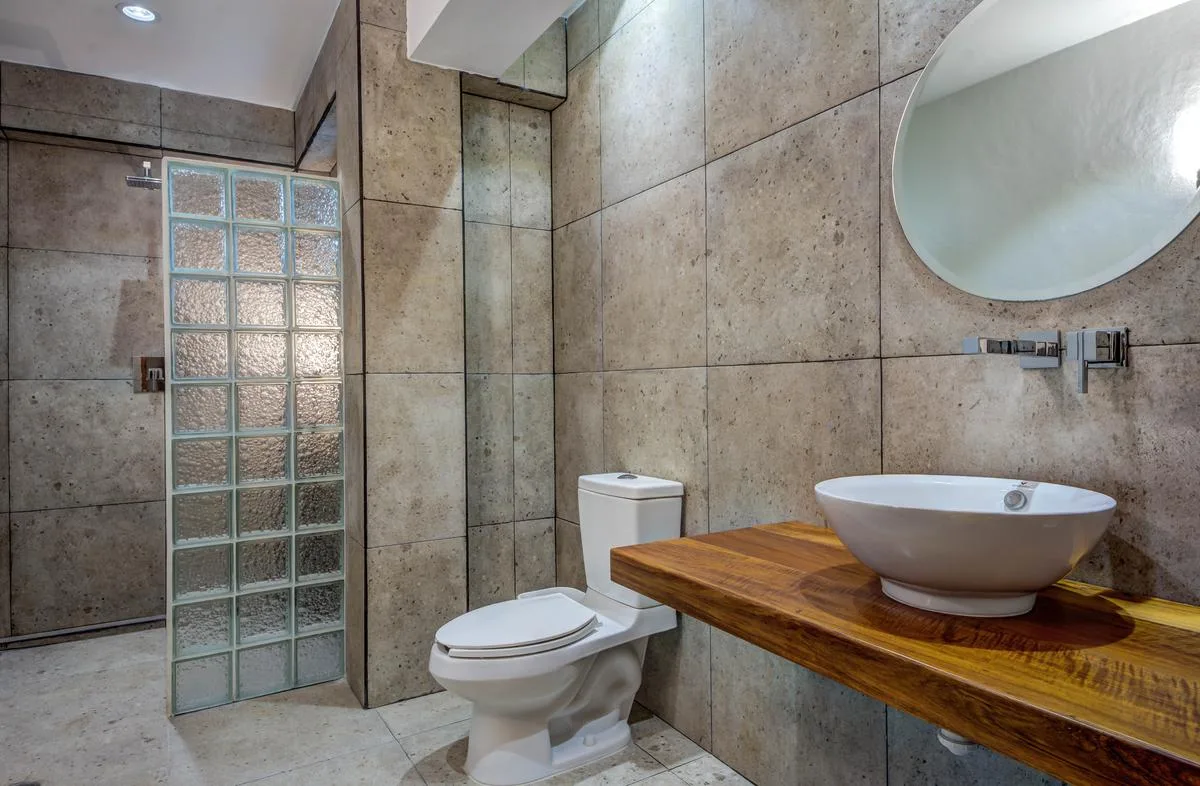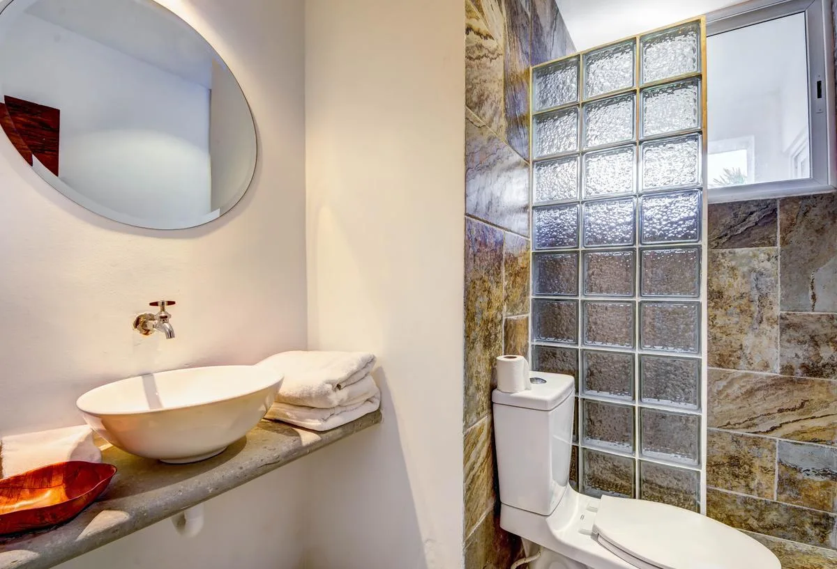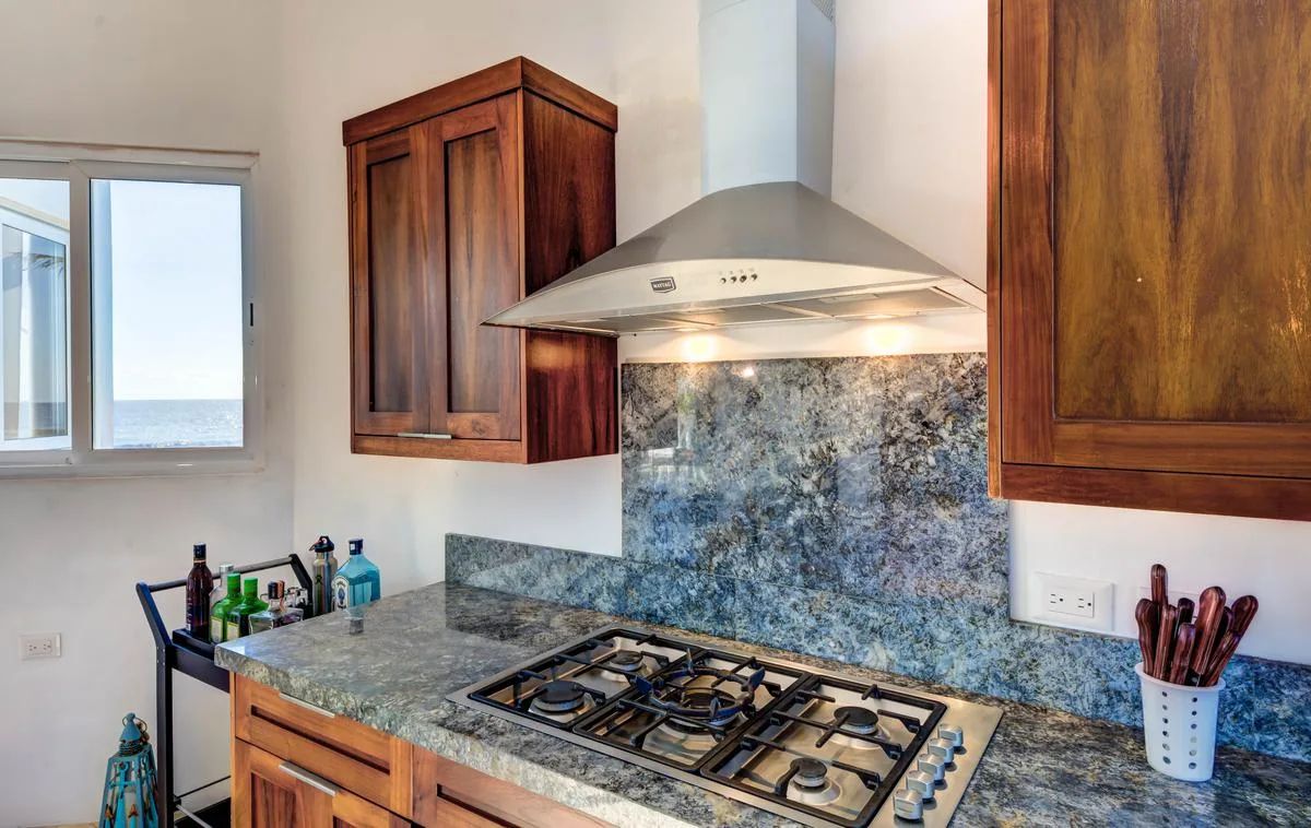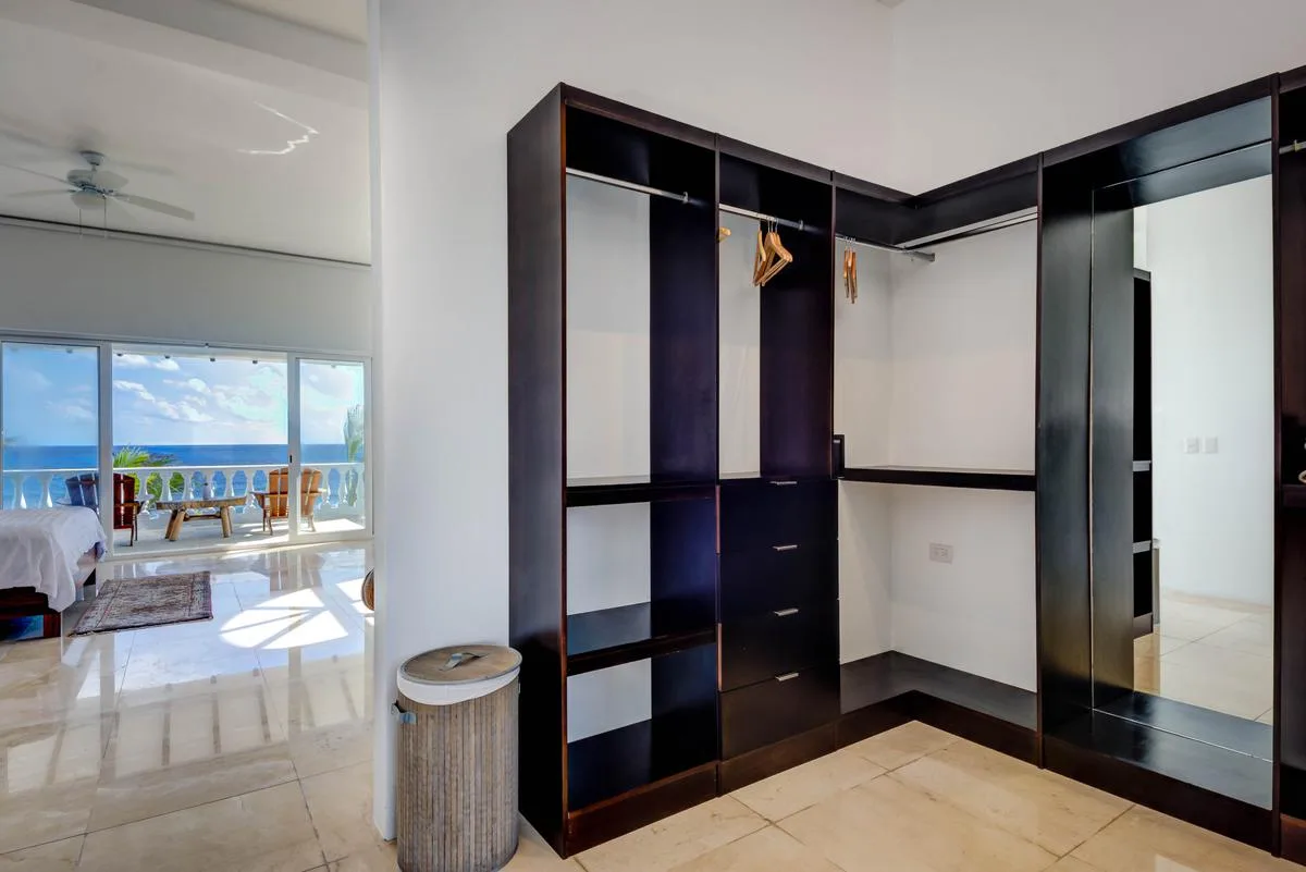 The villa offers a large patio suitable for relaxation and sunbathing, along with five balconies that provide ocean views. The location provides privacy and security, with dense Mayan jungle on one side and the ocean on the other.