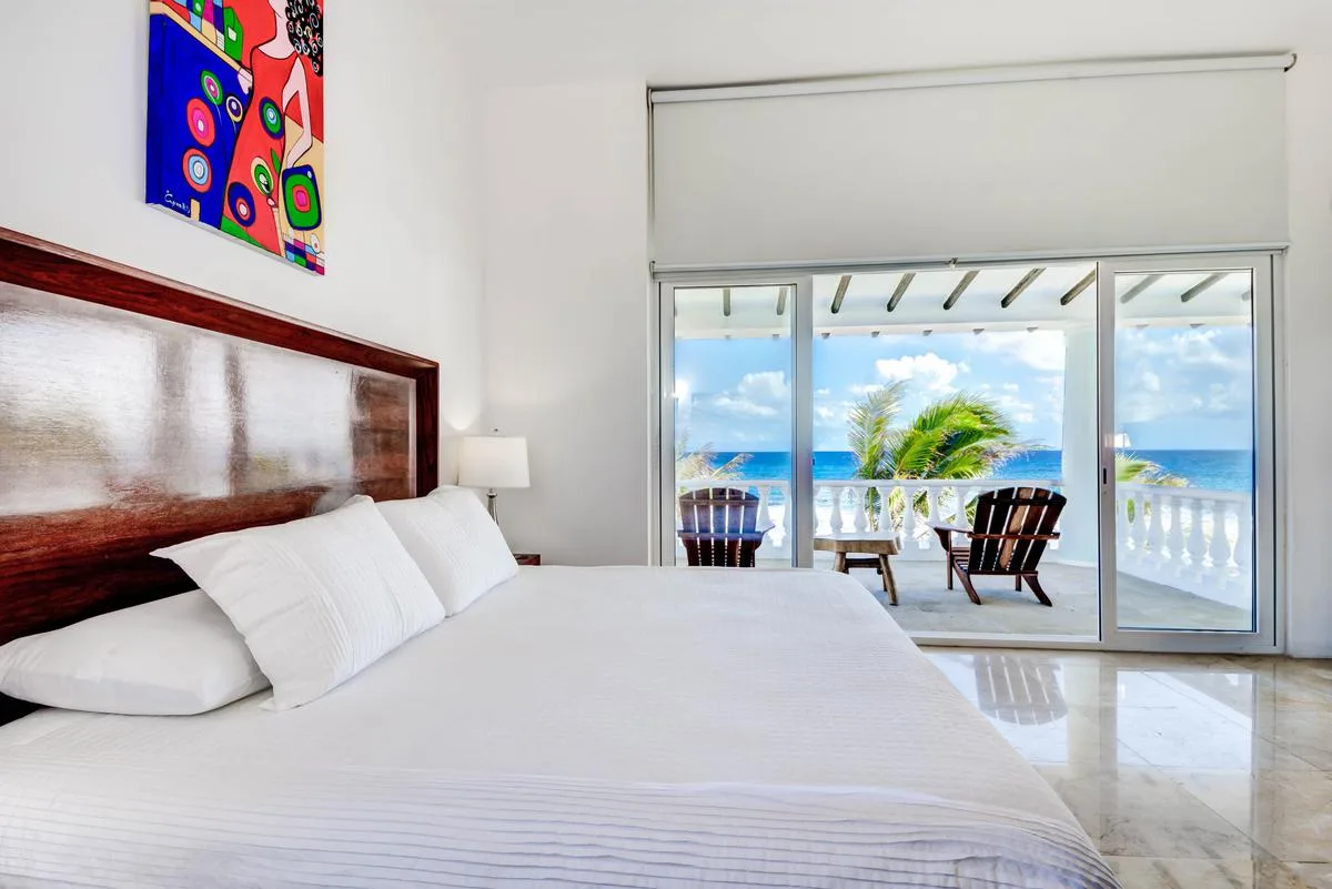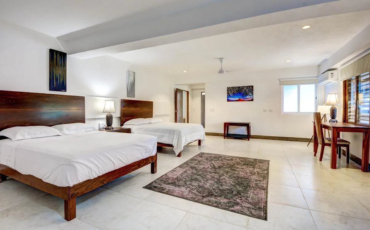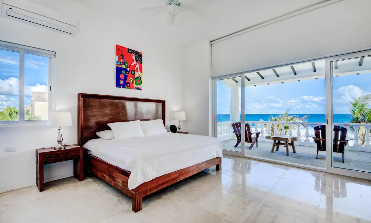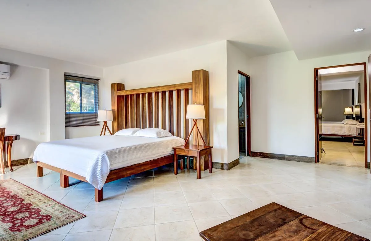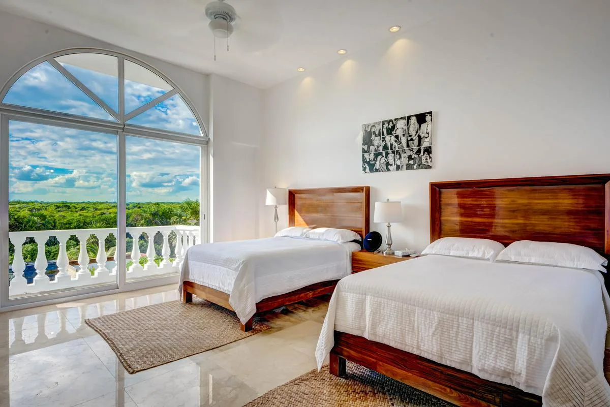 Three primary bedrooms feature ocean views, king-size beds, and spacious balconies with seating. Three additional bedrooms face the jungle and are equipped with two queen-size beds each. One more bedroom includes a single queen-size bed.