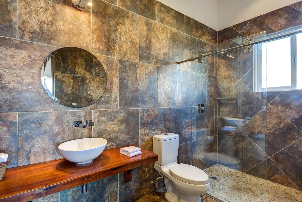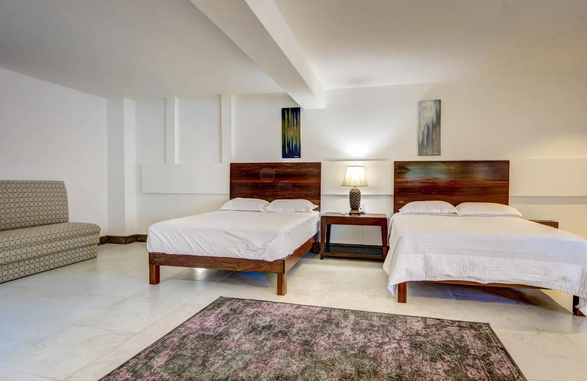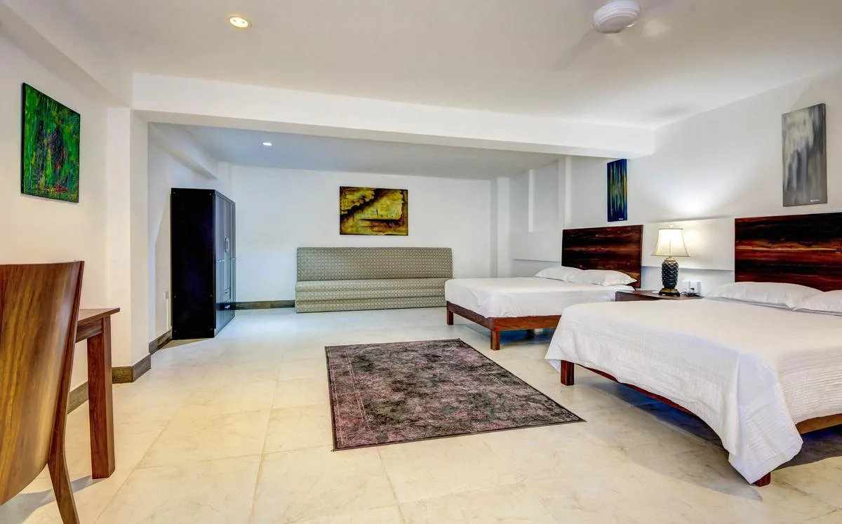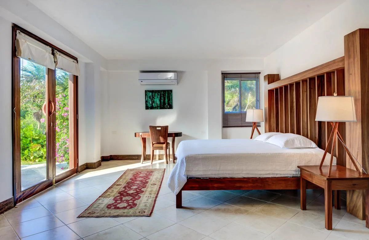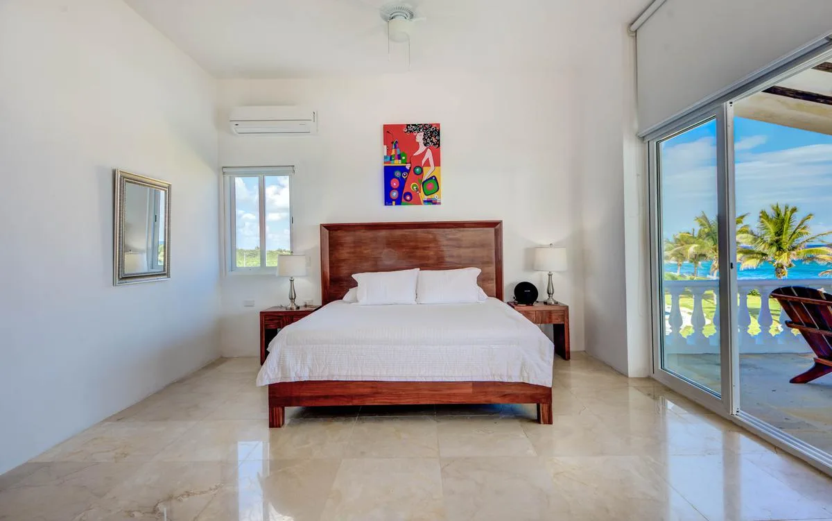 Three primary bedrooms feature ocean views, king-size beds, and spacious balconies with seating. Three additional bedrooms face the jungle and are equipped with two queen-size beds each. One more bedroom includes a single queen-size bed.