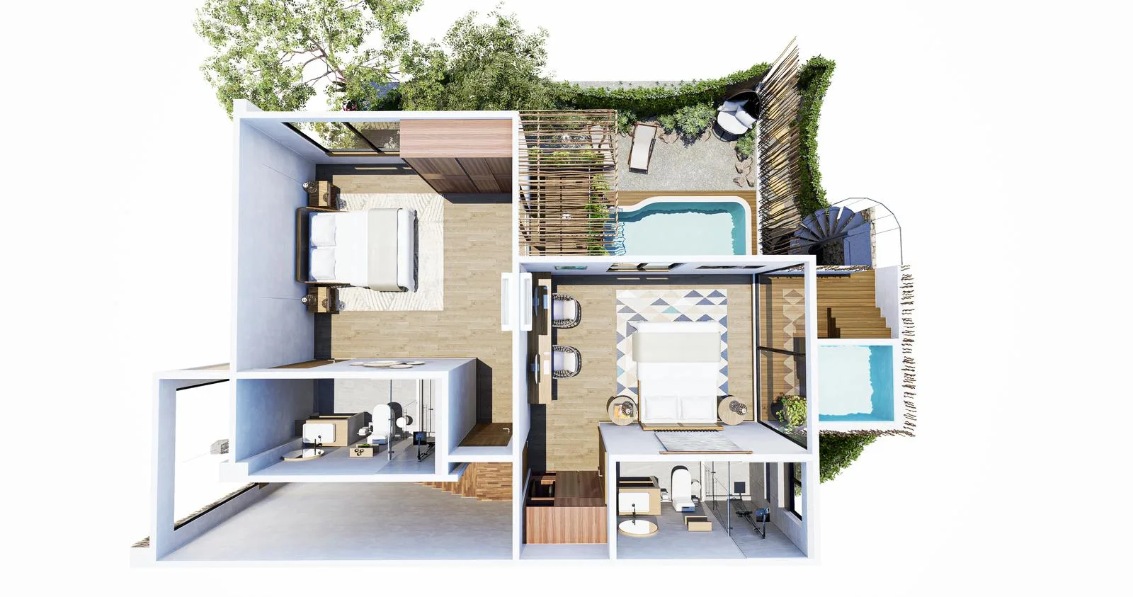 The property features a contemporary design with a balance of elegance and functionality, offering spacious interiors and high-quality finishes. It includes integrated social areas, bright bedrooms, and a private terrace with a garden, providing privacy and comfort in a natural setting.