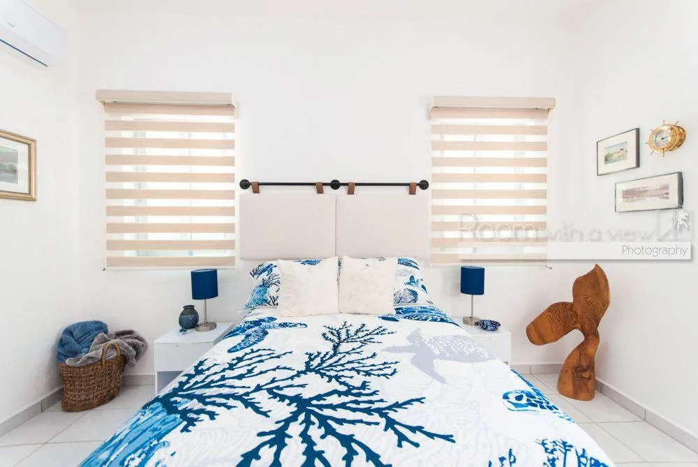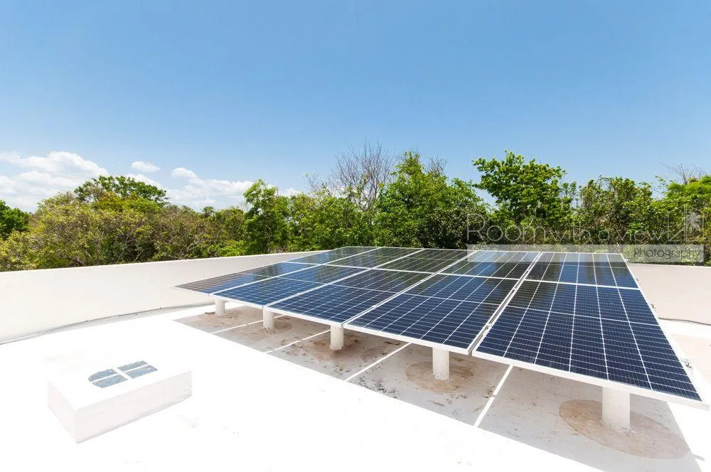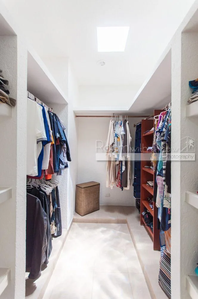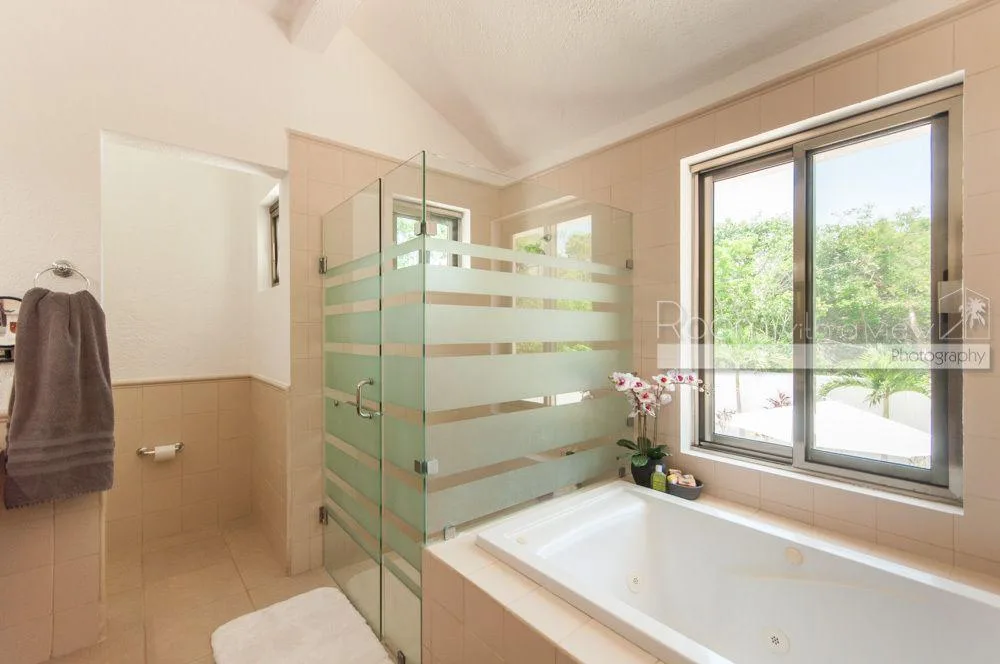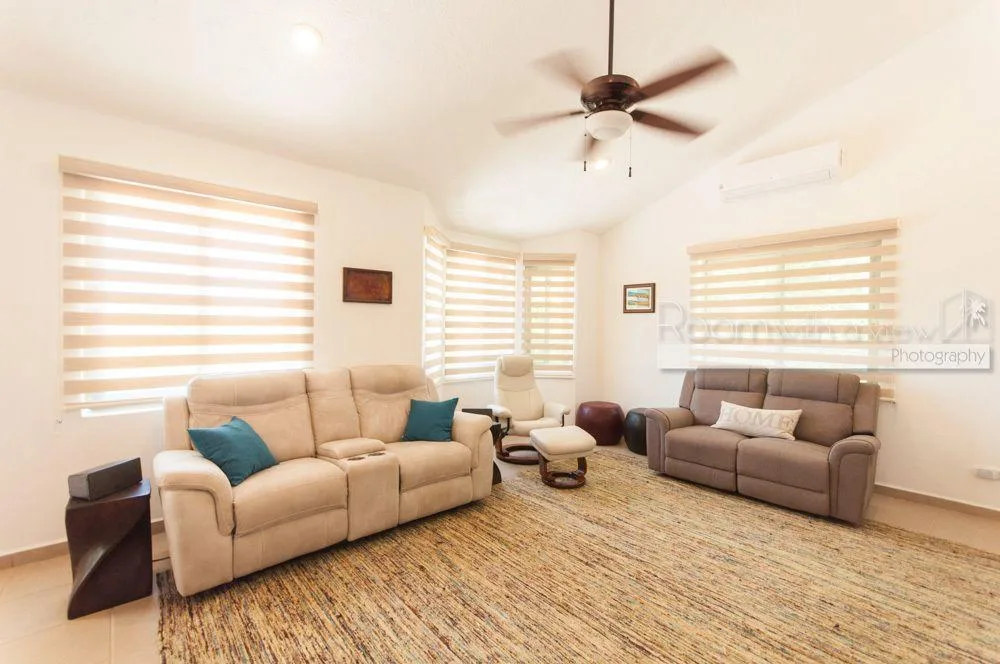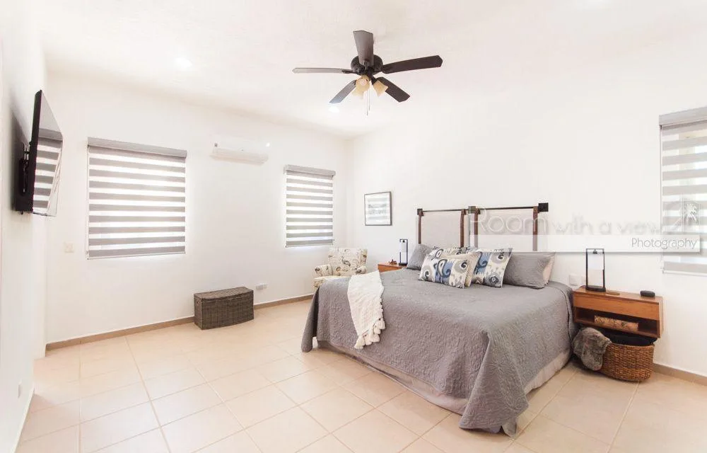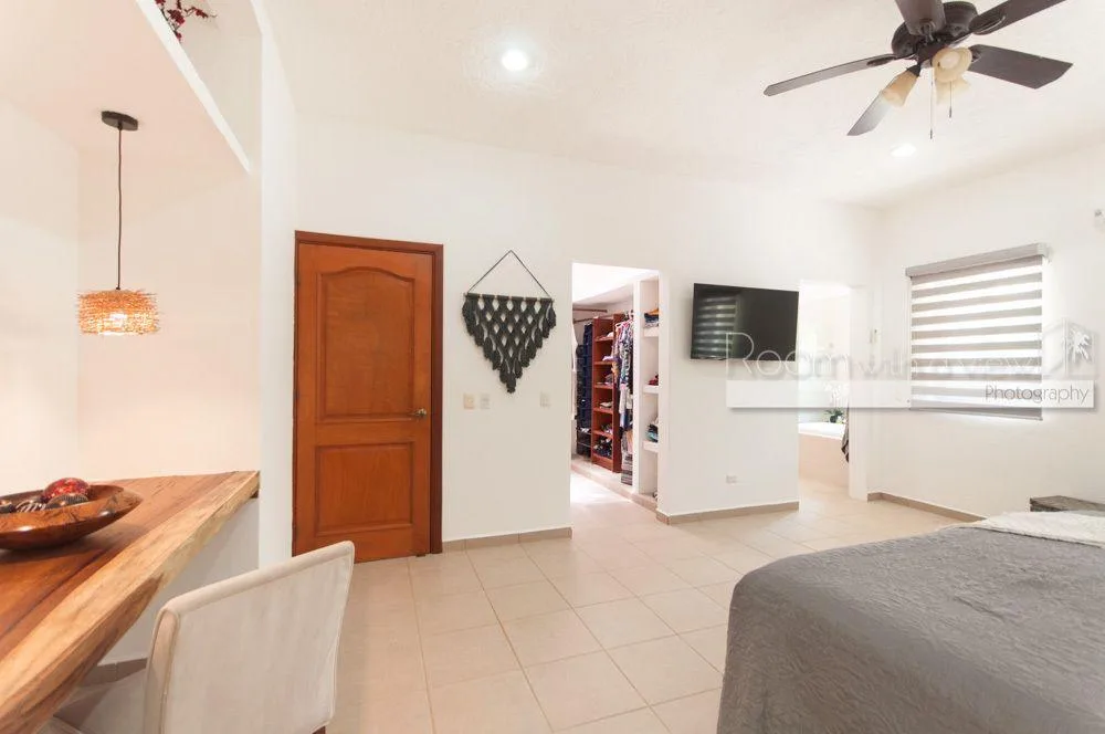The primary bedroom features a large walk-in closet and an en suite bathroom with a walk-in shower and a jacuzzi. The home has plentiful storage throughout, tile floors, and high-quality finishes. It is fully furnished and includes three TVs with Sonos speaker systems, ceiling fans in all rooms, eight air conditioning units, storm shutters, a backup generator, and solar panels.
