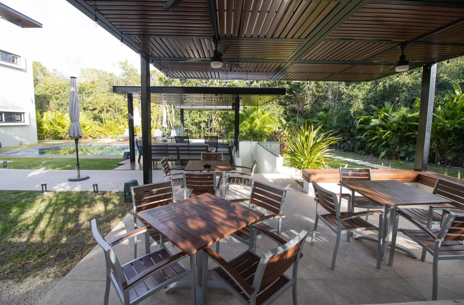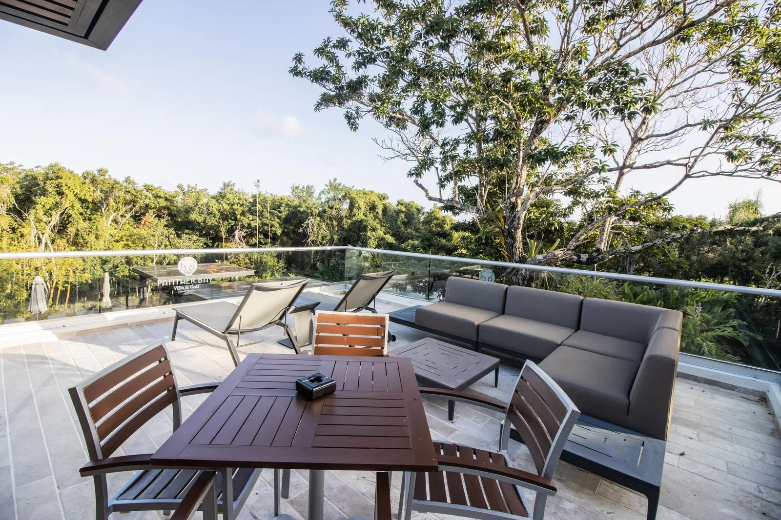The upper floor contains four additional apartments, each with a bathroom, and two include bathtubs and terrace access. This level also features a terrace with a wooden deck, an outdoor room, and a hydromassage jacuzzi, providing views of the Mayan jungle and the golf course.