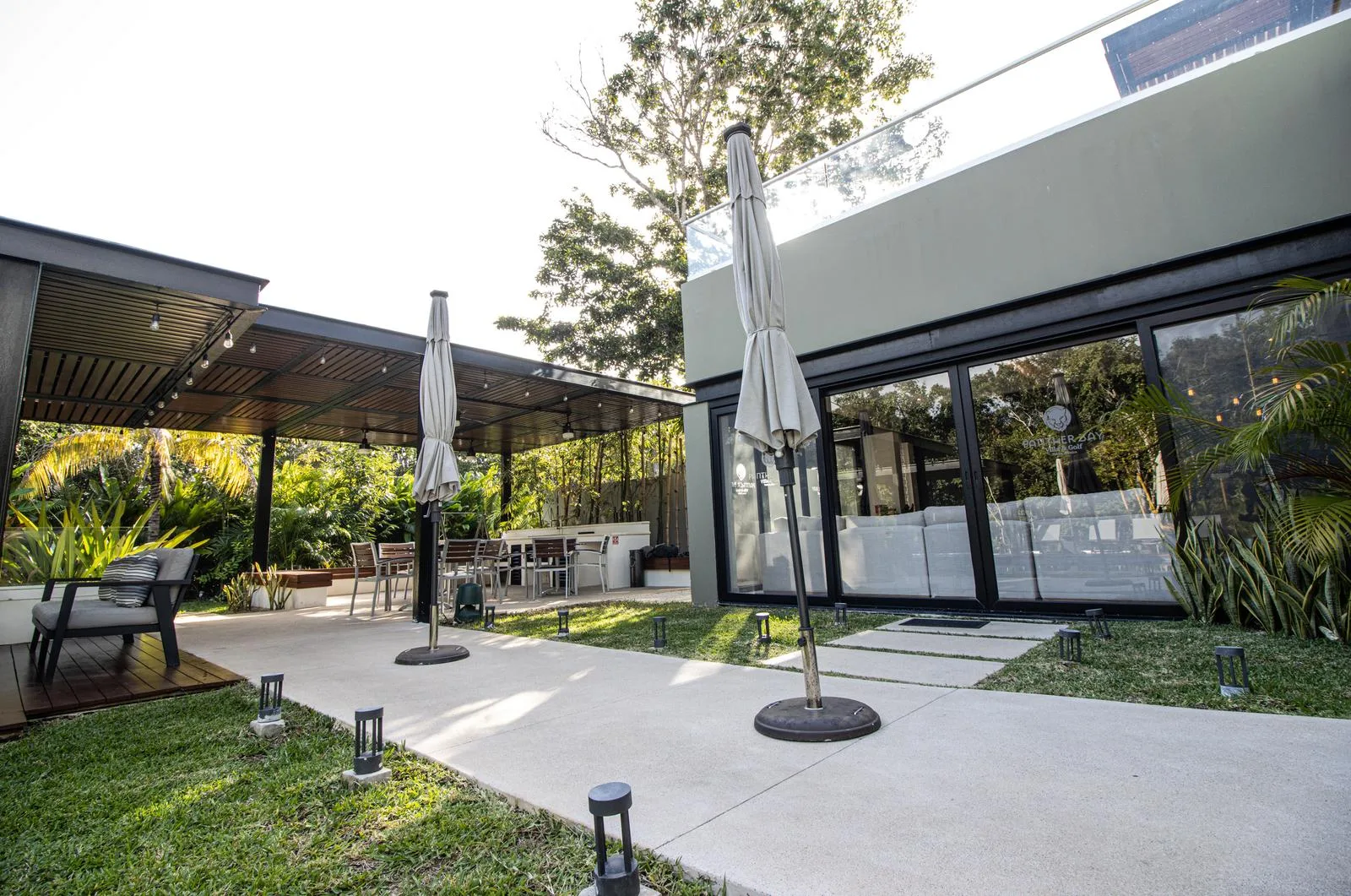 The parcel size is 1077 square meters, with a construction area of 846 square meters. The ground floor includes parking for three vehicles, a reception area with double height, a half-bathroom and guest closet, and a professionally equipped kitchen with a dining area for 14 people. Three apartments are located on this level, each with a bathroom and bathtub; some offer terrace access or a private garden terrace. Also on the ground floor is an entertainment lounge with screens and a bar, a half-bathroom, a terrace with a grill and tables, a pool with a wooden deck, sun loungers, and umbrellas, a wet bar, gardens, and a wine cellar.