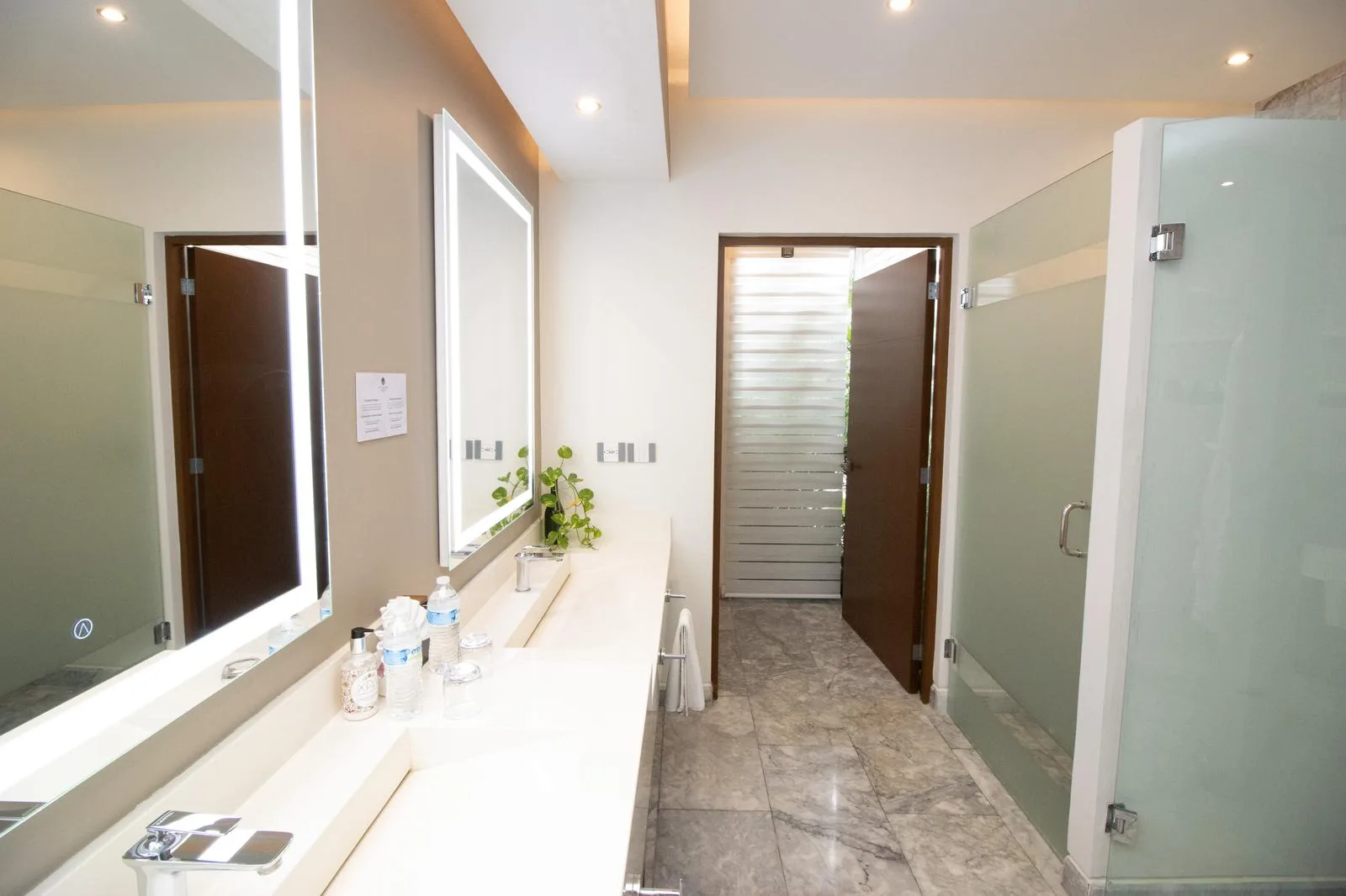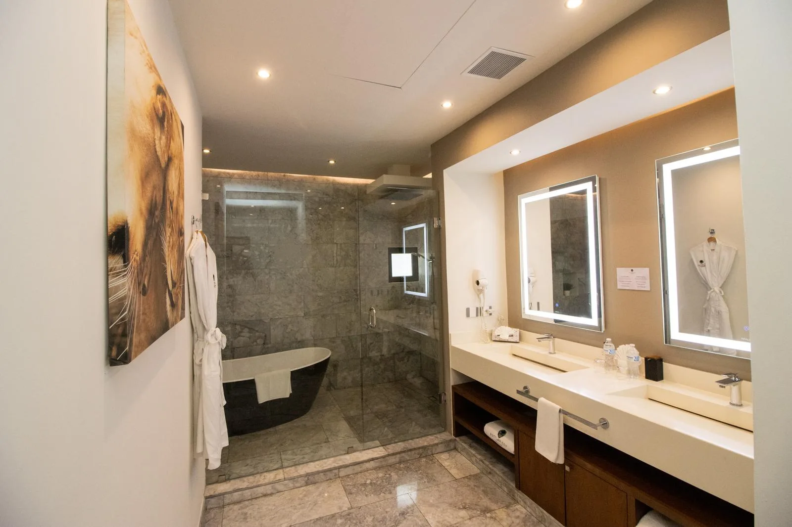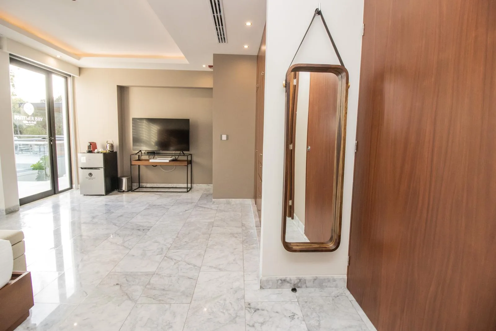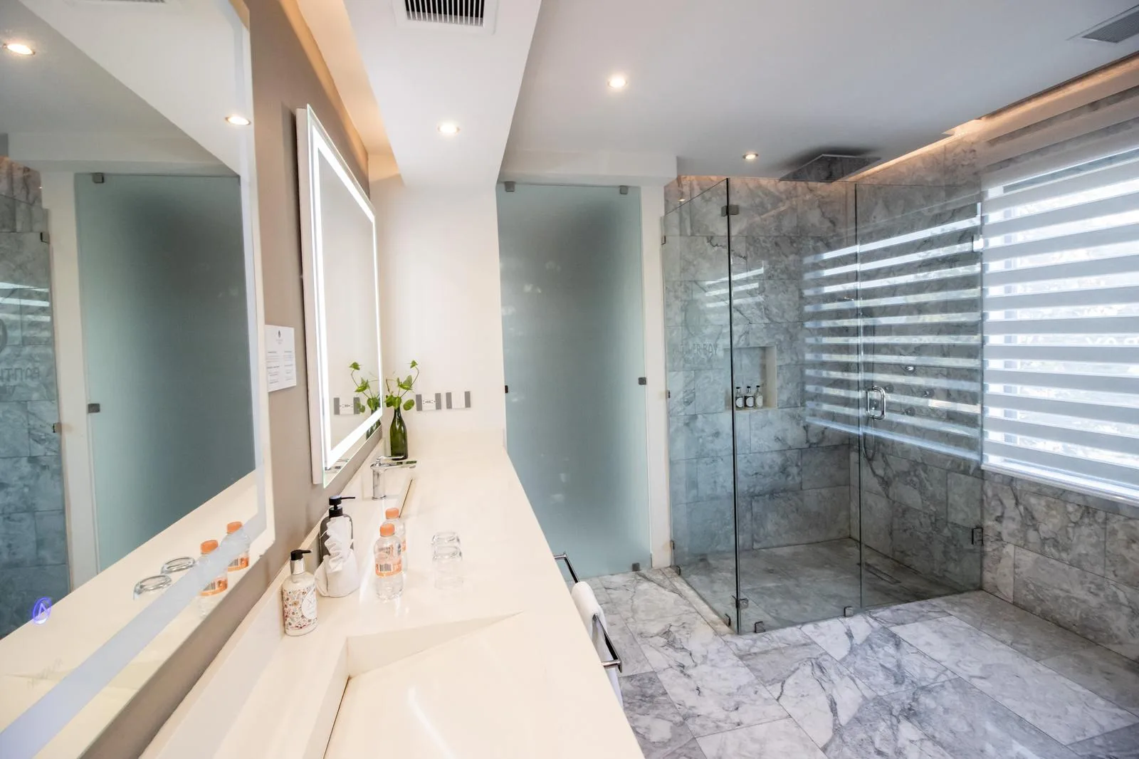 Each apartment provides ample space with its own living area, a minibar, and direct access to various terraces. The bathrooms feature high-quality finishes, including double sinks and bathtubs.