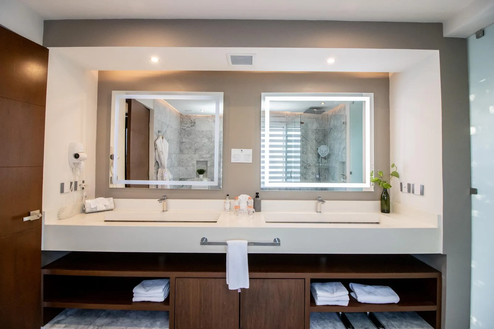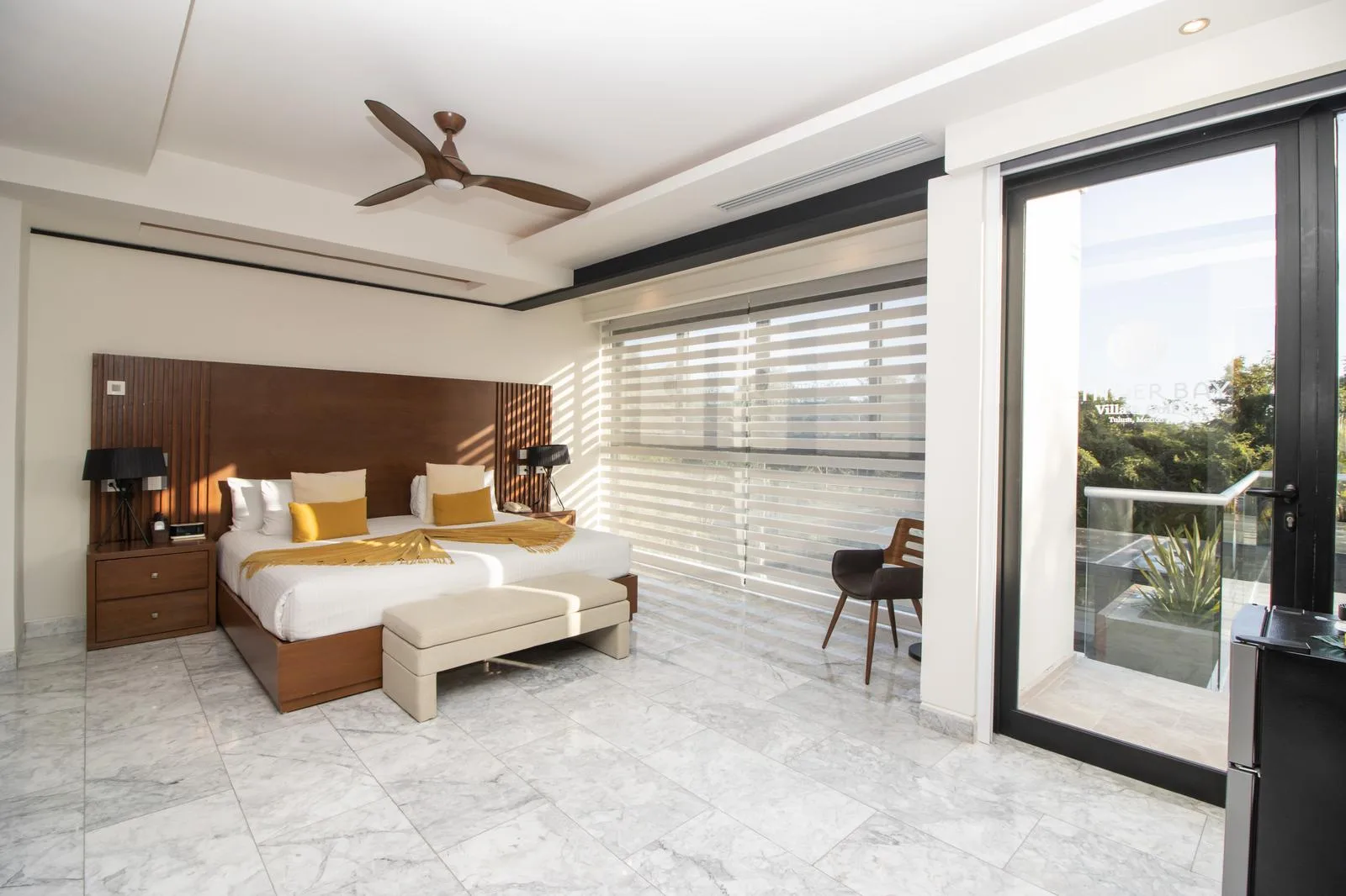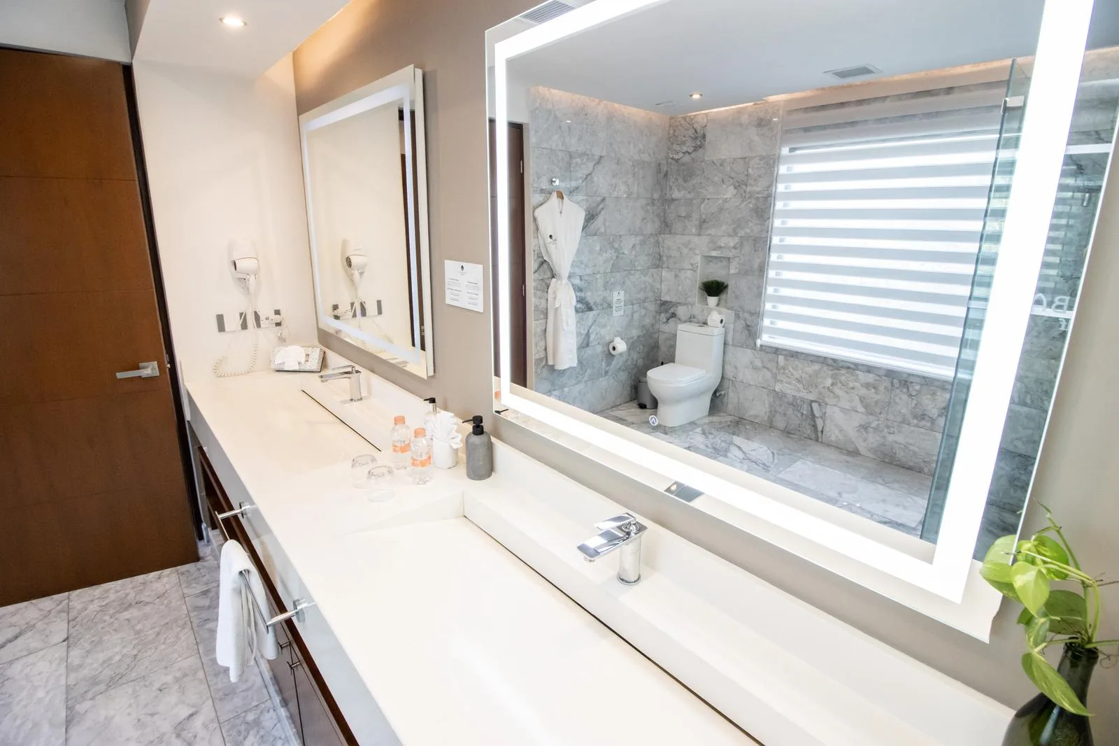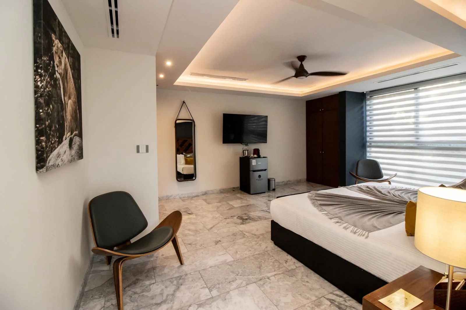 Each apartment provides ample space with its own living area, a minibar, and direct access to various terraces. The bathrooms feature high-quality finishes, including double sinks and bathtubs.