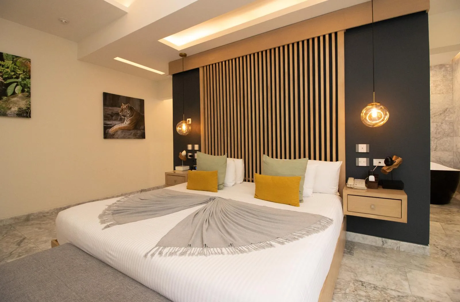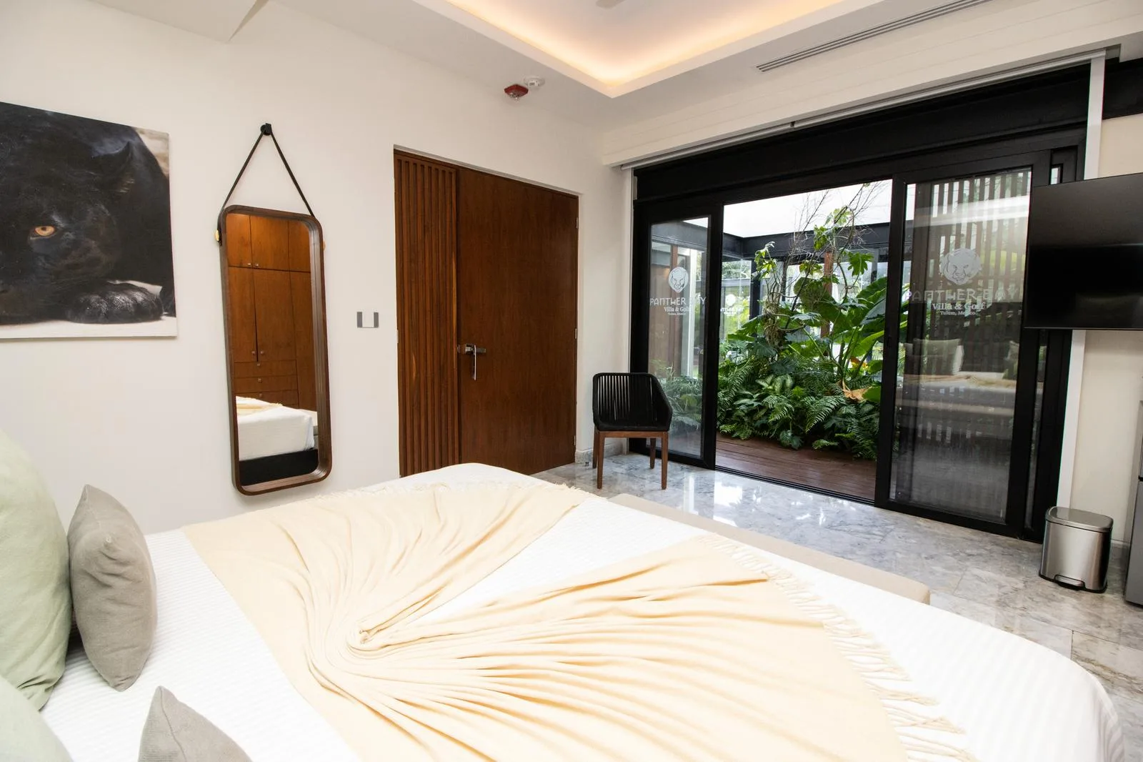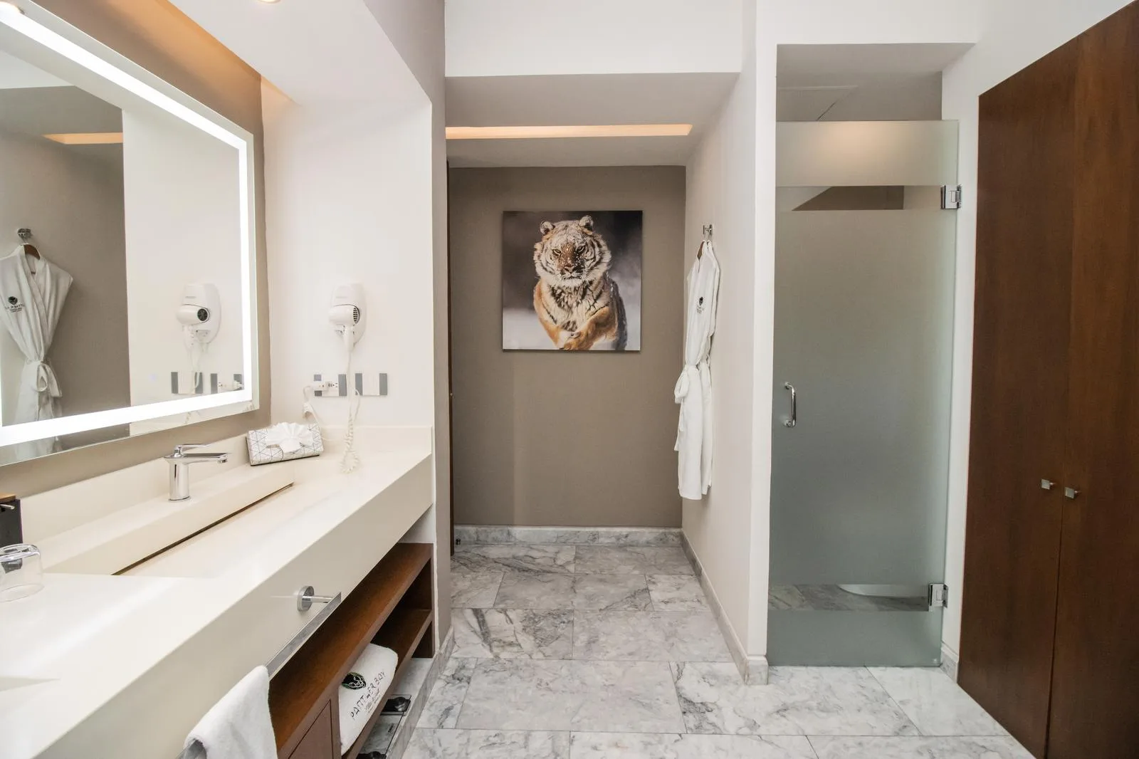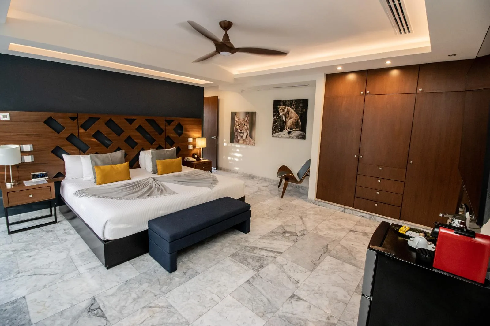 Each apartment provides ample space with its own living area, a minibar, and direct access to various terraces. The bathrooms feature high-quality finishes, including double sinks and bathtubs.