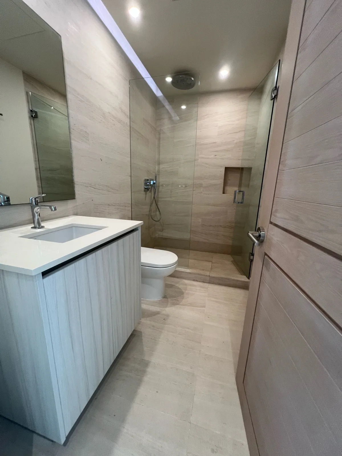 The unit includes three spacious bedrooms, each with a full bathroom. The primary bedroom features a walk-in closet. The social area is appointed with custom-built furniture and includes a living room, dining area, bar, and open-concept kitchen, all finished with luxury materials. A terrace with sea views is accessible directly from the private elevator.