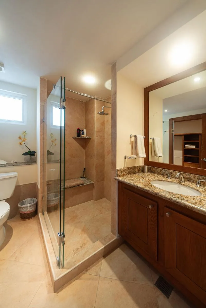 The property features three bedrooms, each with a full bathroom and walk-in closet, along with three additional full bathrooms. A separate service room includes its own full bathroom. The layout comprises a living area and a television room. A spacious terrace offers a Jacuzzi and panoramic ocean views.