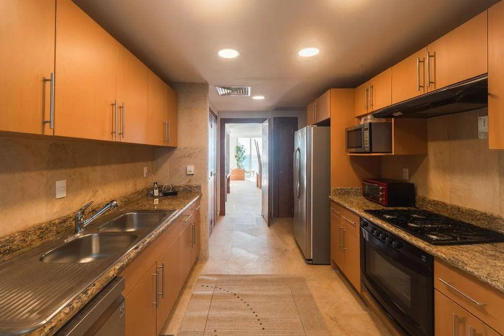 The kitchen is fully equipped. The unit includes hurricane-resistant curtains and is delivered furnished.