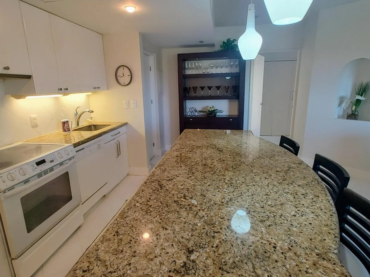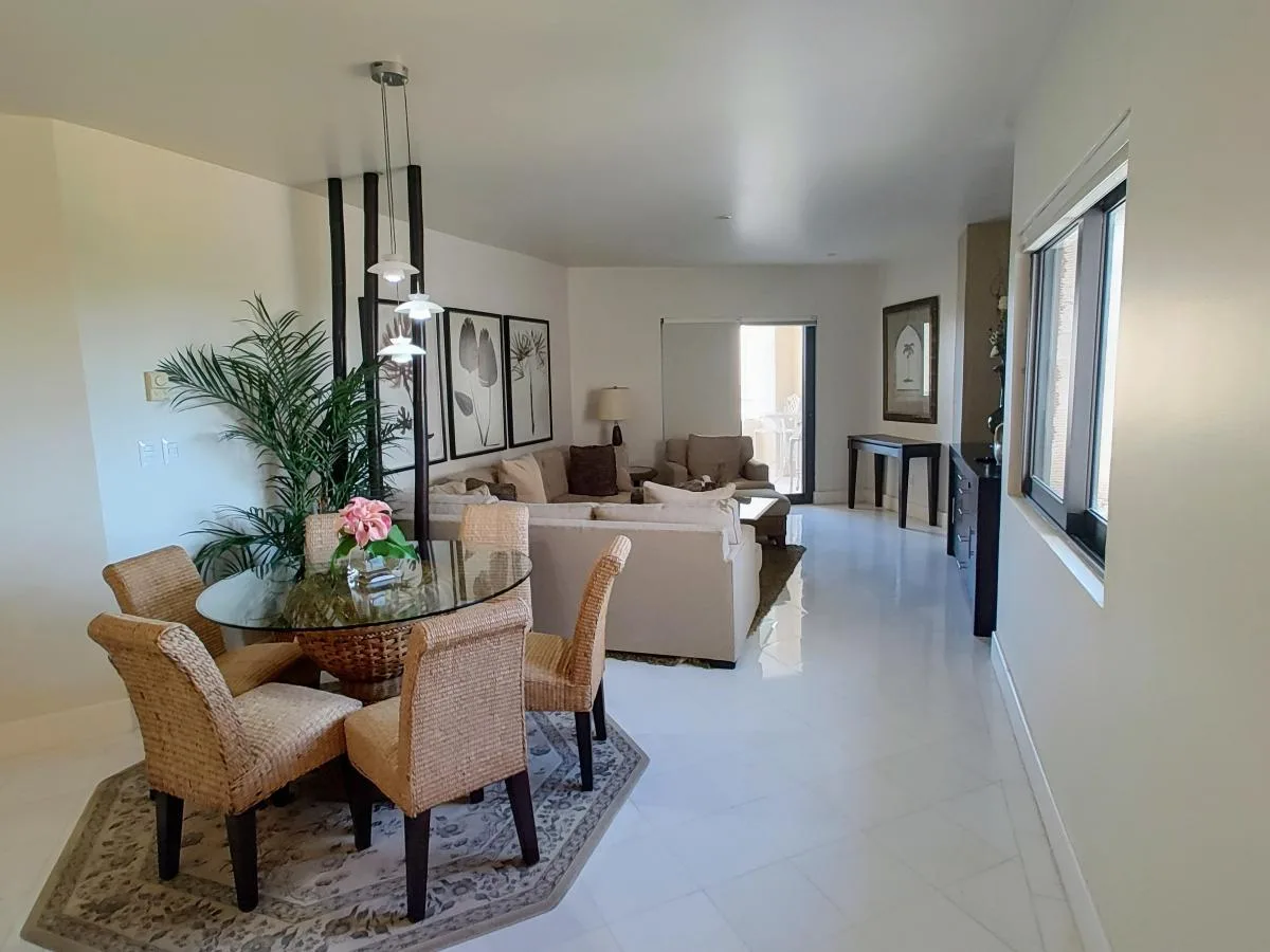 The layout includes a combined living and dining area. The open-plan kitchen is equipped with a granite countertop and appliances. A terrace accessible from the living area offers views of the ocean and the resort pool.