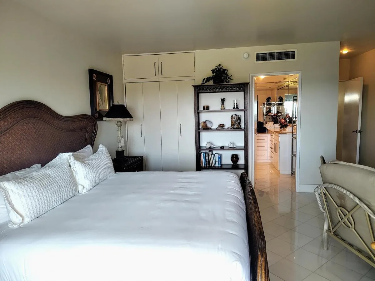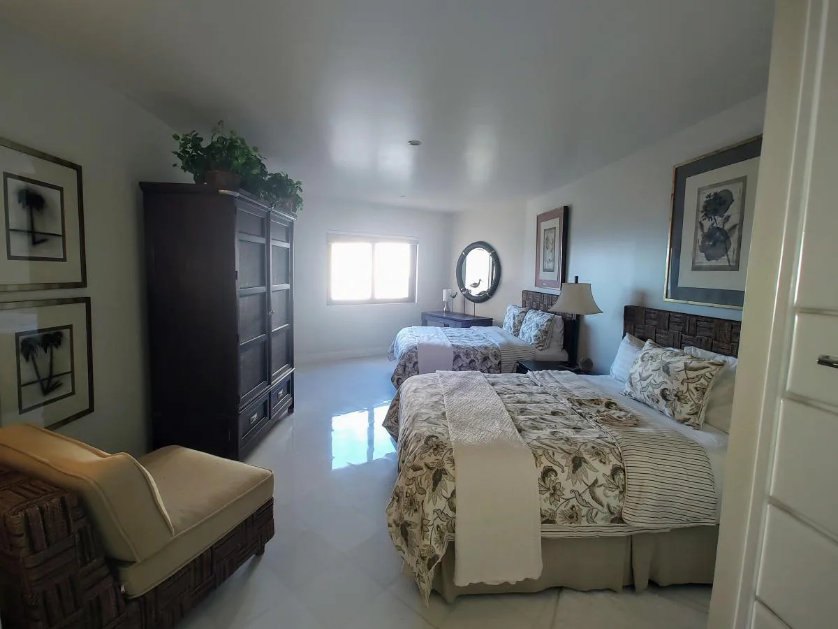 The master bedroom features a king-size bed, a full bathroom, and a large terrace with views of the lagoon. The secondary bedroom is equipped with two double beds, includes a full bathroom, and provides views of the ocean and pool. The residence includes two unassigned parking spaces.