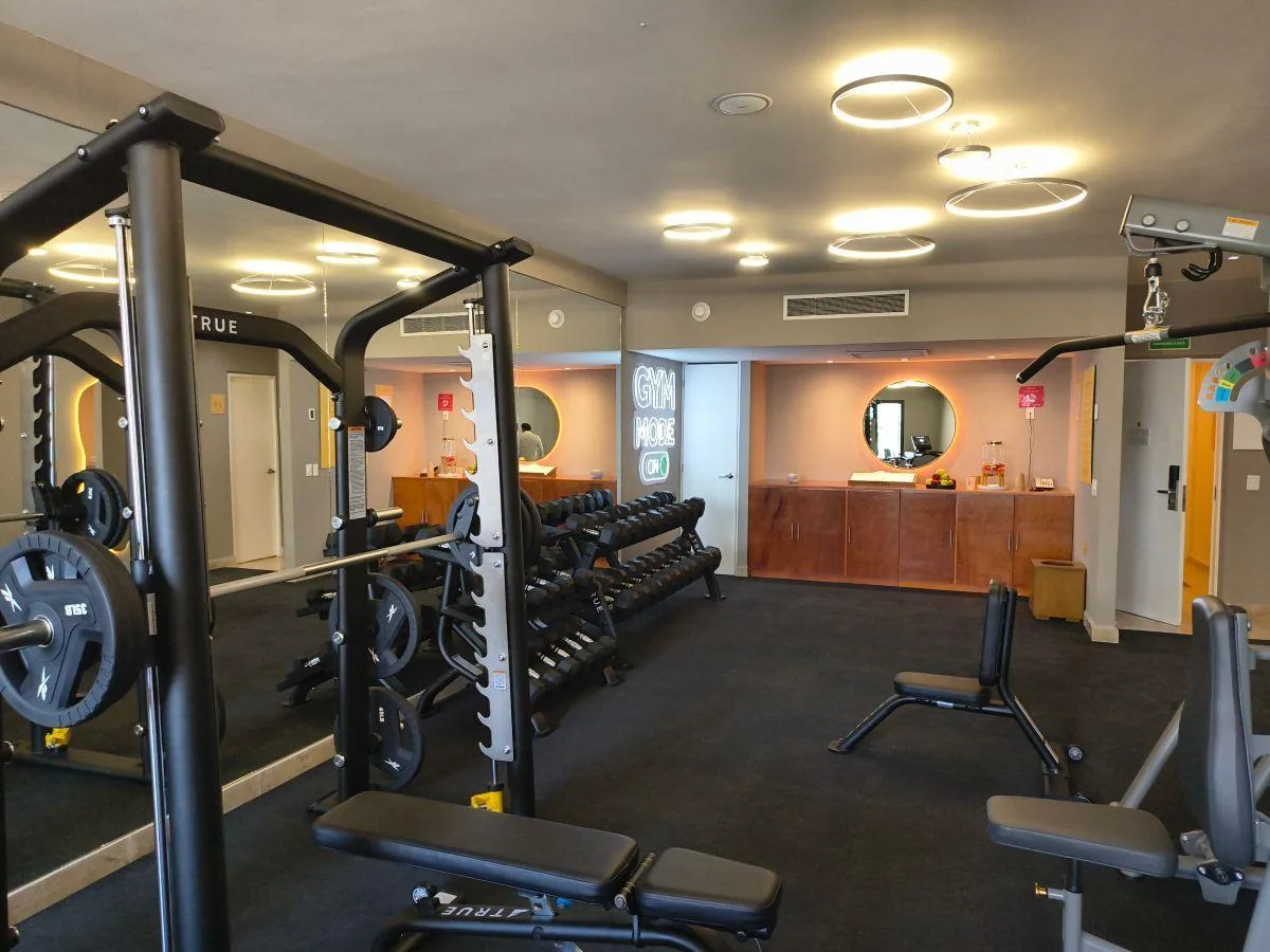 The building offers extensive amenities including a gym, a spa, and a swimming pool. There is a children's water area with slides, a lobby, restaurants, a bar, and a convenience store. The property provides 24/7 security.