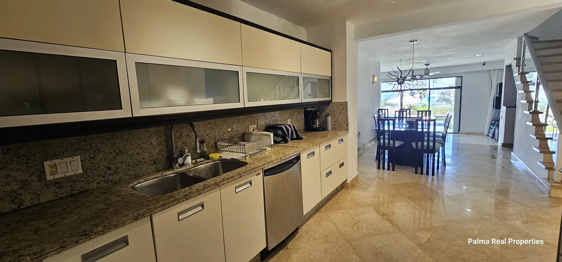 The property features a fully integrated kitchen equipped with marble countertops. The entire floor of the villa is laid with high-grade Italian marble.