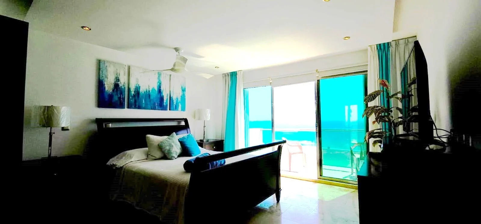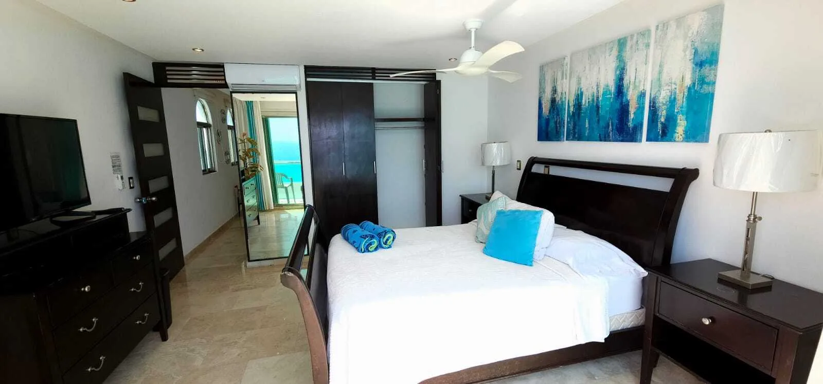 Each bedroom is equipped with air conditioning, drawers, closets, screens, and ceiling fans for comfort. The ocean views from the bedrooms and living room are impressive.