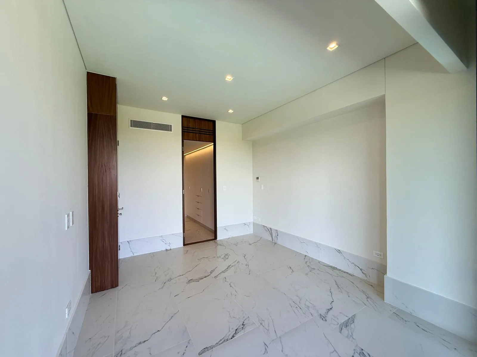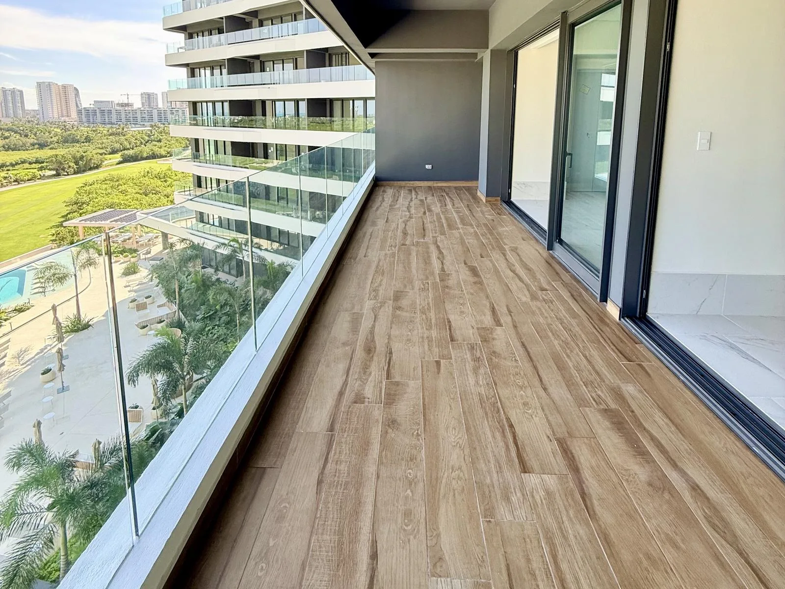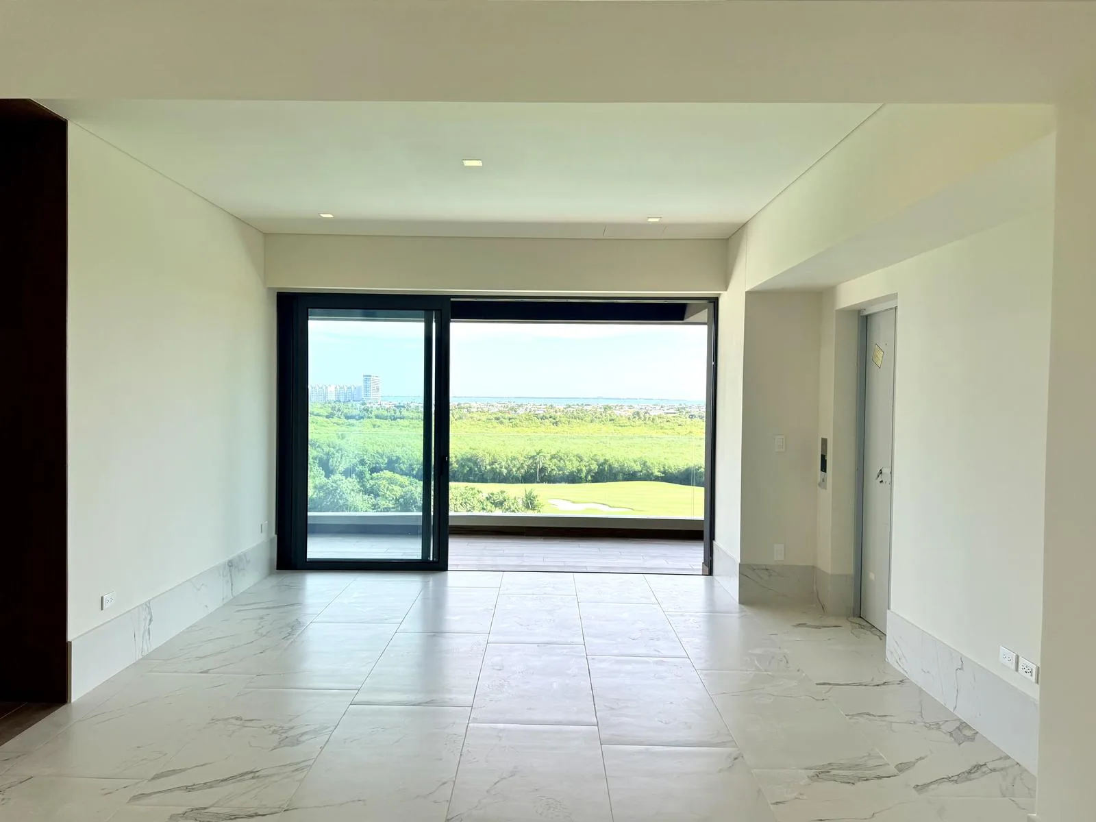 The apartment is unfurnished and includes high-end finishes. It has a white Italian kitchen equipped with a stove, extractor, refrigerator, oven, and microwave, along with a washer-dryer. A very spacious terrace offers front and open views of the golf course and the Caribbean Sea, accessible from both the living room and the master bedroom. The secondary bedroom includes a balcony with a city view.