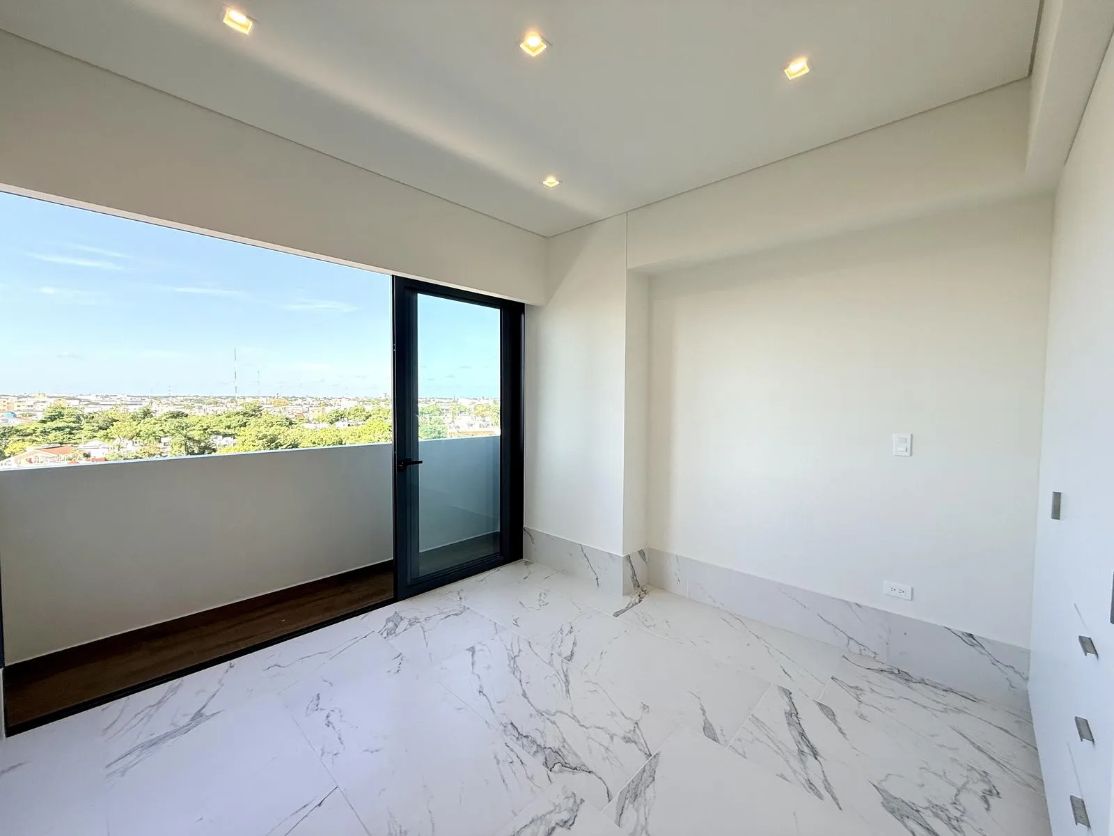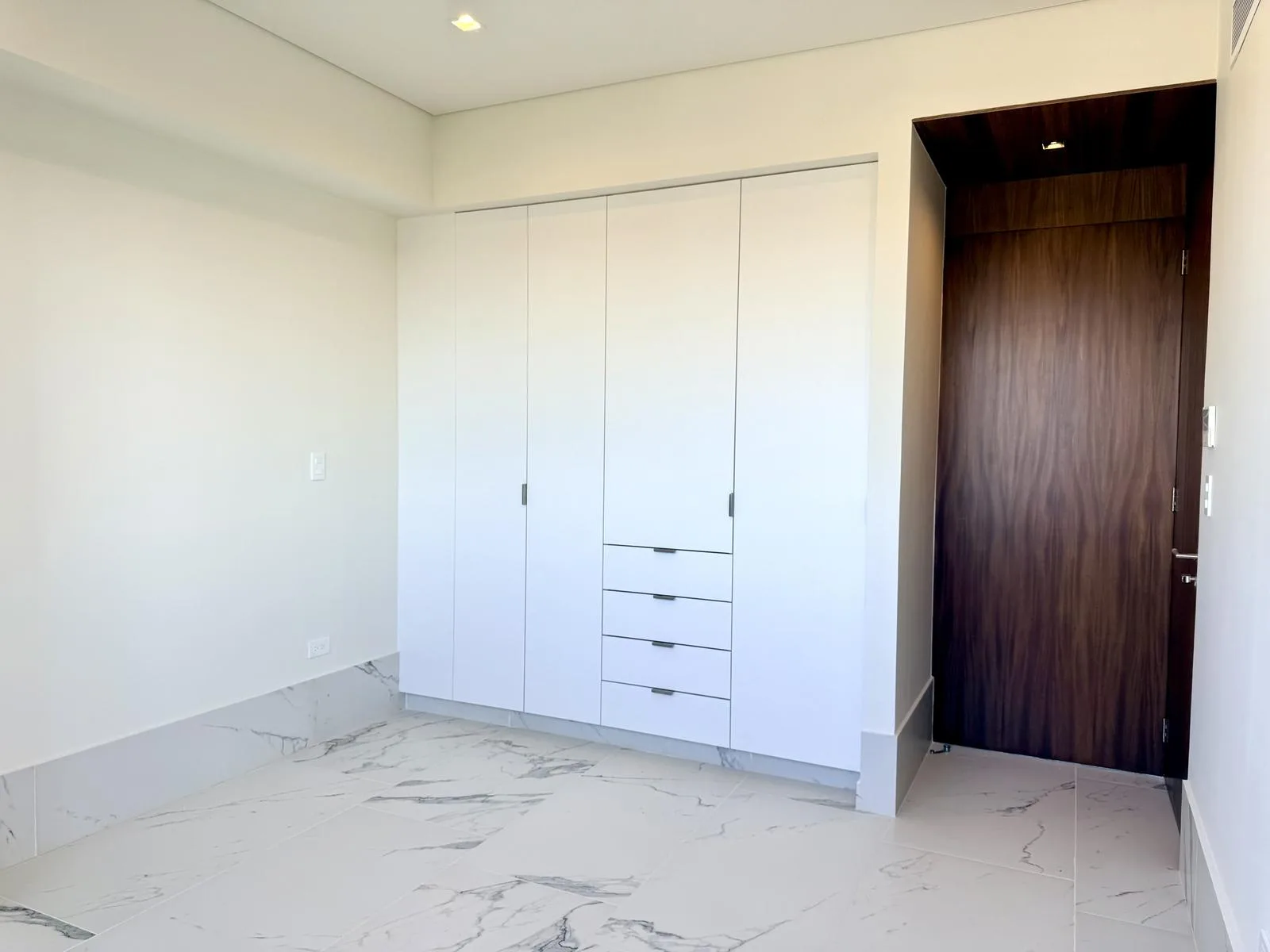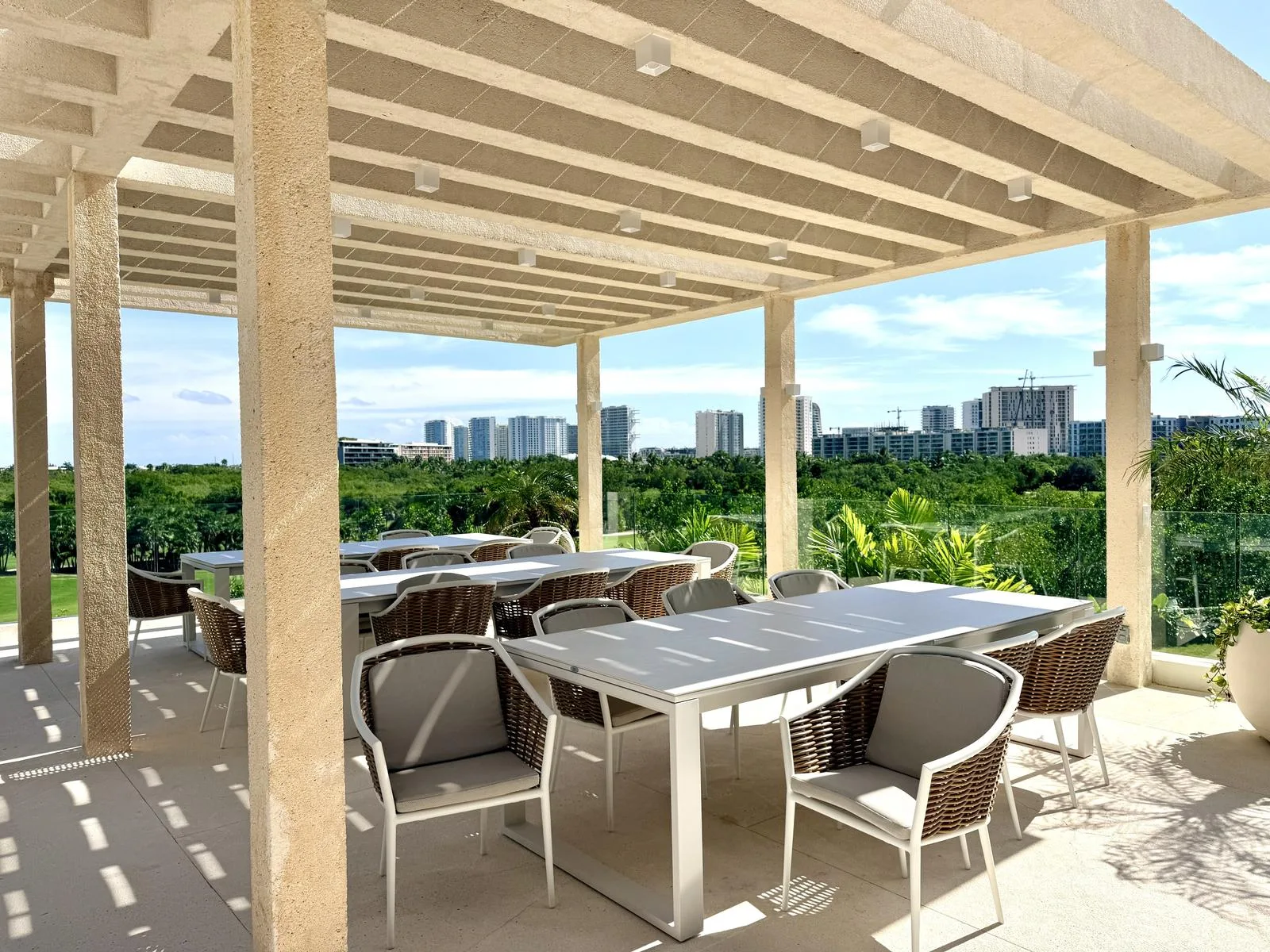 The apartment is unfurnished and includes high-end finishes. It has a white Italian kitchen equipped with a stove, extractor, refrigerator, oven, and microwave, along with a washer-dryer. A very spacious terrace offers front and open views of the golf course and the Caribbean Sea, accessible from both the living room and the master bedroom. The secondary bedroom includes a balcony with a city view.