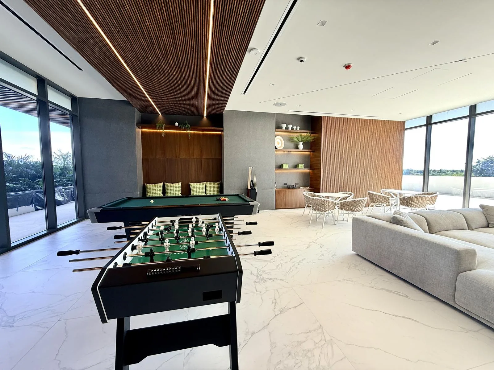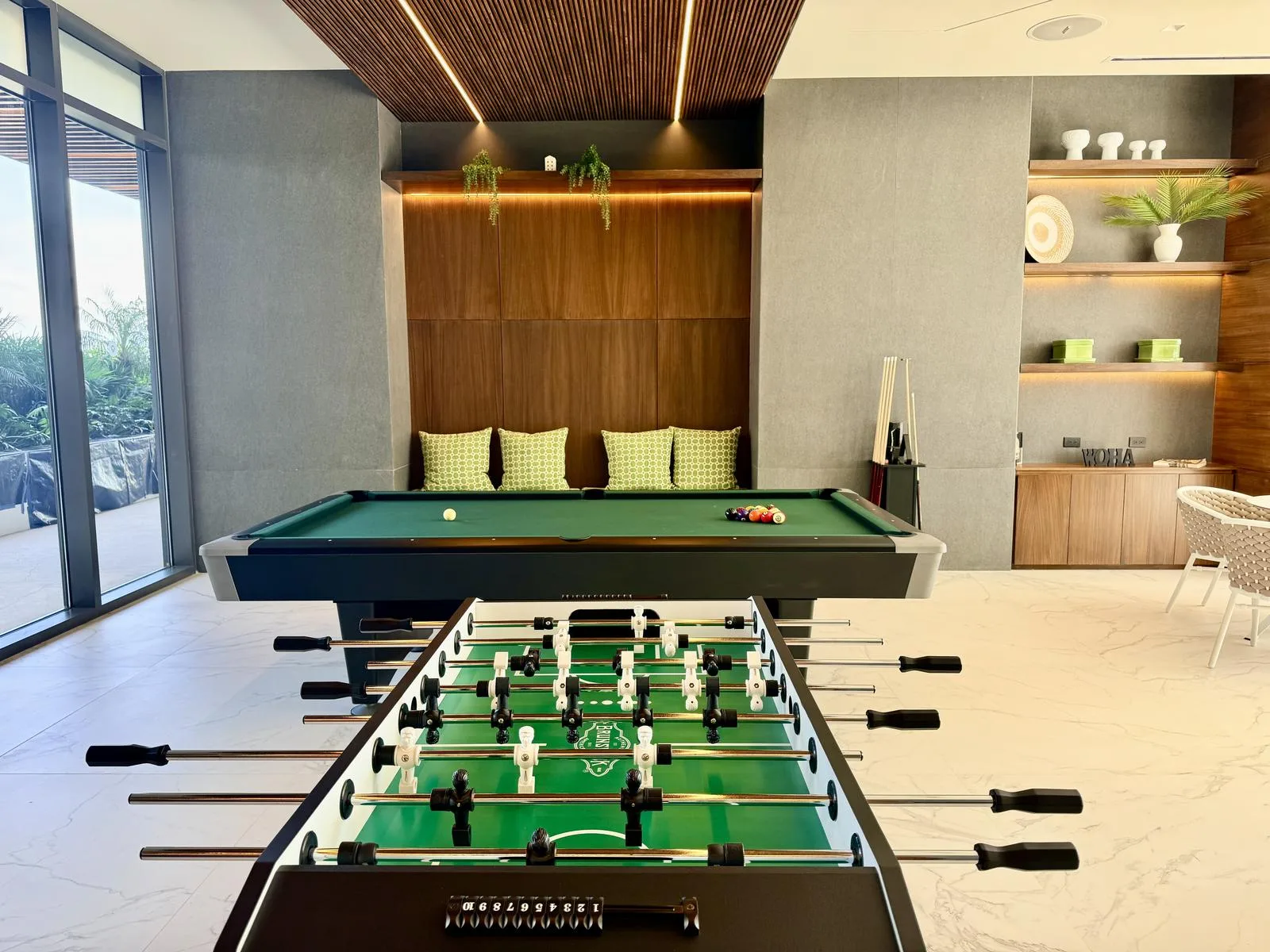Building amenities include 24-hour security, an infinity pool, jacuzzis, a spa, an equipped gym, a sports bar, coworking spaces, a game room, a multi-purpose room, and terraces with views.