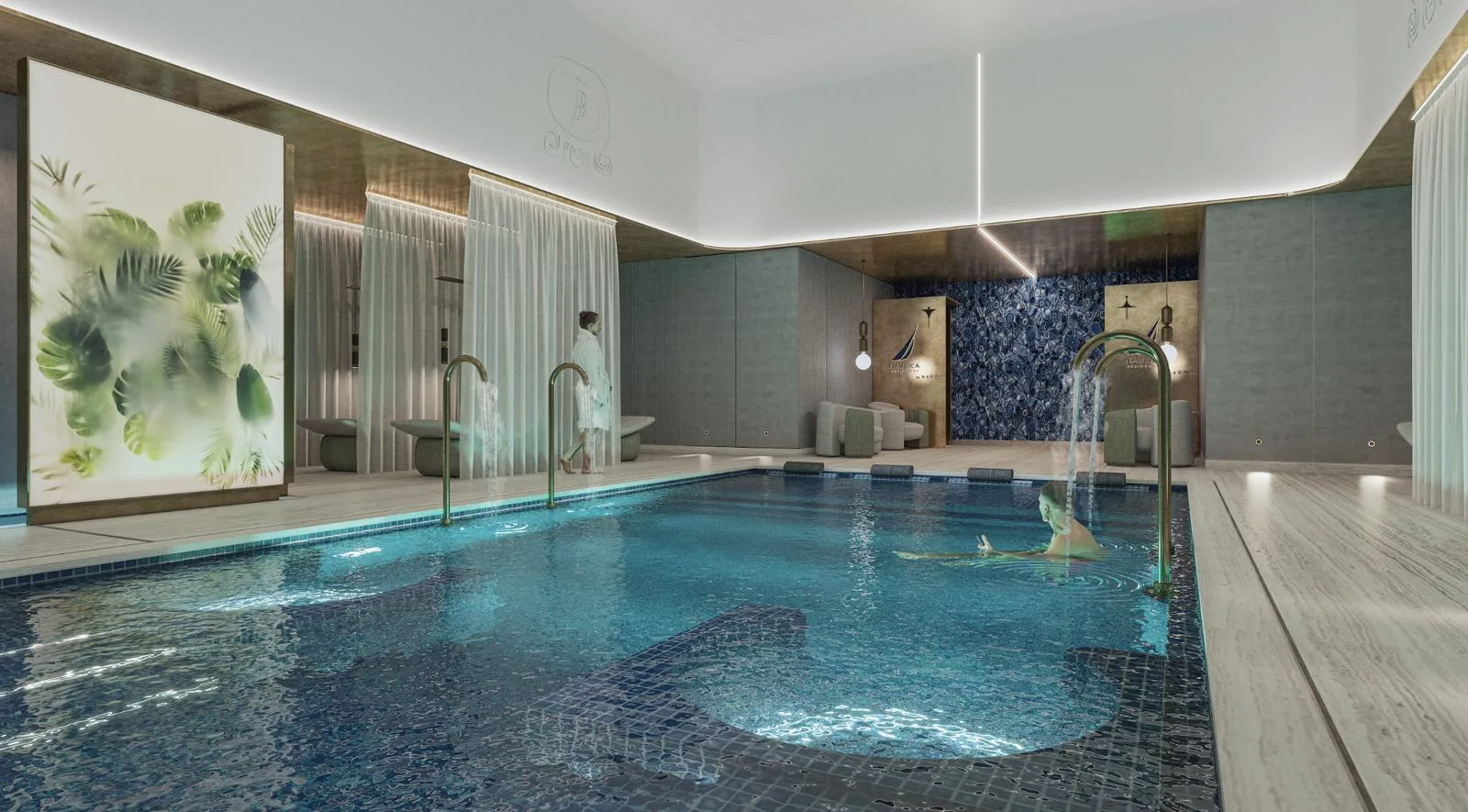Amenities include a wellness center, sports area, private beach club in Costa Mujeres with transportation services, family pool, kids pool, splash zone, aqua slide, hammock bay, spa, beauty salon, barber shop, pet zone, sports bar, sport center, padel court, tennis court, activity hub, mini golf, indoor oasis, playground, piano bar, bistro, marina ballroom, marina deck, cinema lounge, rock climbing wall, arcade, teens club, compass market, coffee corner, co-working space, music hall, media room, kids club, zen studio, fitness center, rooftop lounges, and an infinity pool with bar.