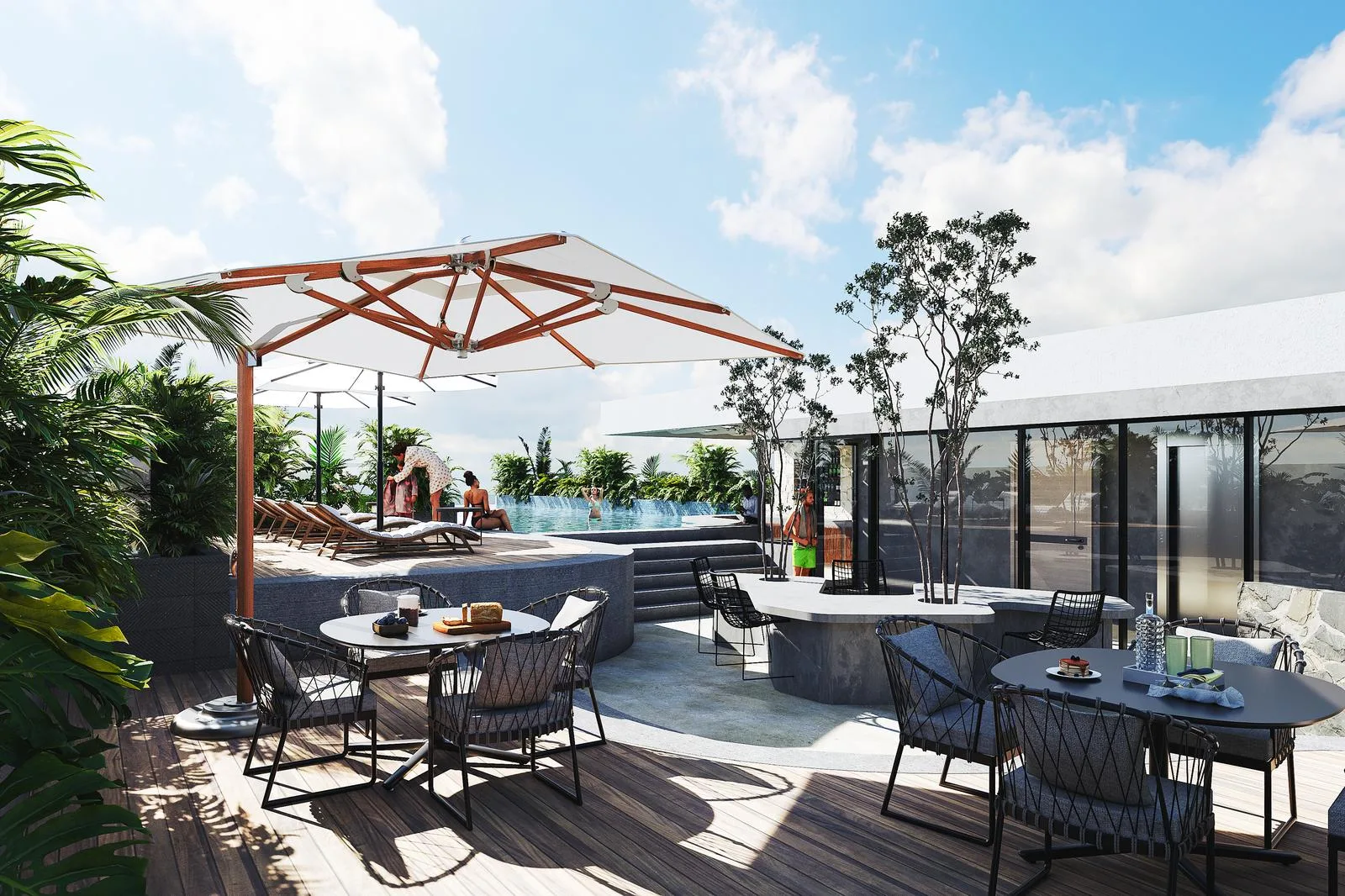 Amenities include a lobby, pool, sun decks, a gym, sun loungers, a bar, a jacuzzi area, fire pits, and a social area.
