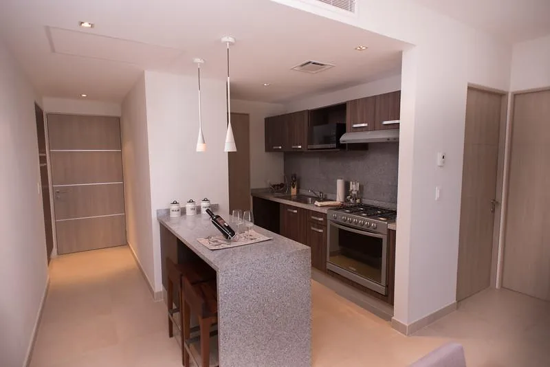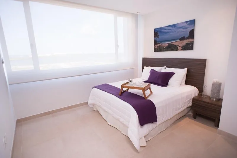 Two-bedroom apartments are available for sale in Torre Cartagena. These residences feature front-facing views of the lagoon and the sea, and are situated on Avenida Bonampak, providing convenient access to Plaza Malecón Américas.
