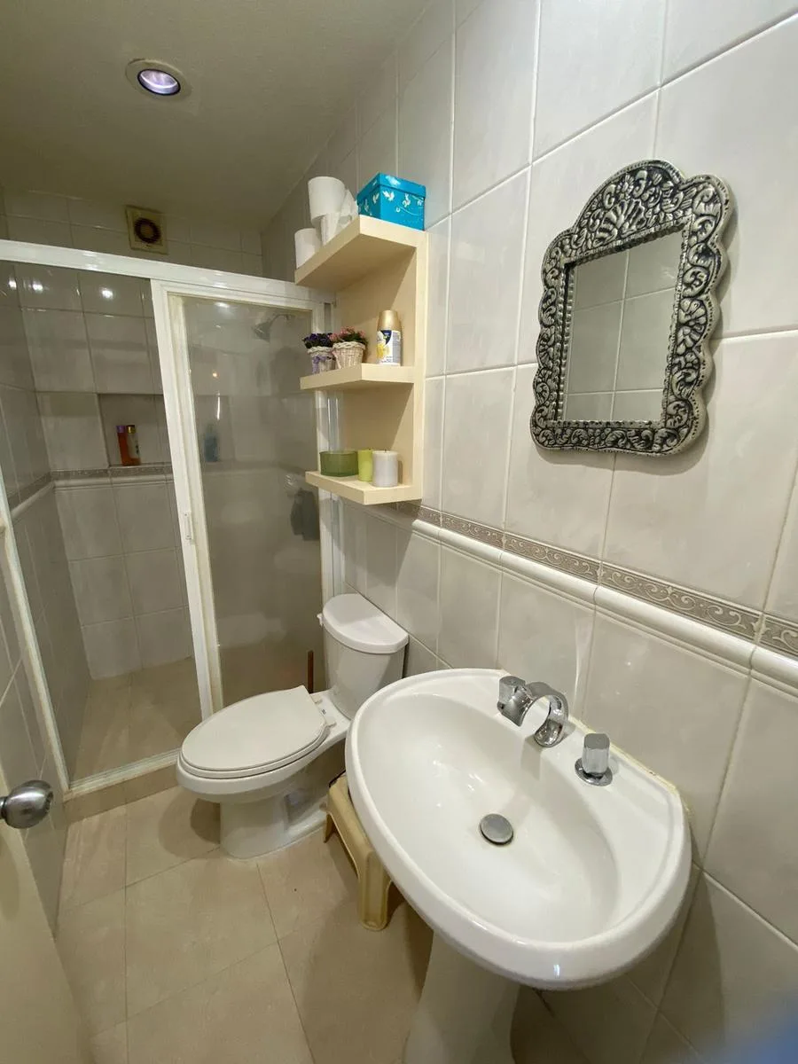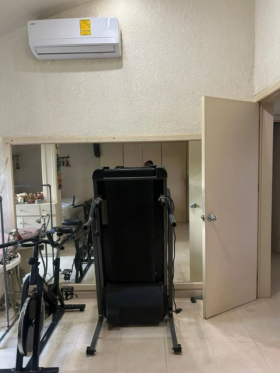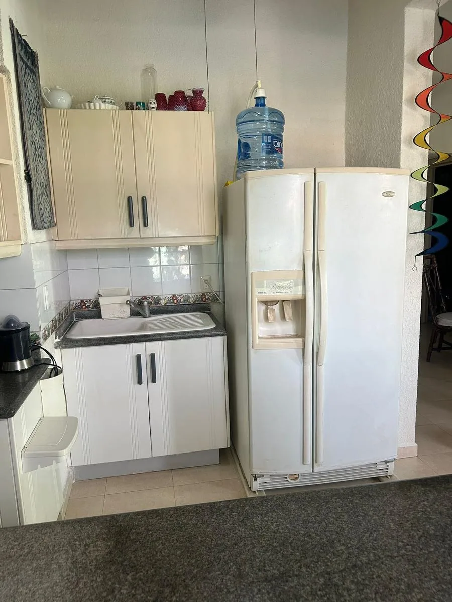 The property includes a fully equipped kitchen and a living-dining room with air conditioning and ceiling fans. It is fitted with anti-cyclone curtains and has a laundry area. The unit has been remodeled for improved functionality and can be sold furnished or unfurnished. It includes two parking spaces.