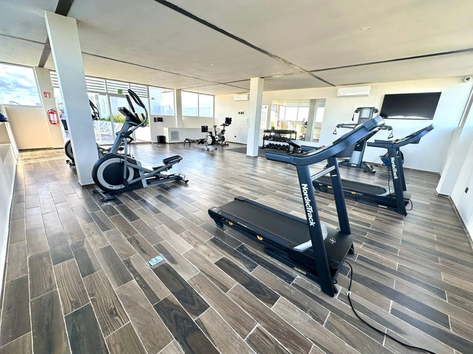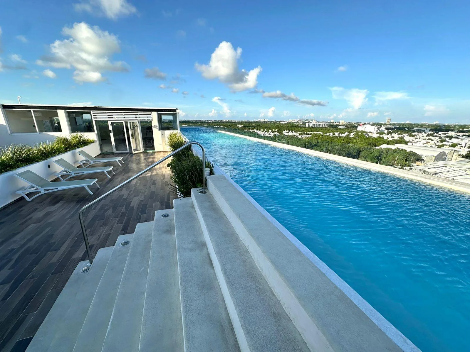 Rooftop amenities consist of a gym, bathrooms, showers, and a sauna. There is a semi-Olympic infinity pool and a grilling area with a pergola and barbecue.