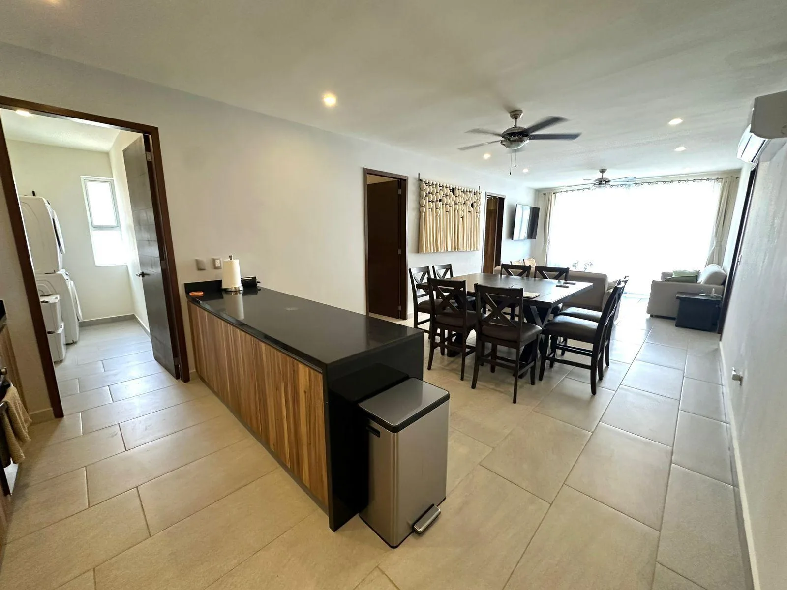 The unit features three bedrooms, each equipped with air conditioning and closets. There are two and a half full bathrooms. The spacious living and dining room area includes air conditioning. The kitchen has a granite island and an open-concept design. The property also includes a laundry area, a linen closet, and a large terrace with views of the building amenities. It comes with two parking spaces and a storage unit.