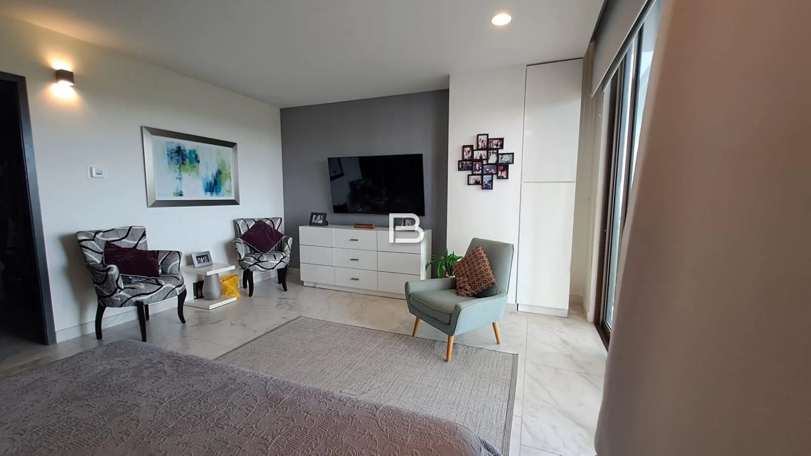 This apartment spans 213 square meters and includes 3 bedrooms and 3 full bathrooms. The master bedroom has a walk-in closet, balcony, and private bathroom. The secondary bedroom includes a walk-in closet and full bathroom. The third bedroom or study features a full bathroom and is suitable for guests or a home office. The unit comes with a fully equipped kitchen, laundry room, spacious living-dining area, and an outdoor terrace with views of the Caribbean Sea and golf course. It is located in Tower C, which offers optimal orientation and privacy within the complex.