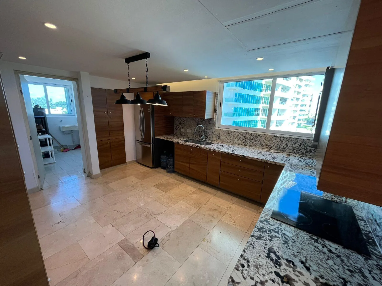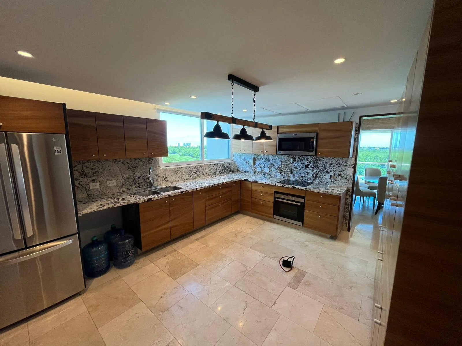 The layout includes three bedrooms with walk-in closets, the primary suite featuring a private bathroom. There are three full bathrooms in total. The residence comprises a living and dining room with expansive windows, a fully equipped kitchen, a service room, and a laundry room.