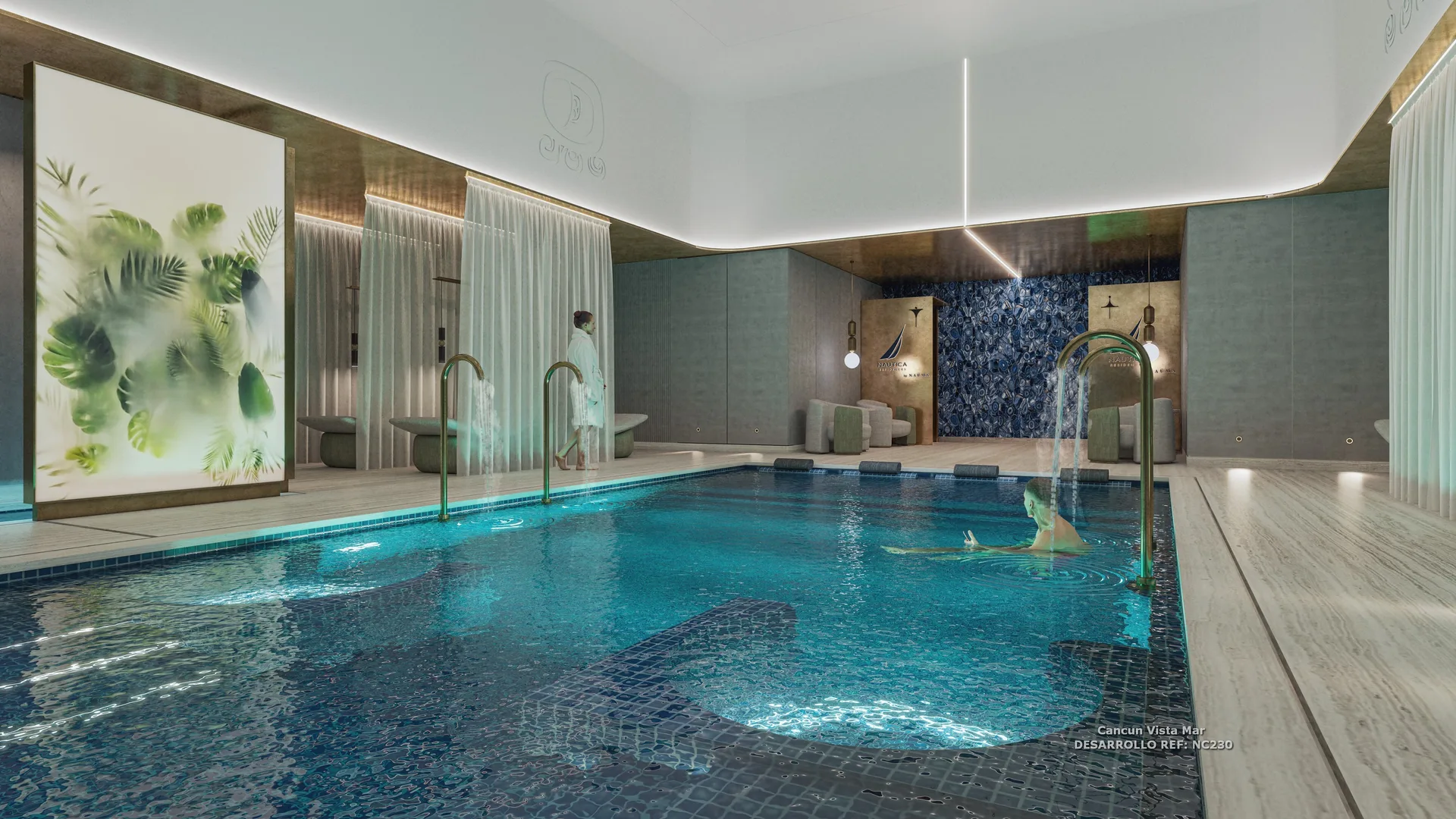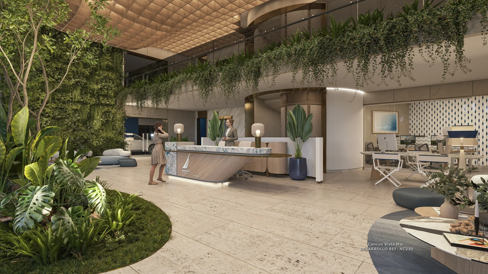 The surrounding development features two modern towers within a serene natural setting near the Nichupté Lagoon. It offers connectivity to downtown Cancun, the airport, and the Hotel Zone.