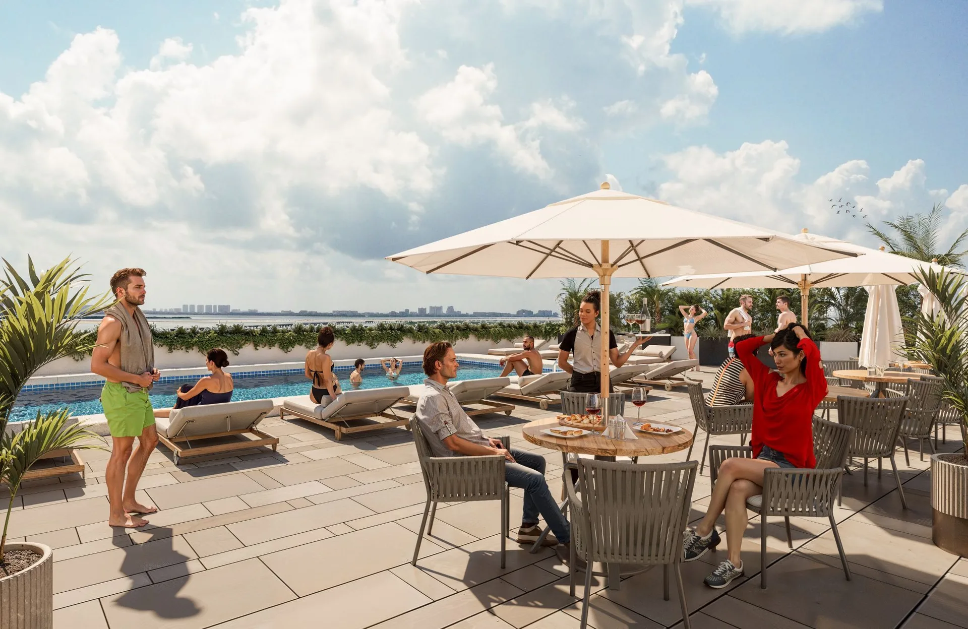 This contemporary apartment is under pre-construction in the Las Americas Zone of Cancun, Quintana Roo, Mexico. It features panoramic views of the sea, jungle, and city from a private balcony.