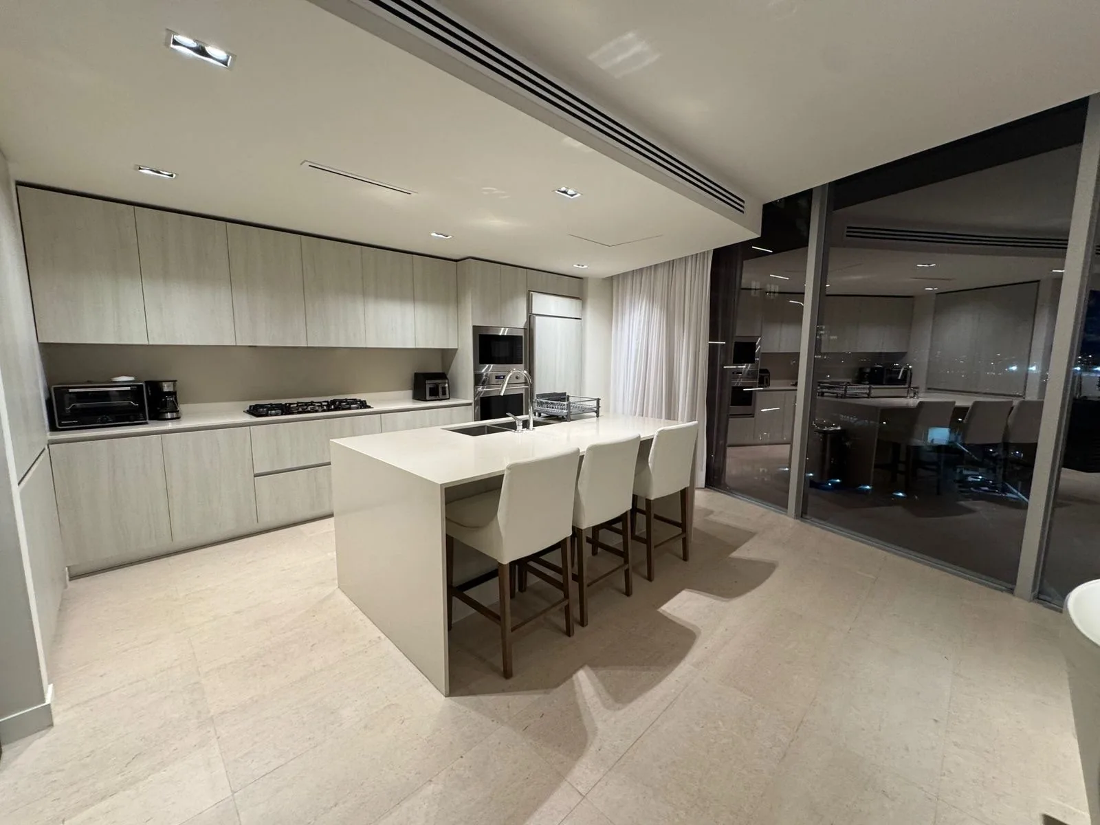 A terrace offers panoramic sea views. The residence features three bedrooms, each with an ensuite bathroom, and a half guest bathroom.