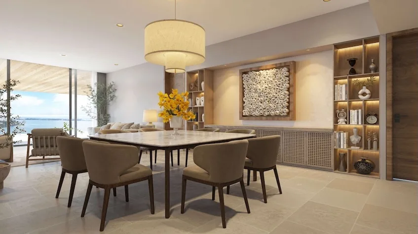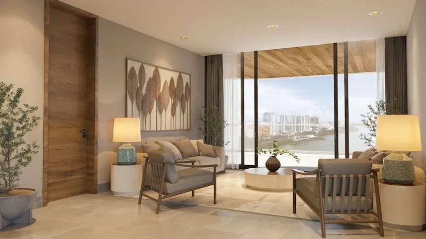 The available residences reflect a timeless design focused on comfort. The 2-bedroom apartment features open spaces with fluid transitions, a designer kitchen with finishes in natural materials, a primary bedroom with panoramic views and an en-suite bathroom, and a private terrace. The 3-bedroom apartment offers expansive social areas, three bedrooms with premium finishes and walk-in closets, and seamless integration between interiors and outdoor terraces. Both unit types offer views of either the Caribbean Sea or the Nichupté Lagoon.