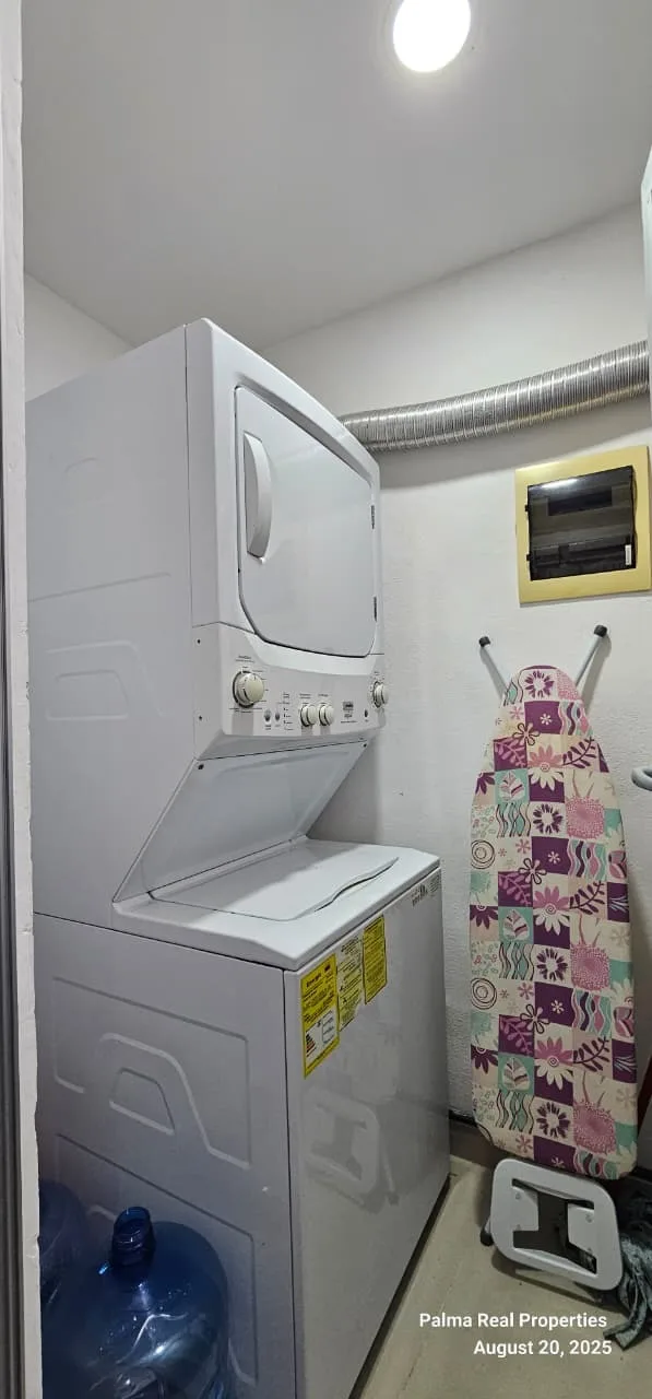 The residence features an open-concept living and dining room layout. It includes two spacious and bright bedrooms and two full bathrooms with modern finishes. The kitchen is fully equipped. A designated parking space is included, and there is a separate laundry area.