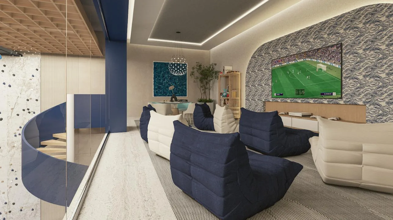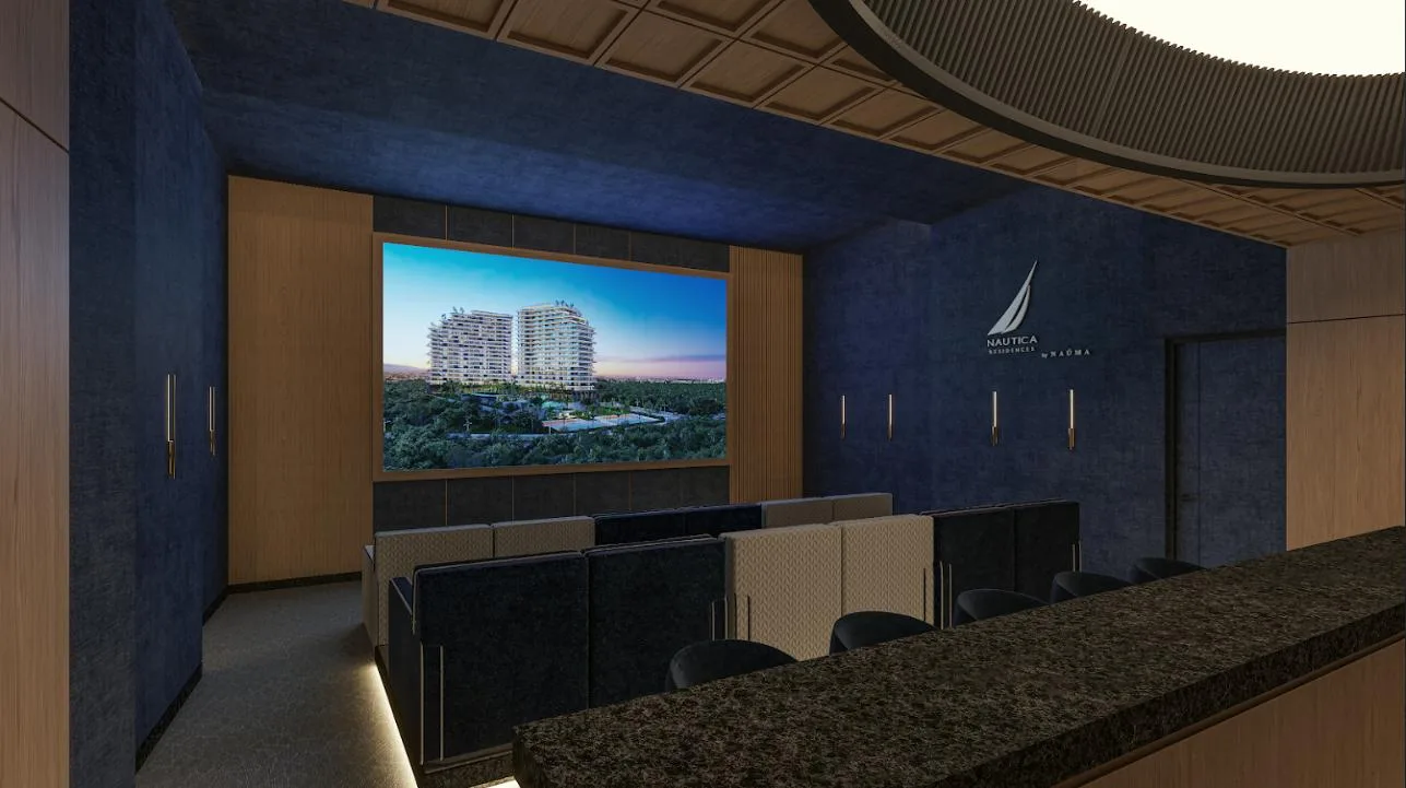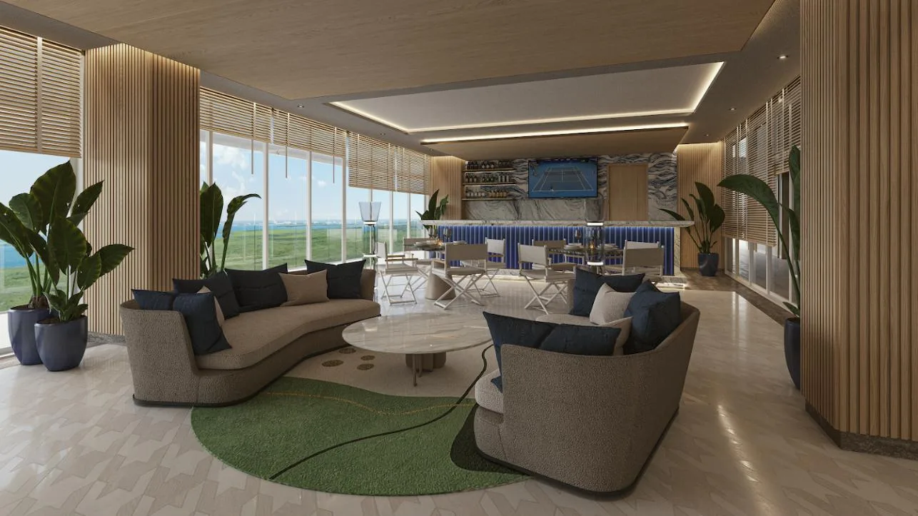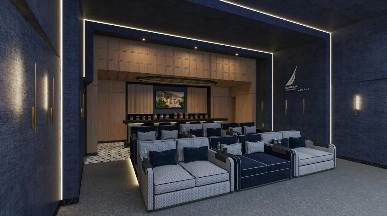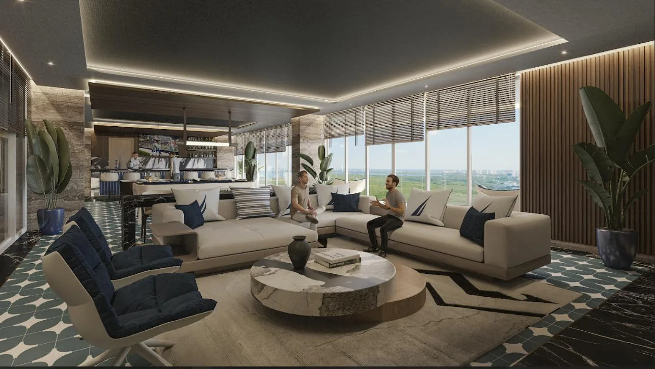 The apartment is part of a complex with two 20-level towers. The development provides over 50 amenities, including a private beach club, a wellness center and spa, and a sports area with paddle, tennis, and mini golf courts. Family and children's pools feature a Splash Zone and Aqua Slide. Additional amenities include a sports bar, cinema lounge, teens club, co-working spaces, a media room, and music hall. The complex also offers a pet zone, barber shop, kids club, restaurants, a piano bar, roof lounges, a marina deck, and an event hall. A high-security environment is maintained, and the location provides strategic connectivity to schools, shopping centers, and city services.