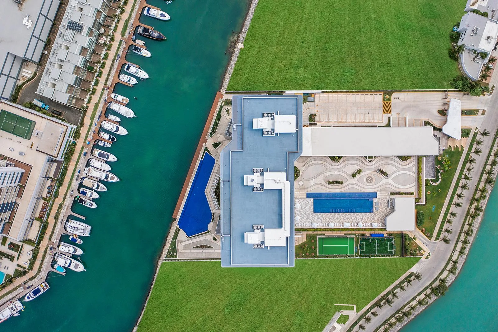 The residence offers premium amenities including a private marina, a world-class spa, a kids club, a semi-Olympic swimming pool, an infinity pool, a rooftop with panoramic views, a pool bar, paddle tennis courts, and access to the dock and lagoon.