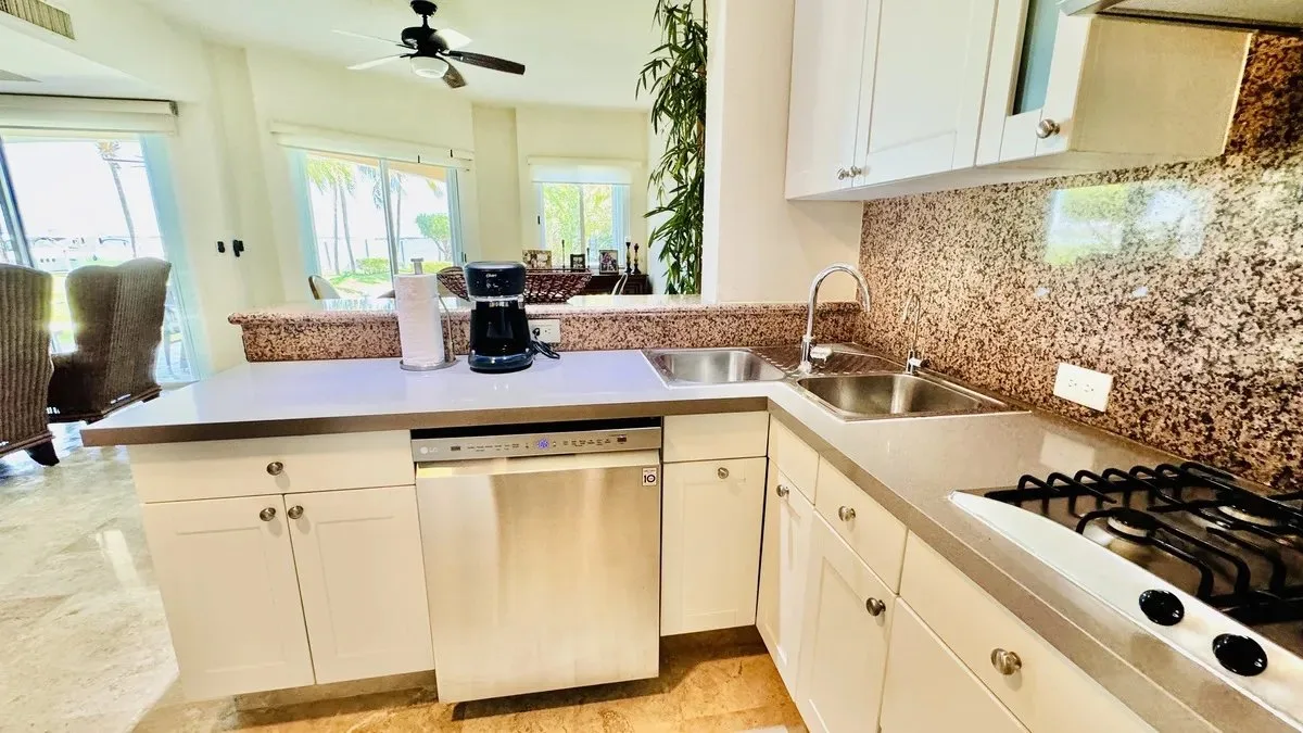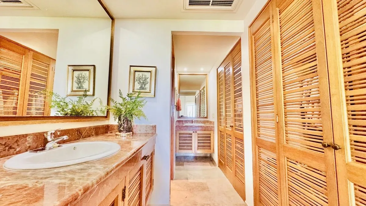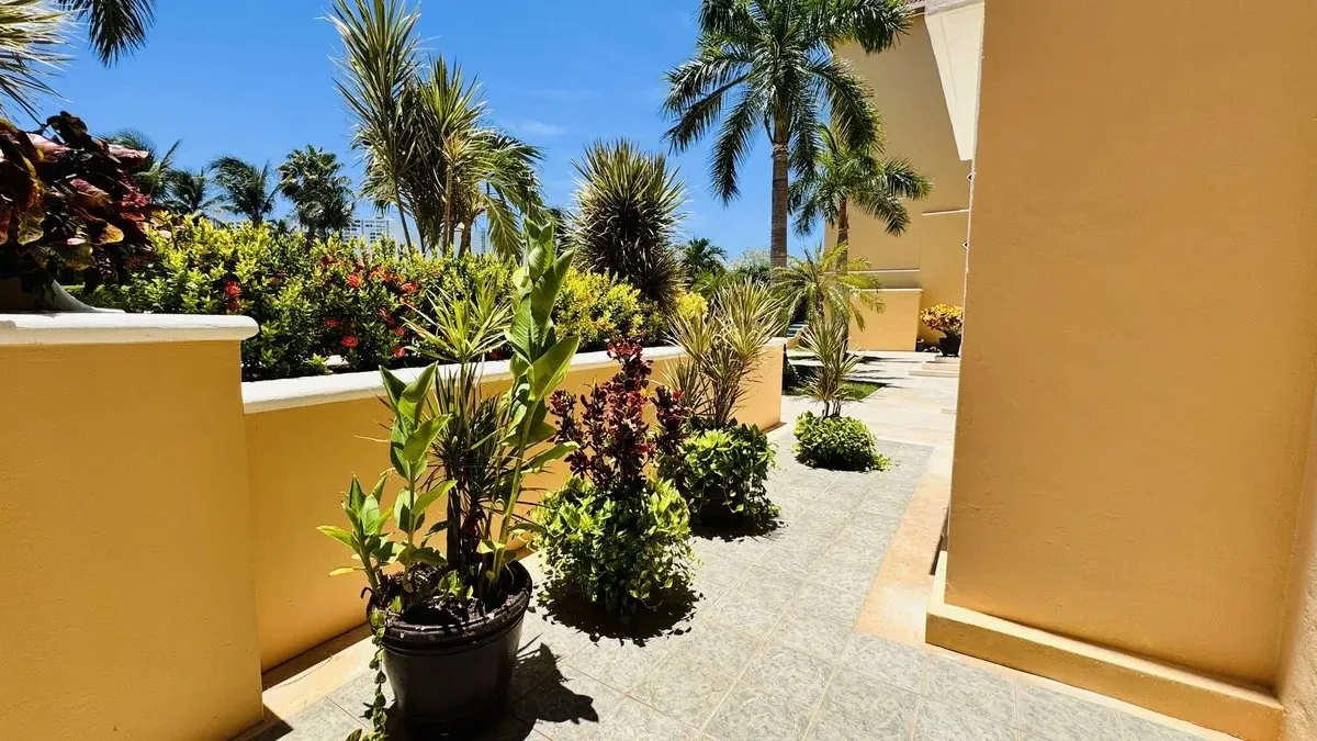The residence spans 252 square meters of carefully designed space. It features a private boat slip capable of accommodating yachts up to 60 feet in length. The unit includes three spacious bedrooms, each with its own bathroom and ample closet space. The primary bedroom offers views of both the garden and the lagoon.